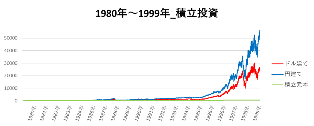 画像は「1980年~1999年」の期間におけるドル建てと円建てのS&P500の3倍レバレッジのチャートになります。
