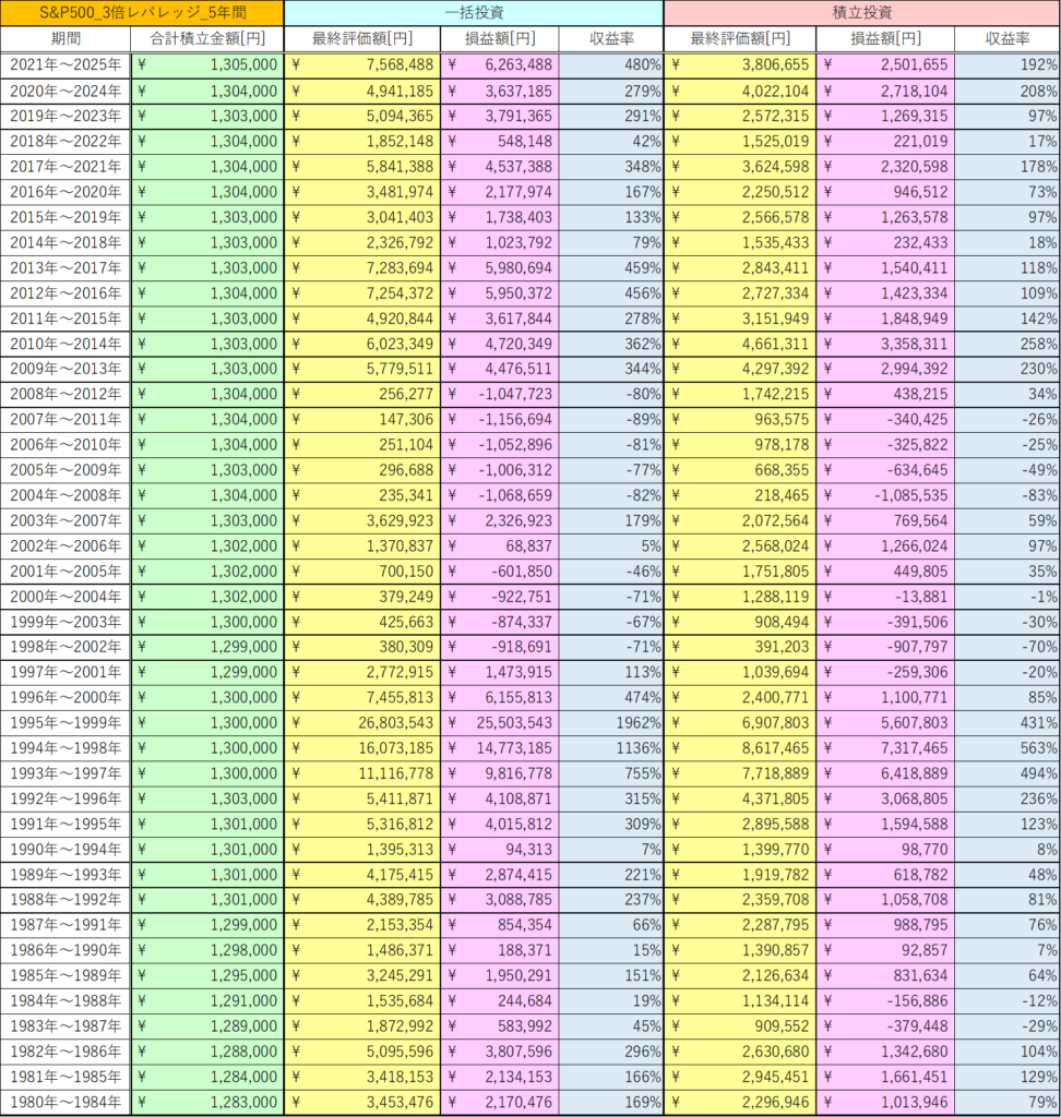 S&P500の3倍レバレッジの5年間という投資期間において、