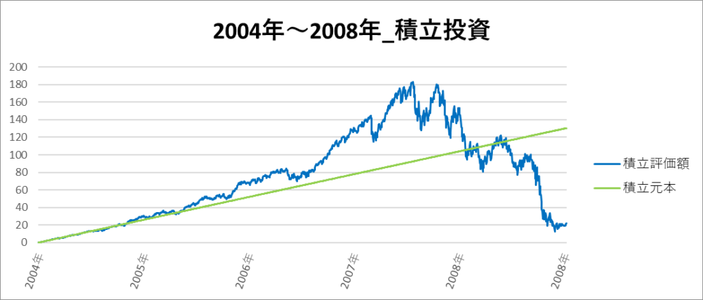 積立投資の一番リターンの低い期間は「2004年~2008年」でした。