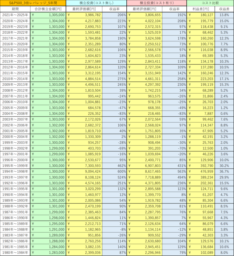 今回は、コストが利益にどれくらい影響を与えるのかを知ってもらうために3倍レバレッジを5年間の投資運用でどれだけの差が出るかを完全シミュレーションしました。