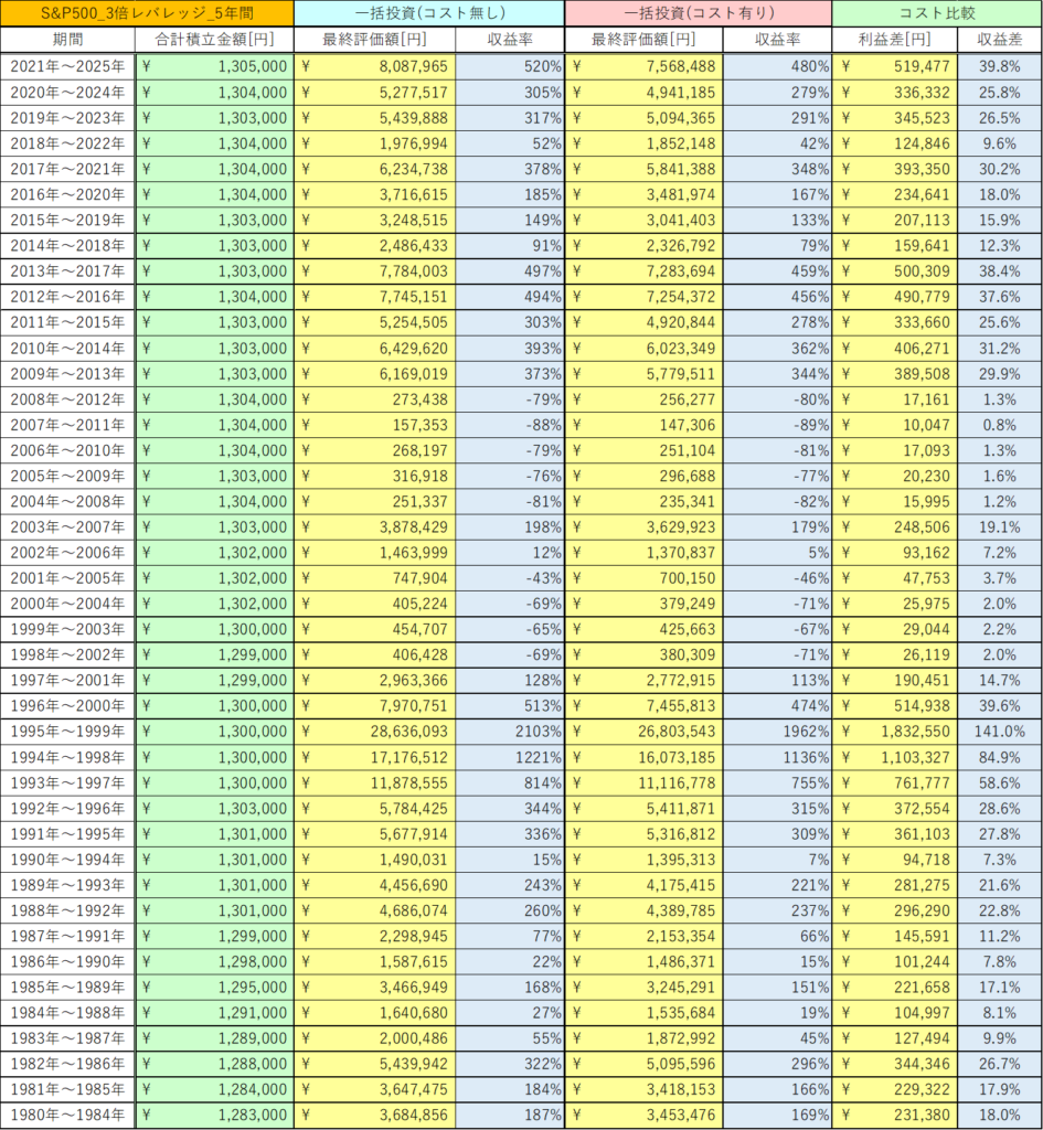 今回は、S&P500 3倍レバレッジの5年間の積立投資と一括投資におけるコストの影響を検証しました。