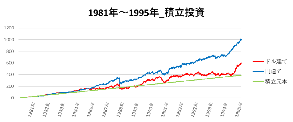 画像は「1981年~1995年」の期間におけるドル建てと円建てのS&P500のチャートになります。