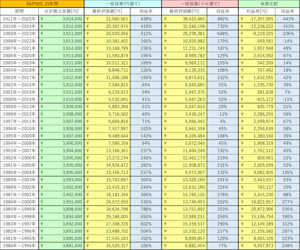 今回は、S&P500の15年間の積立投資と一括投資における為替の影響を検証しました。
