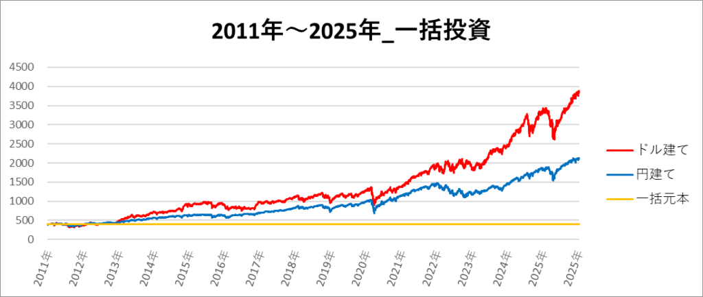 画像は「2011年~2025年」の期間におけるドル建てと円建てのS&P500のチャートになります。