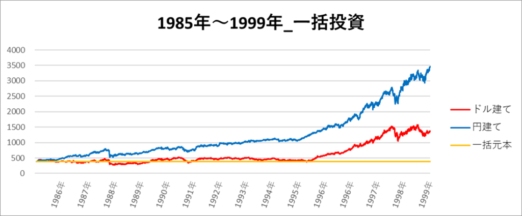画像は「1985年~1999年」の期間におけるドル建てと円建てのS&P500のチャートになります。