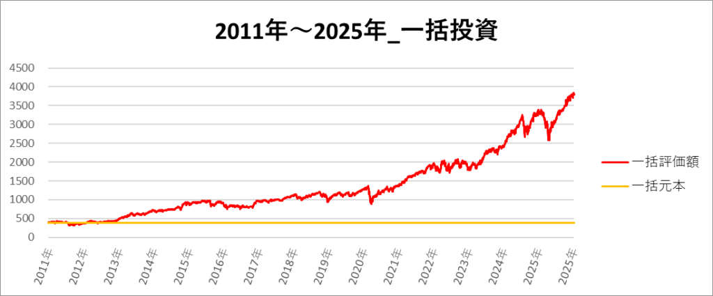 一括投資の一番リターンの高い期間は「2011年~2025年」でした。
