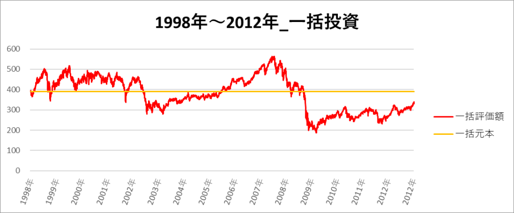 一括投資の一番リターンの低い期間は「1998年~2012年」でした。
