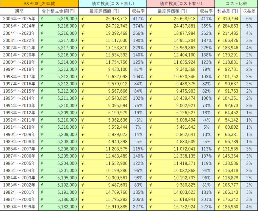 20年間の積立投資では、最大で319,794円もコストで取られていることが分かります。