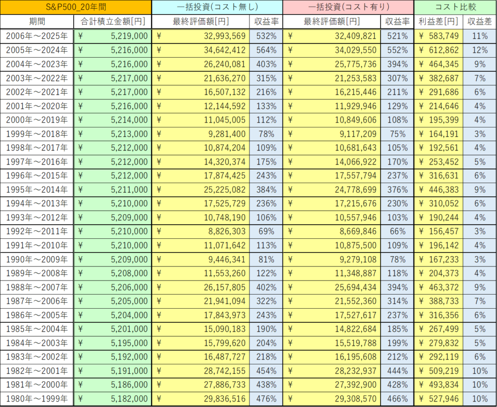 20年間の一括投資では、最大で621,862円もコストで取られていることが分かります。
