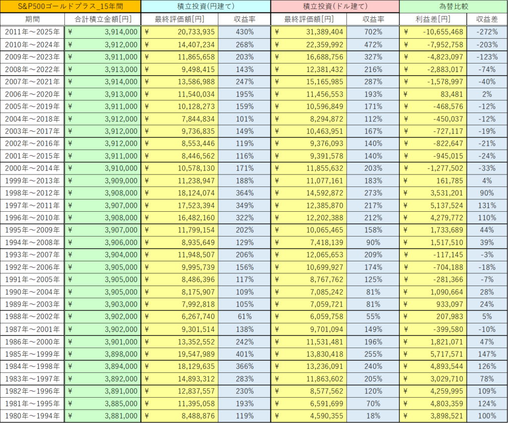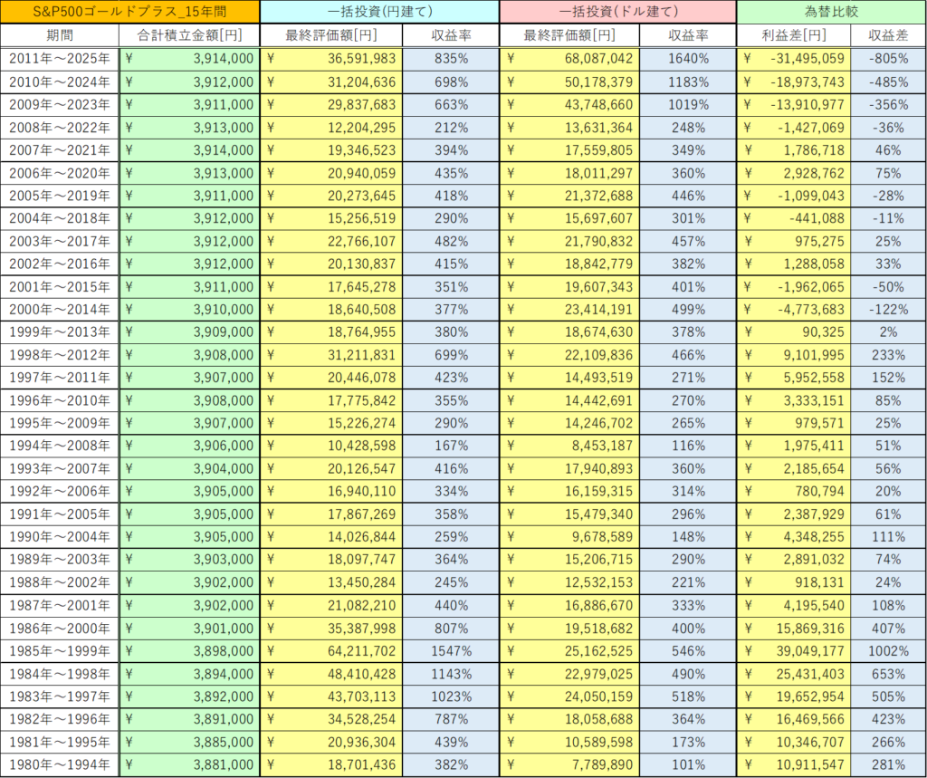 今回は、S&P500ゴールドプラスの15年間の積立投資と一括投資における為替の影響を検証しました。