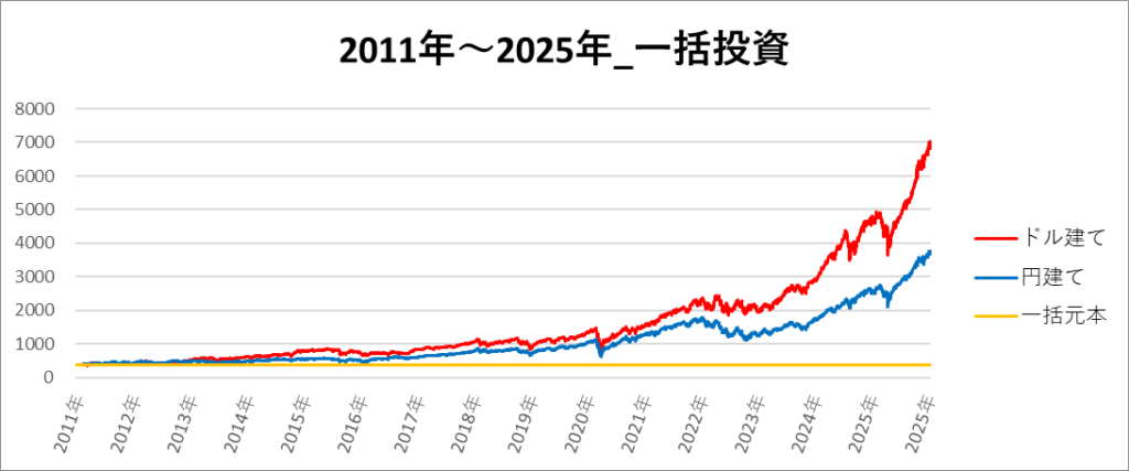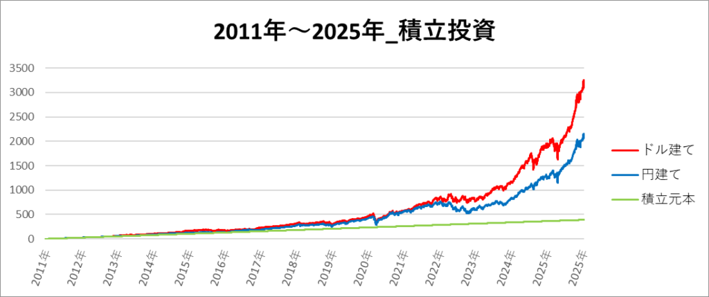 この期間は、2020年ごろから円建てとドル建てのリターンの差が開き、最終的に円建ての方が高リターンになっています。