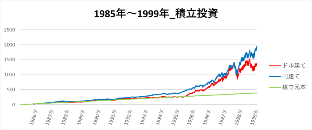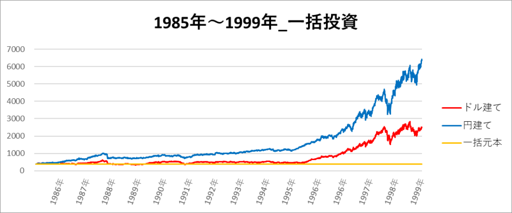 このチャートは、1986年ごろから円建てとドル建てのリターンの差が開き、最終的に円建ての方が約4,000万円も利益が多くなっています。