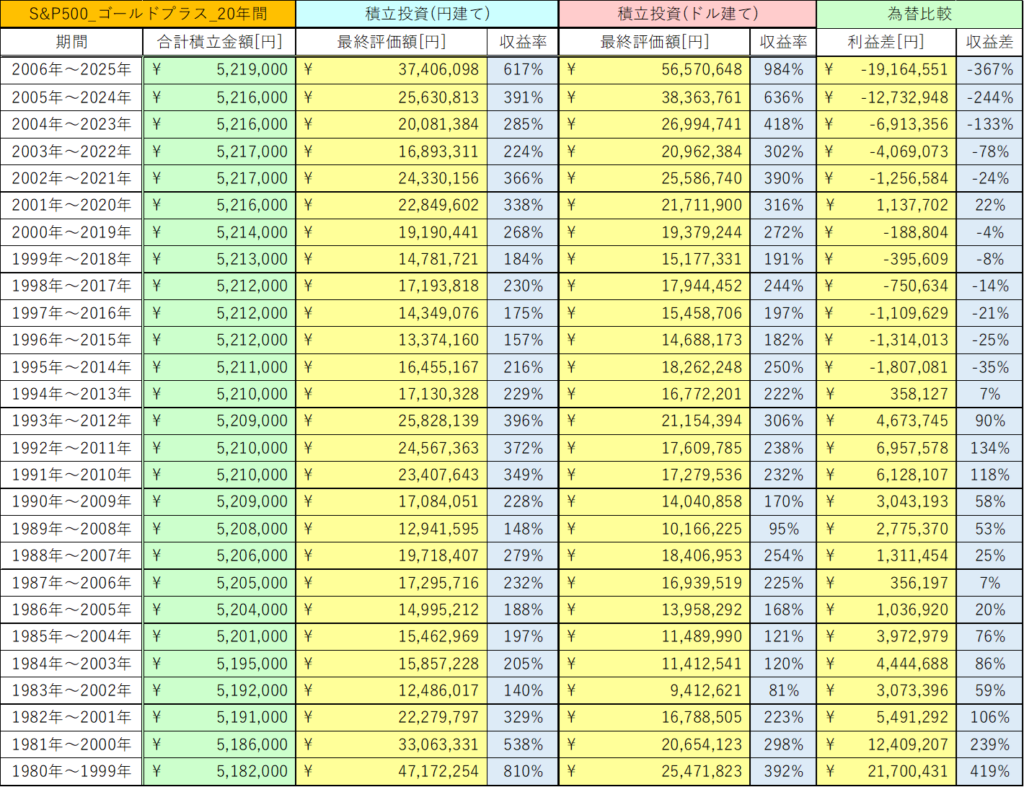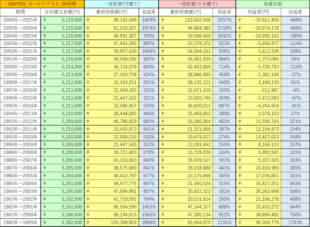今回は、S&P500ゴールドプラスの20年間の積立投資と一括投資における為替の影響を検証しました。