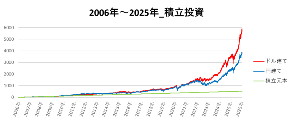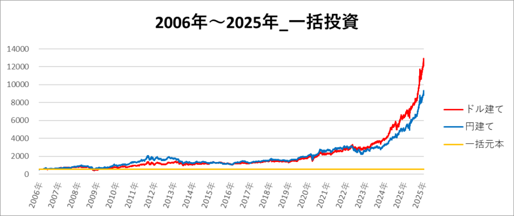 画像は「2006年~2025年」の期間におけるドル建てと円建てのゴールドのチャートになります。