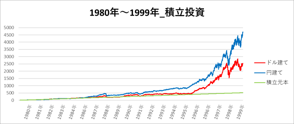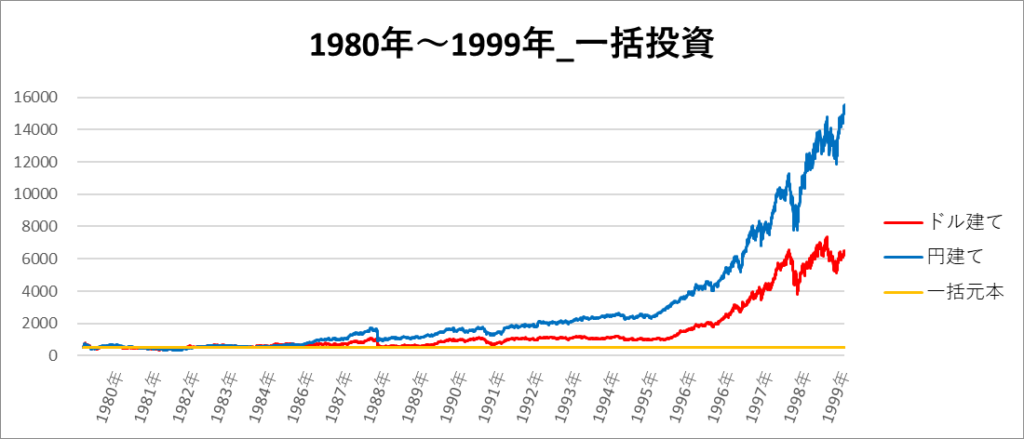 このチャートは、1987年ごろから円建てとドル建てのリターンの差が開き、最終的に円建ての方が約9,000万円も利益が多くなっています。
