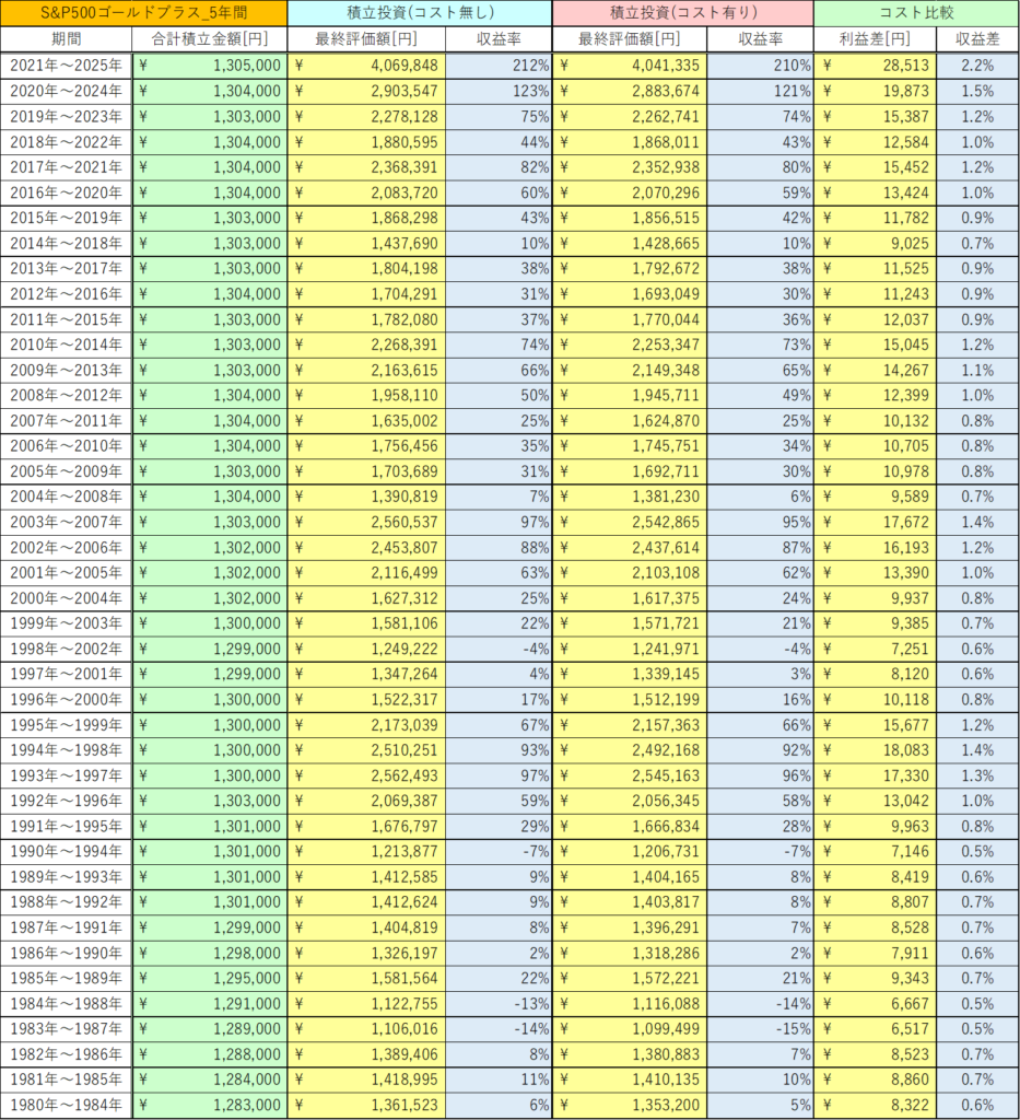 【検証】S&P500ゴールドプラスを5年運用するとコストでいくら差が出る?0%と0.1991%を徹底比較