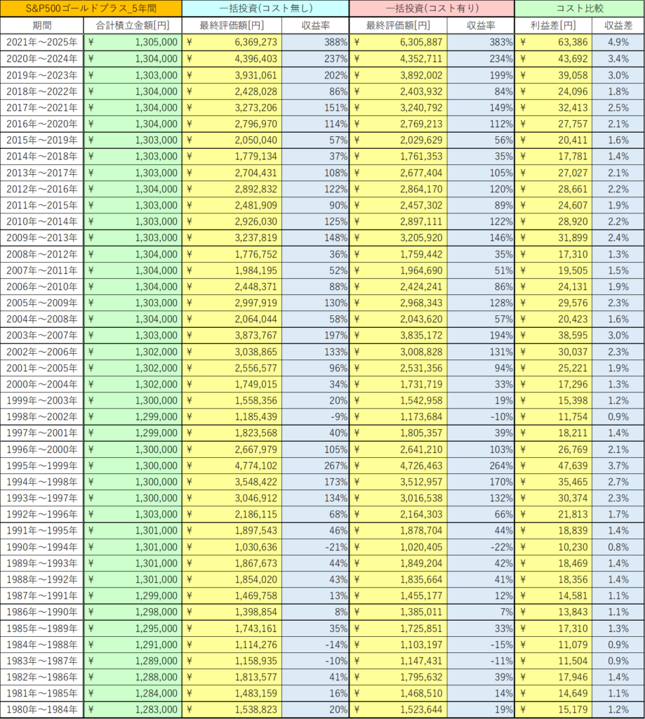 今回は、S&P500ゴールドプラスの5年間の積立投資と一括投資におけるコストの影響を検証しました。