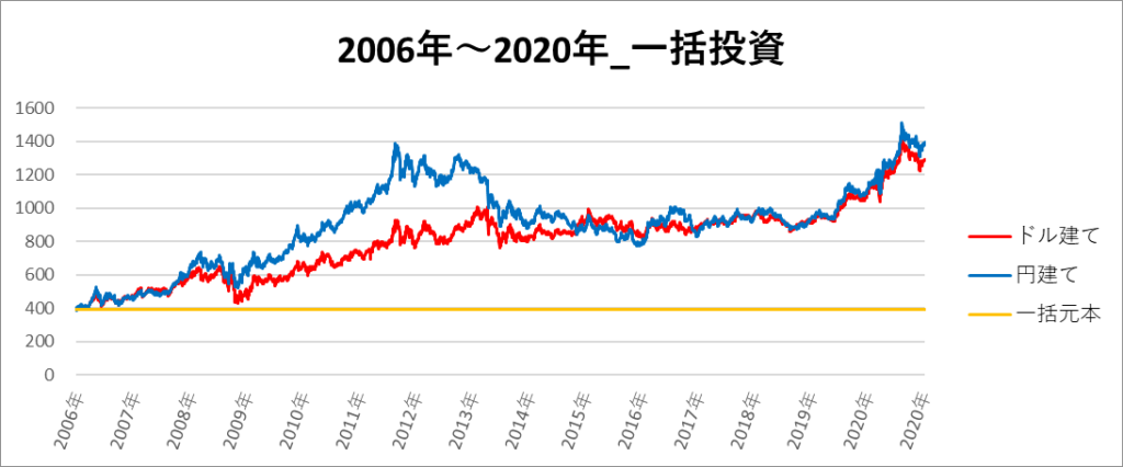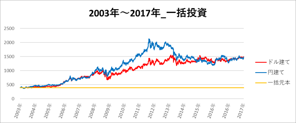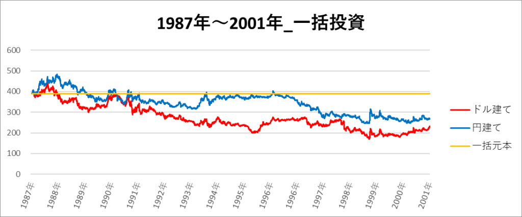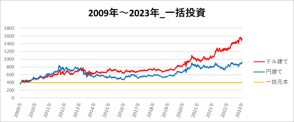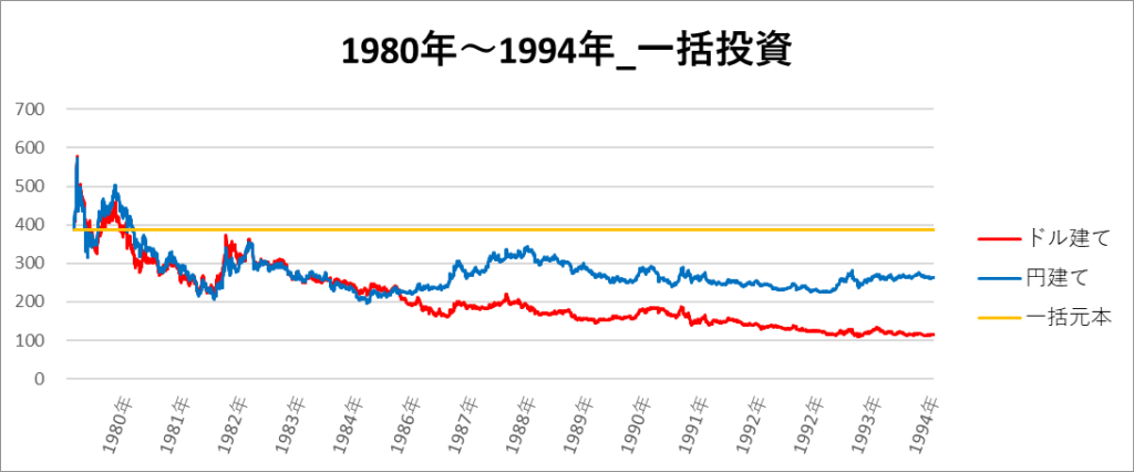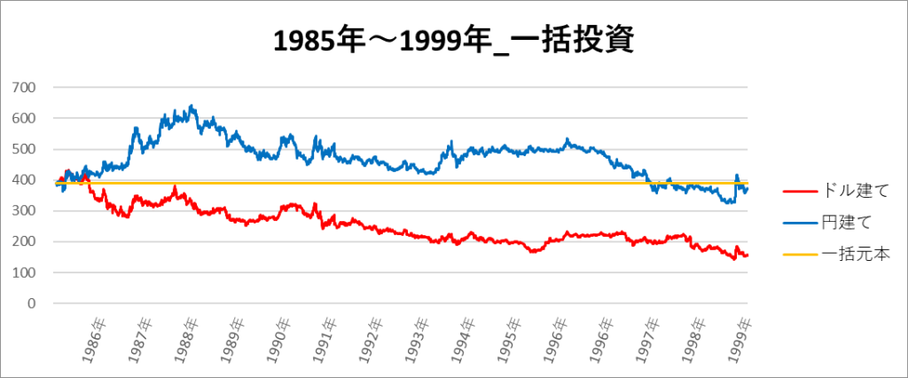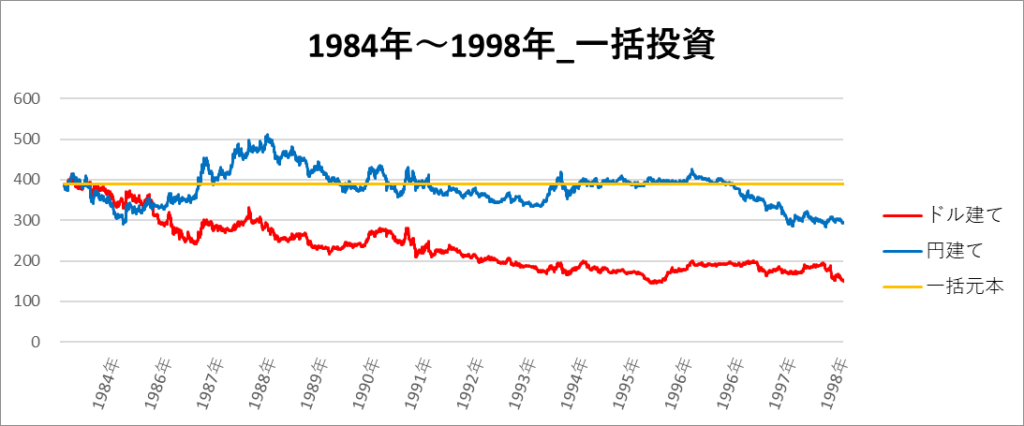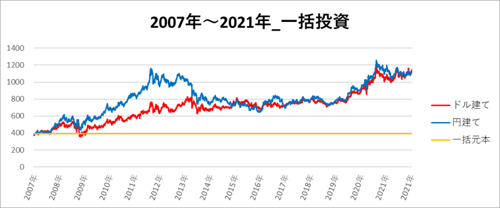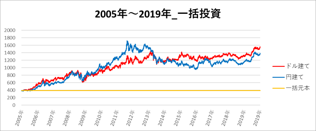 円建てとドル建ての2パターンを比較できるようにグラフに表記しているので、見比べて見てください。