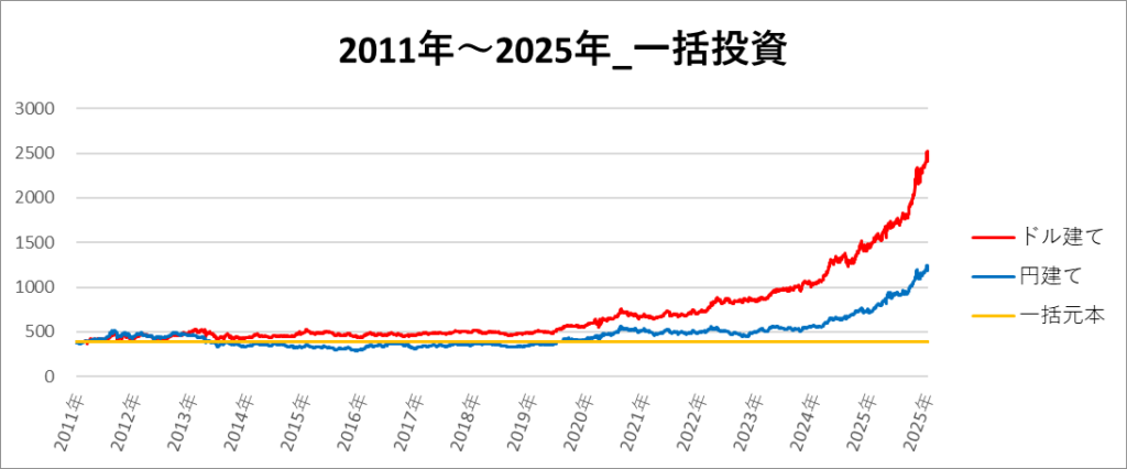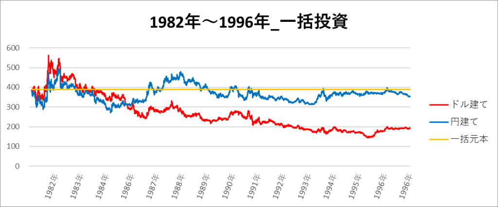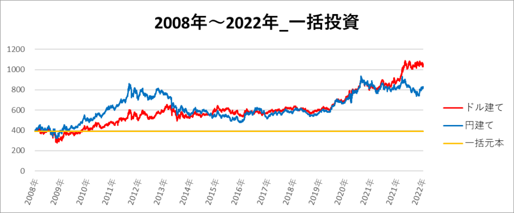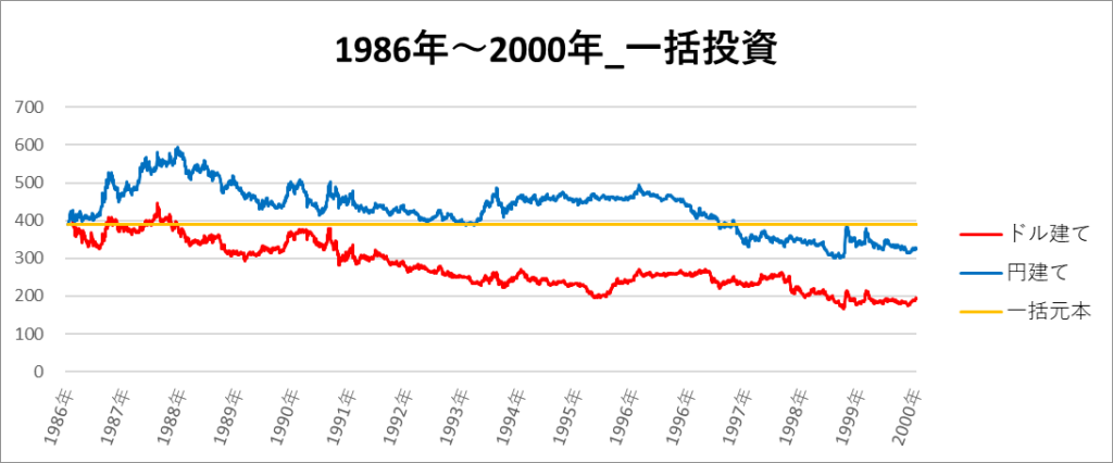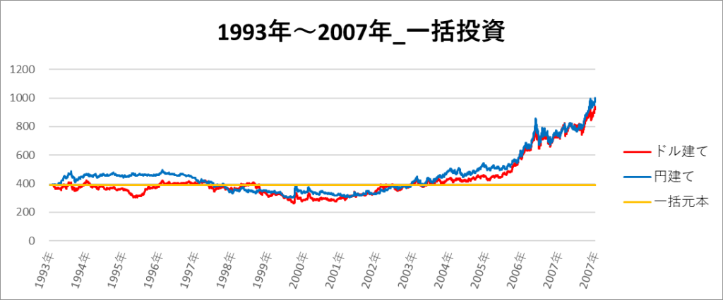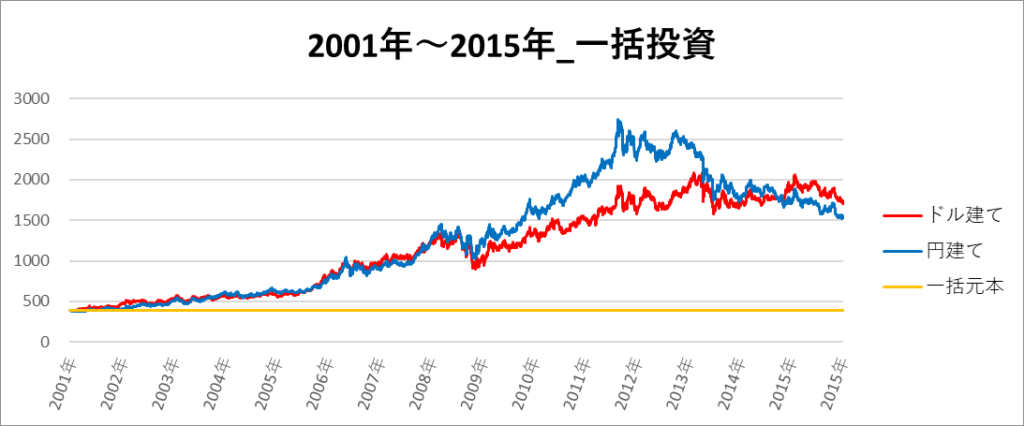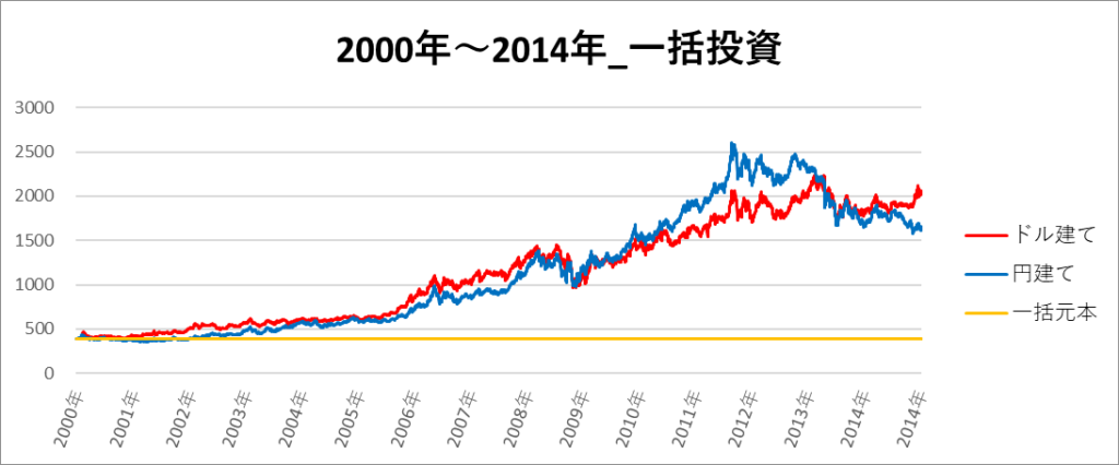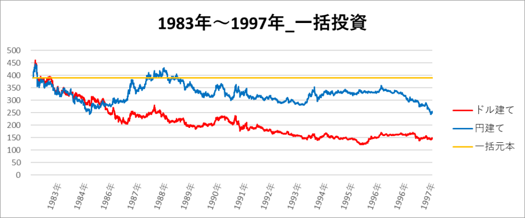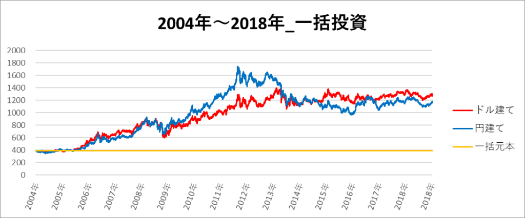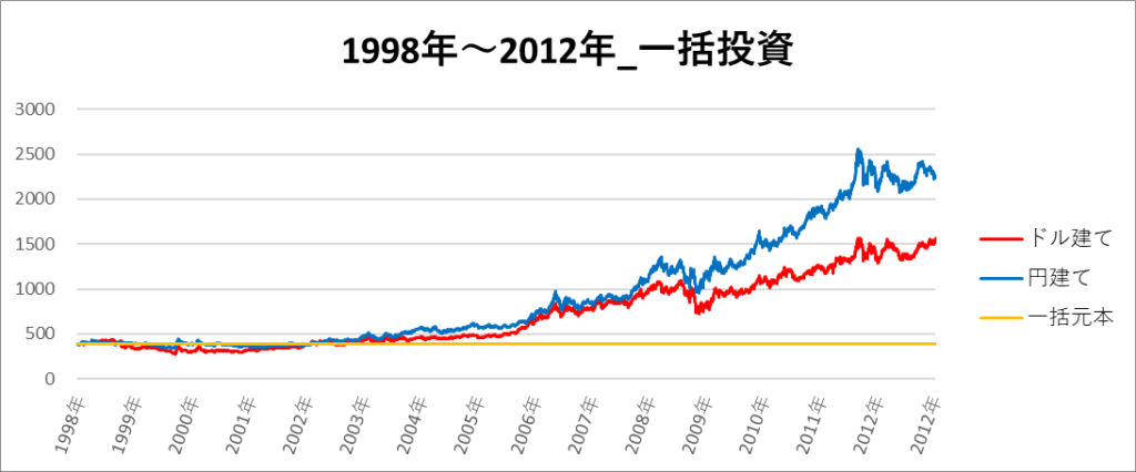 円建てとドル建ての2パターンを比較できるようにグラフに表記しているので、見比べて見てください。