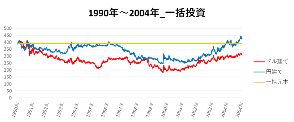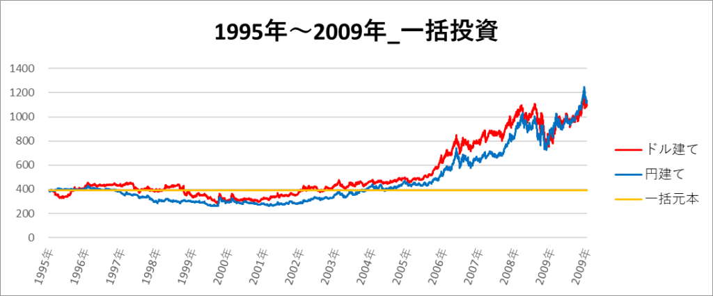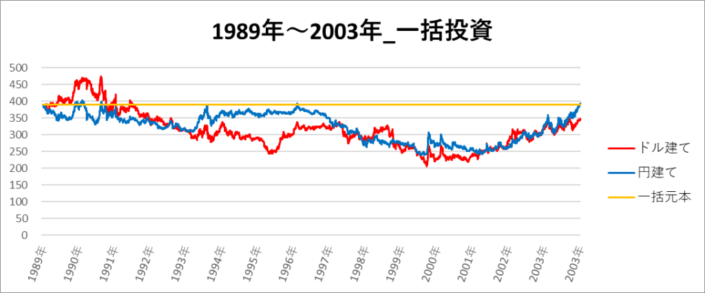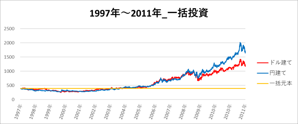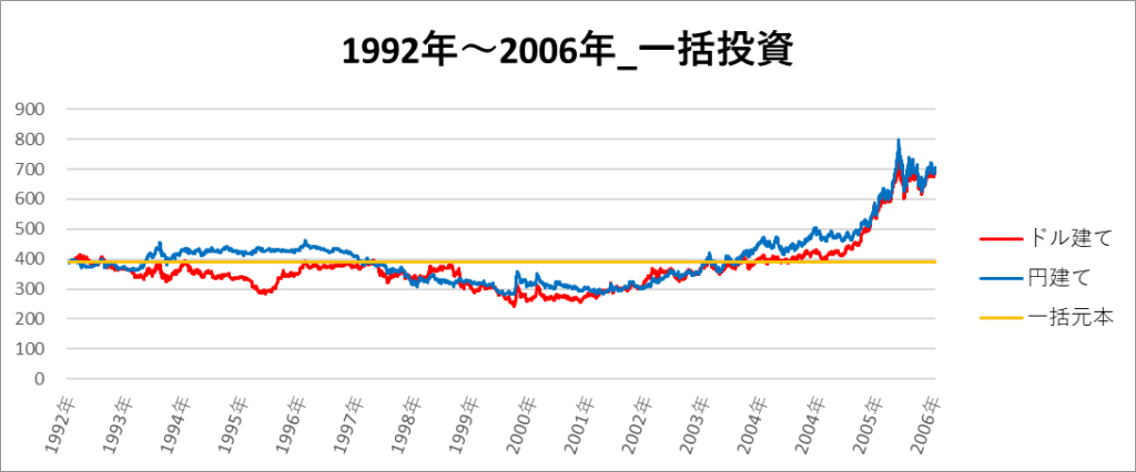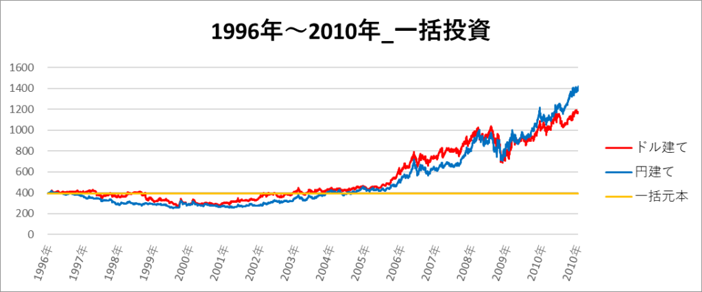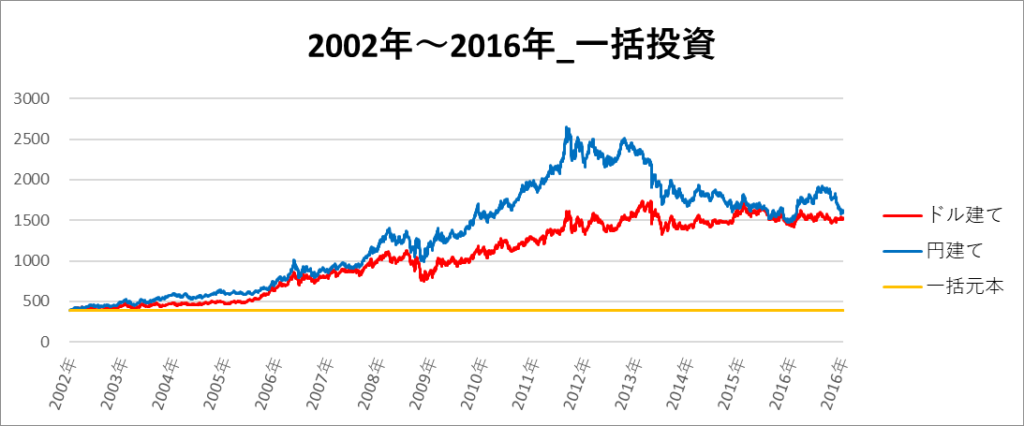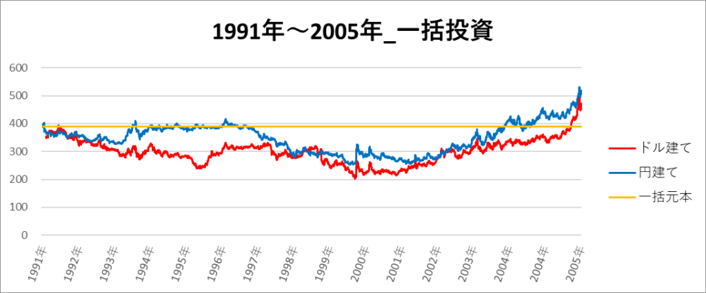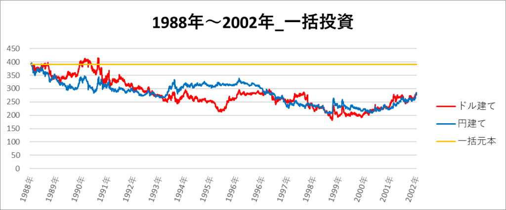 円建てとドル建ての2パターンを比較できるようにグラフに表記しているので、見比べて見てください。