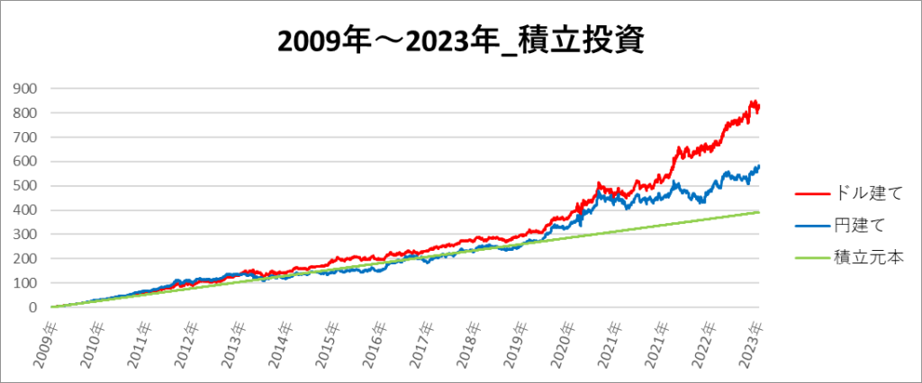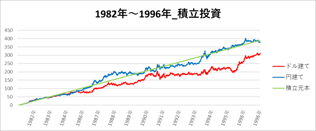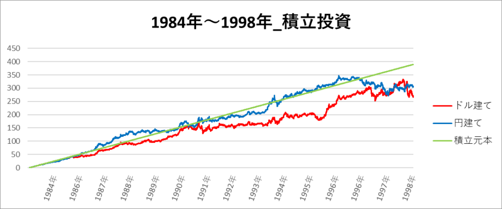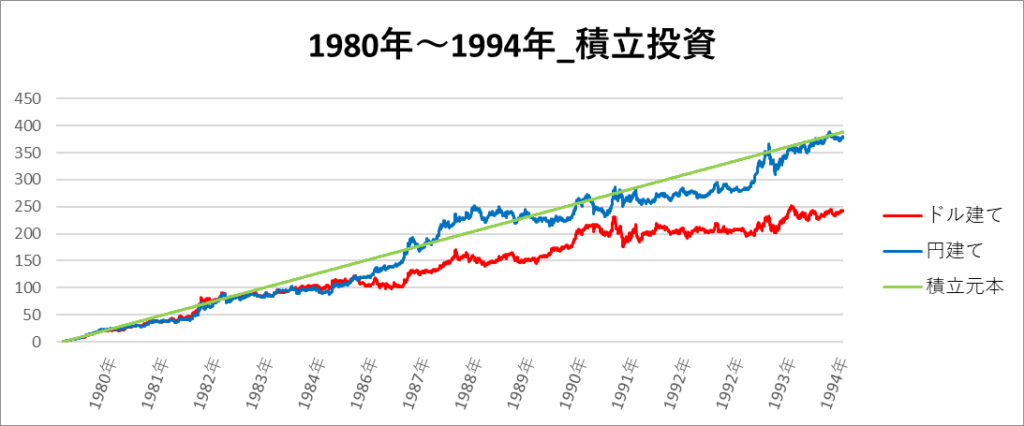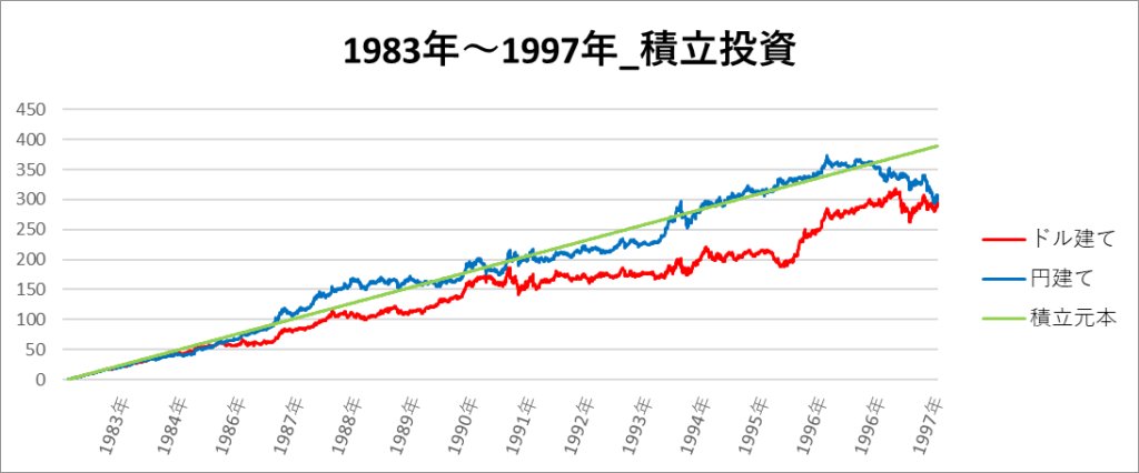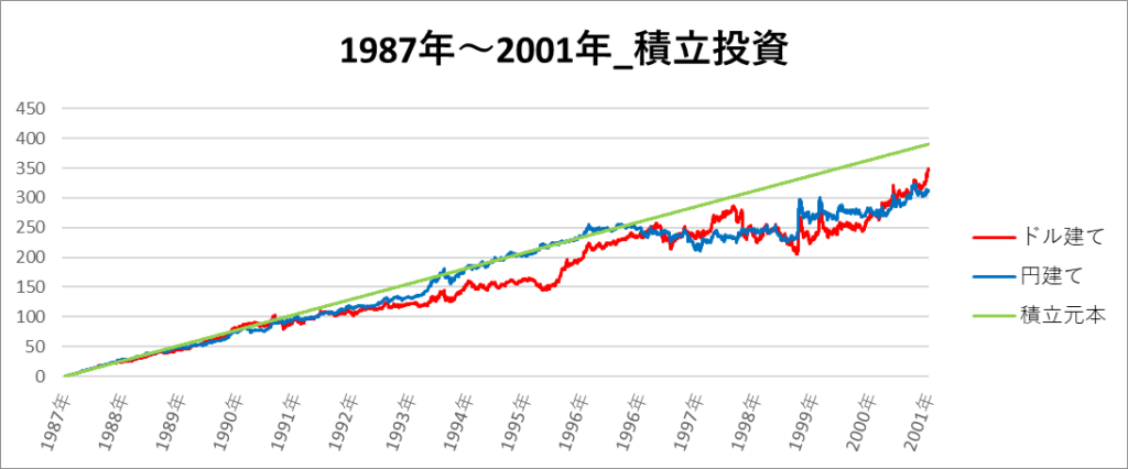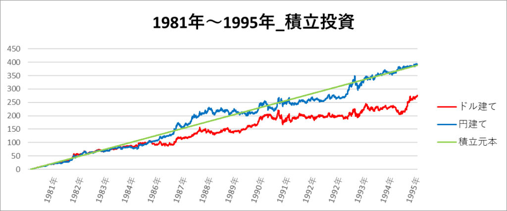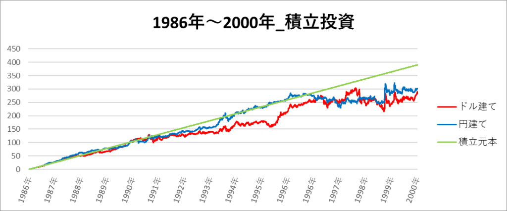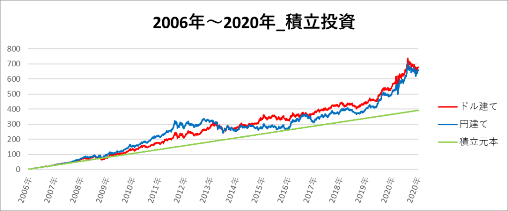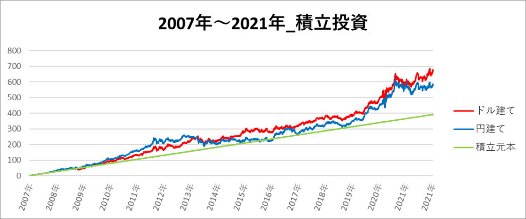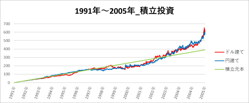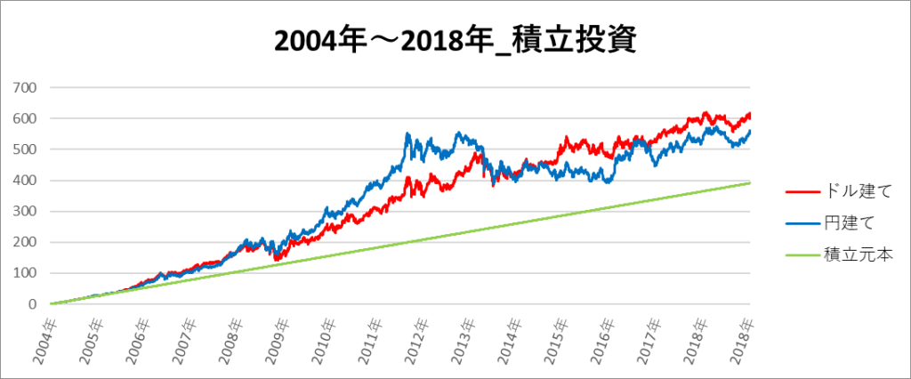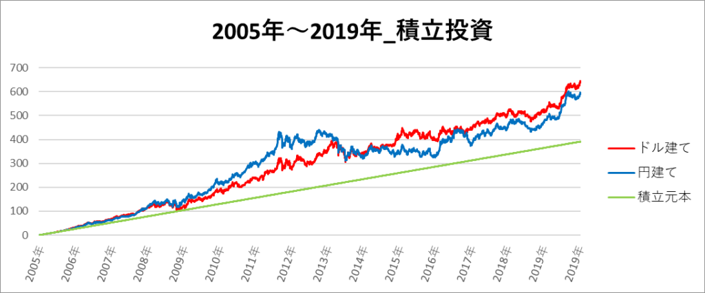 円建てとドル建ての2パターンを比較できるようにグラフに表記しているので、見比べて見てください。