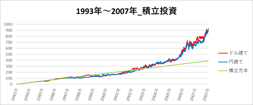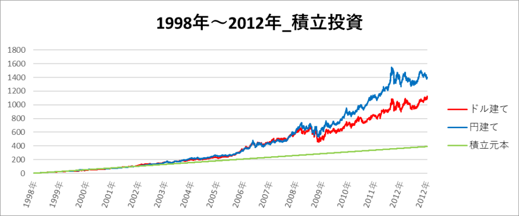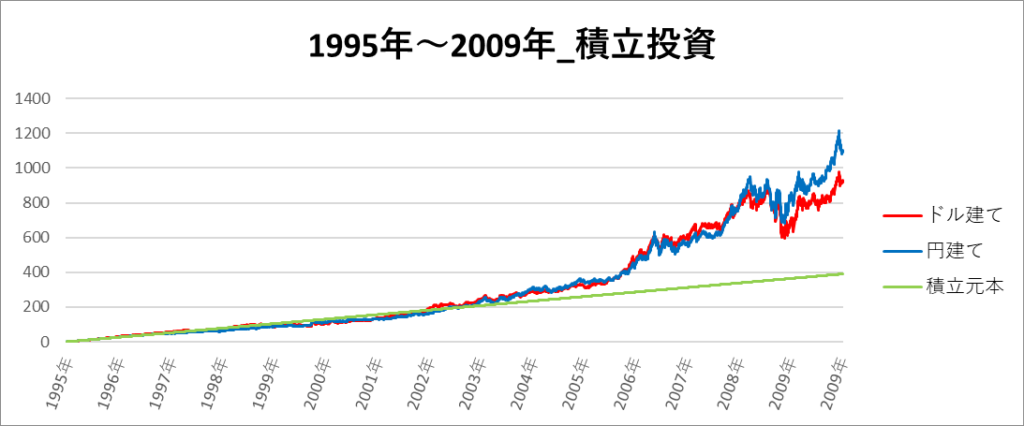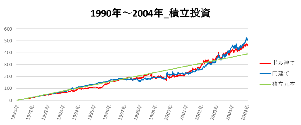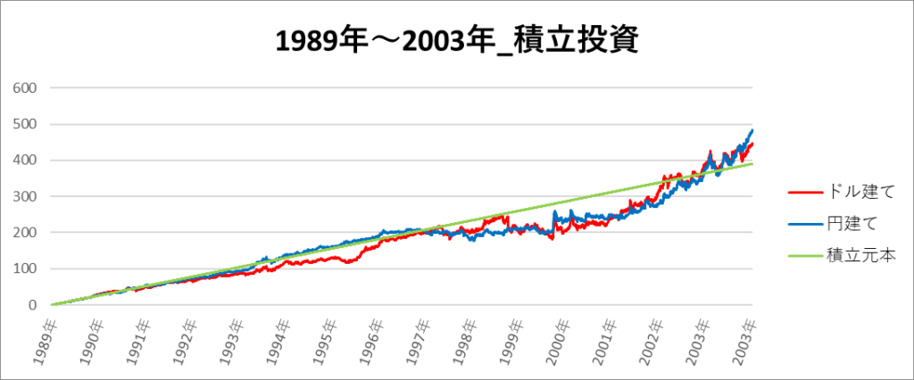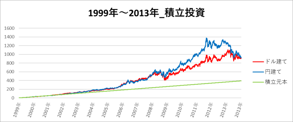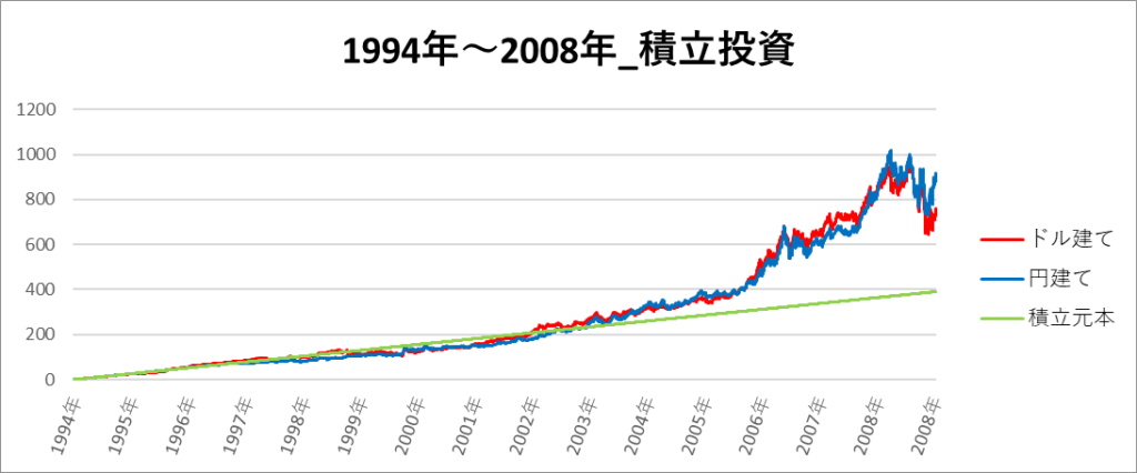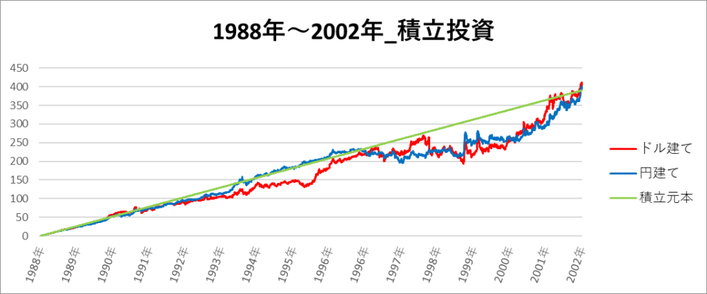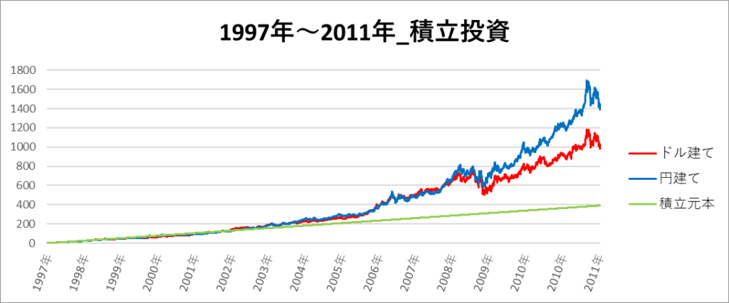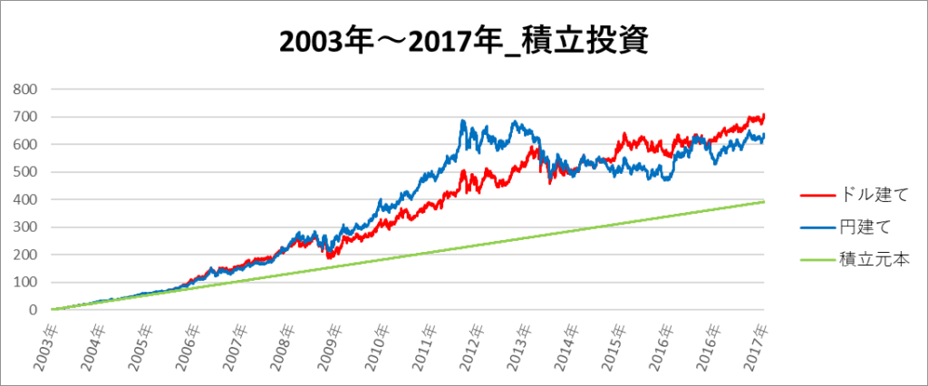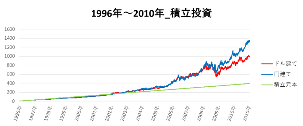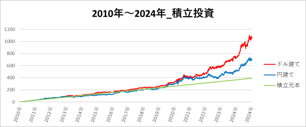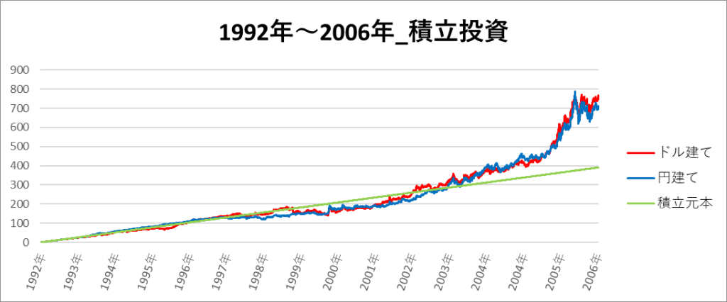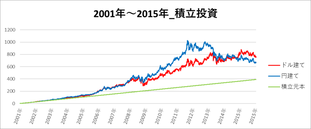 円建てとドル建ての2パターンを比較できるようにグラフに表記しているので、見比べて見てください。