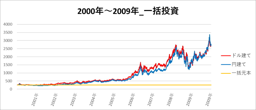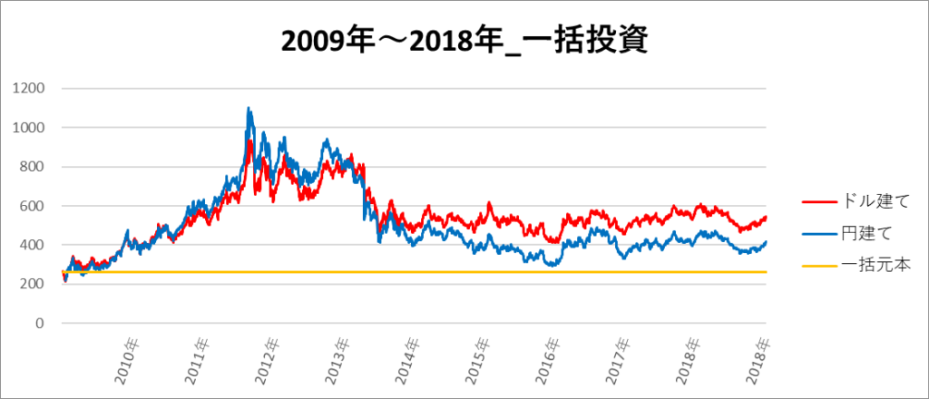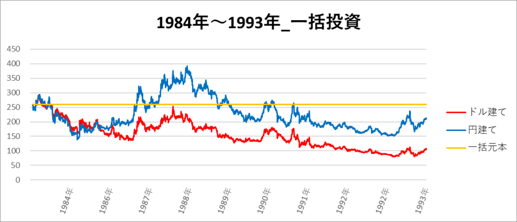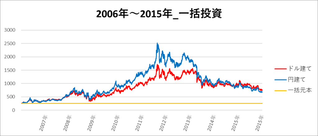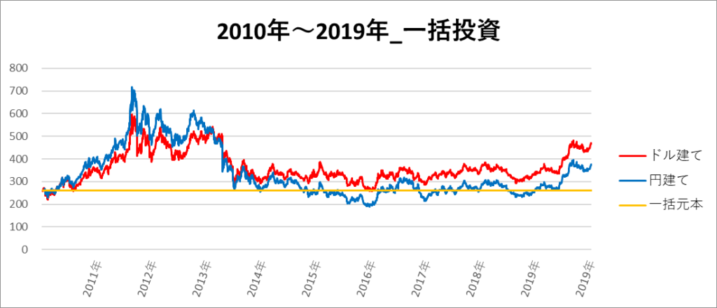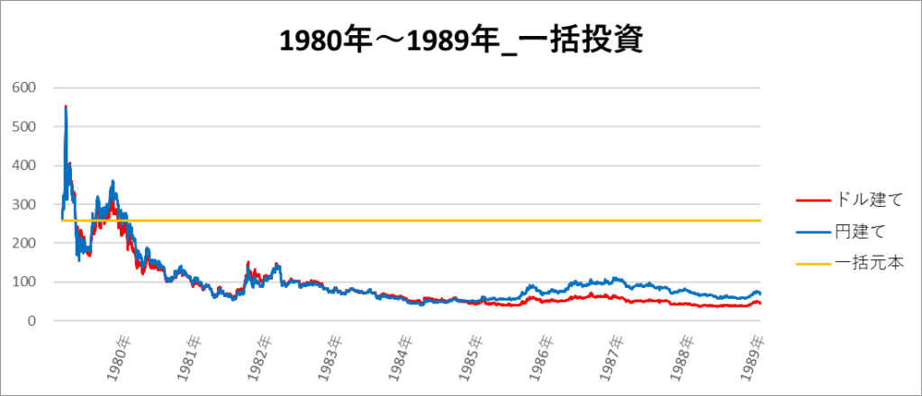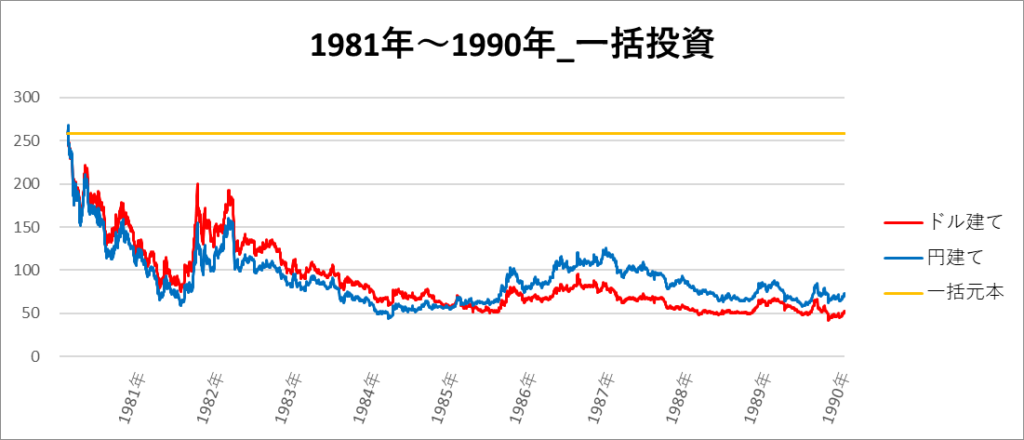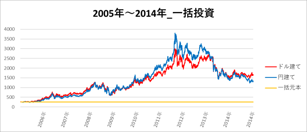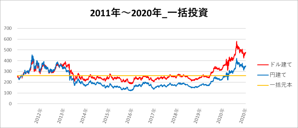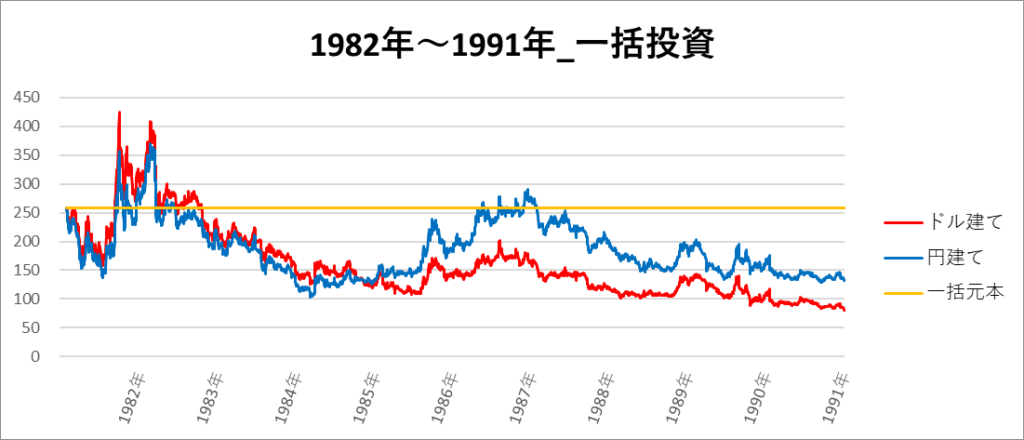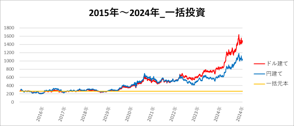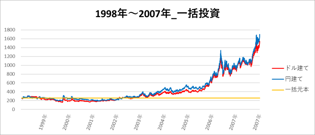 円建てとドル建ての2パターンを比較できるようにグラフに表記しているので、見比べて見てください。