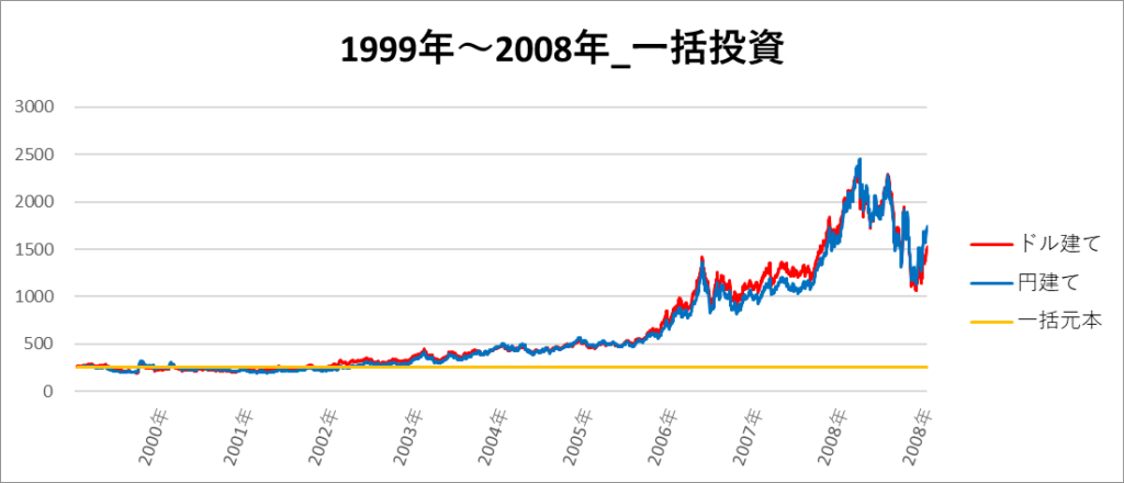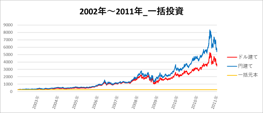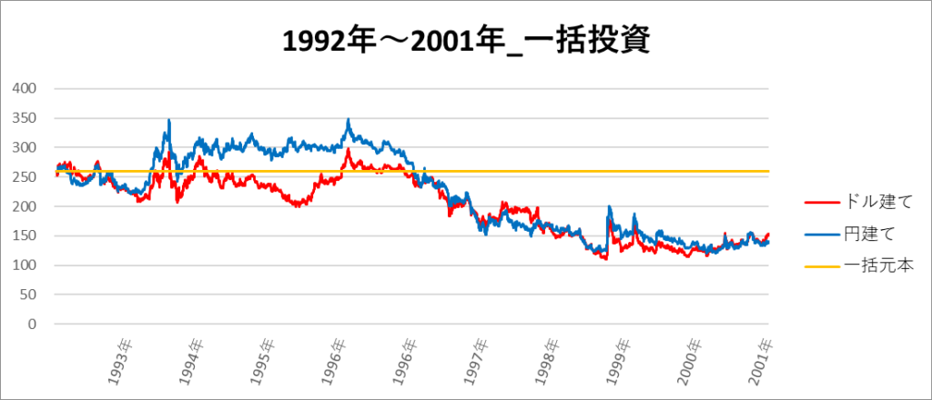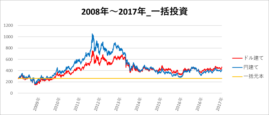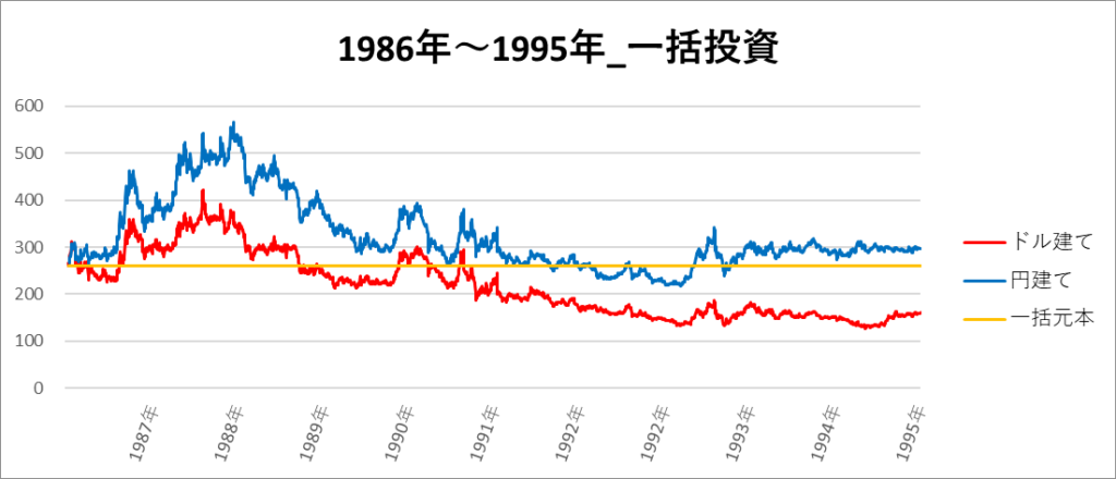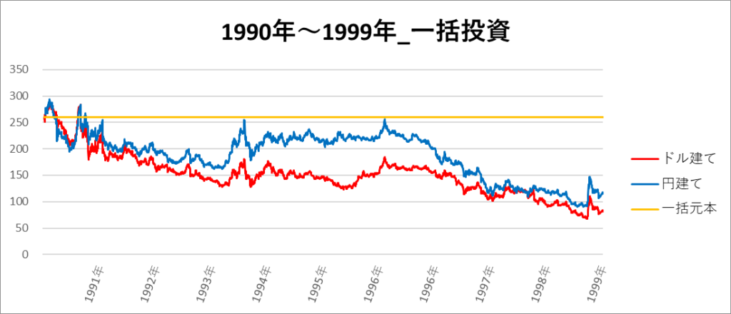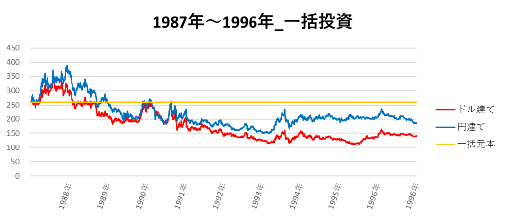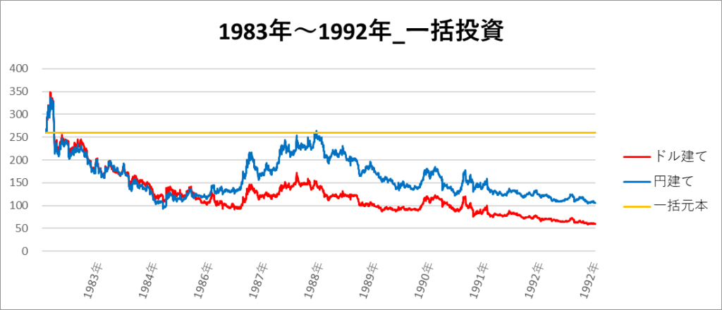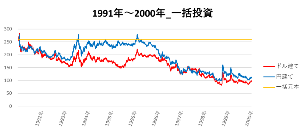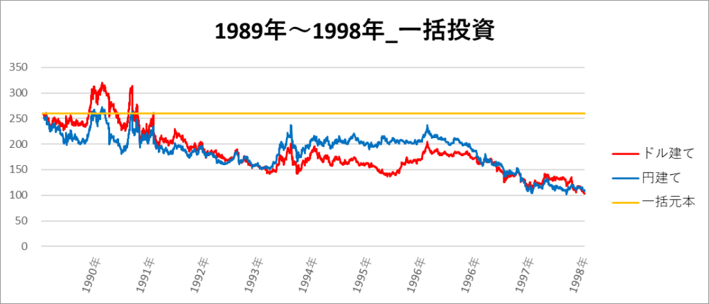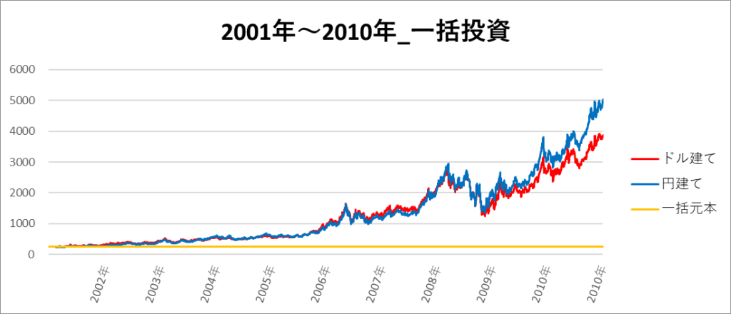 円建てとドル建ての2パターンを比較できるようにグラフに表記しているので、見比べて見てください。