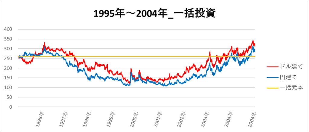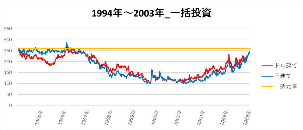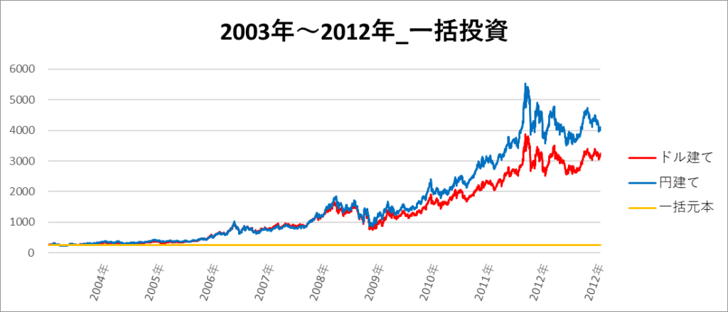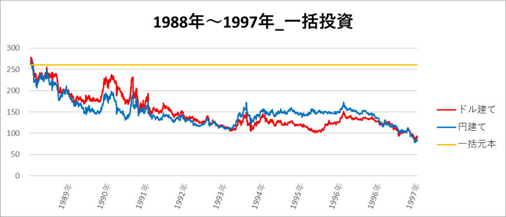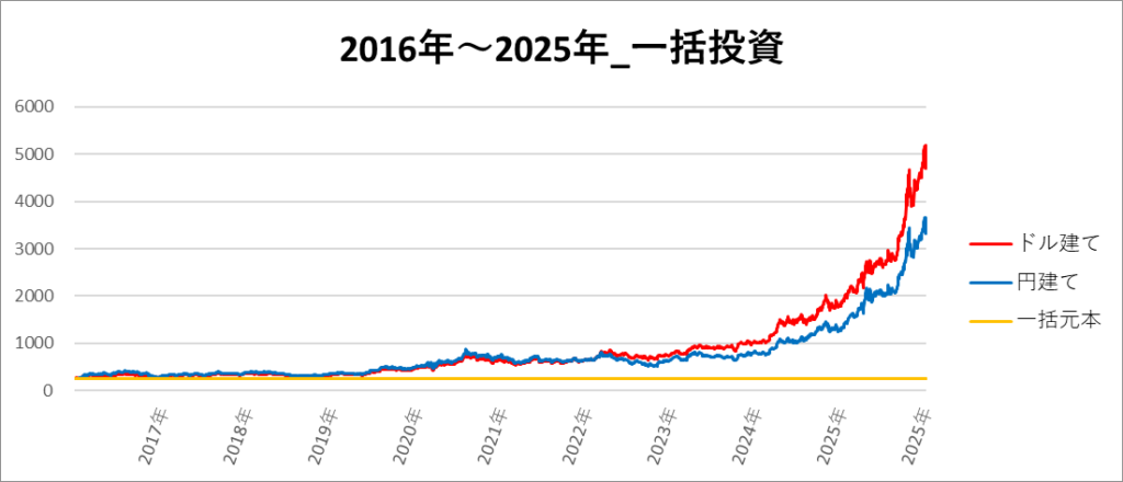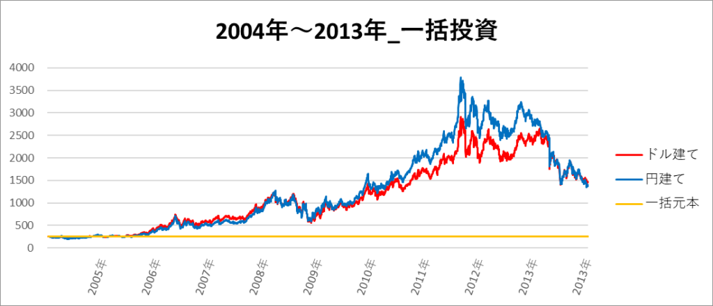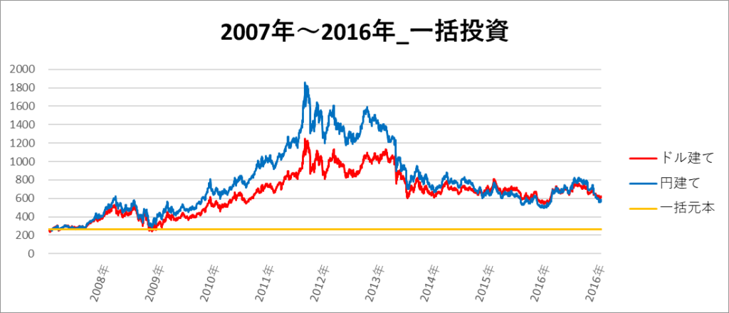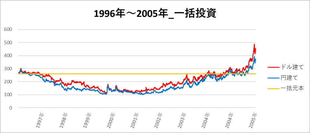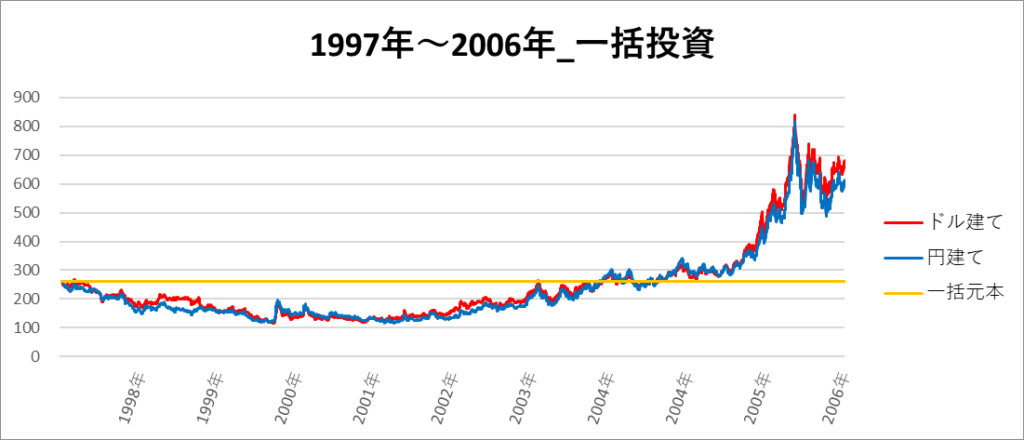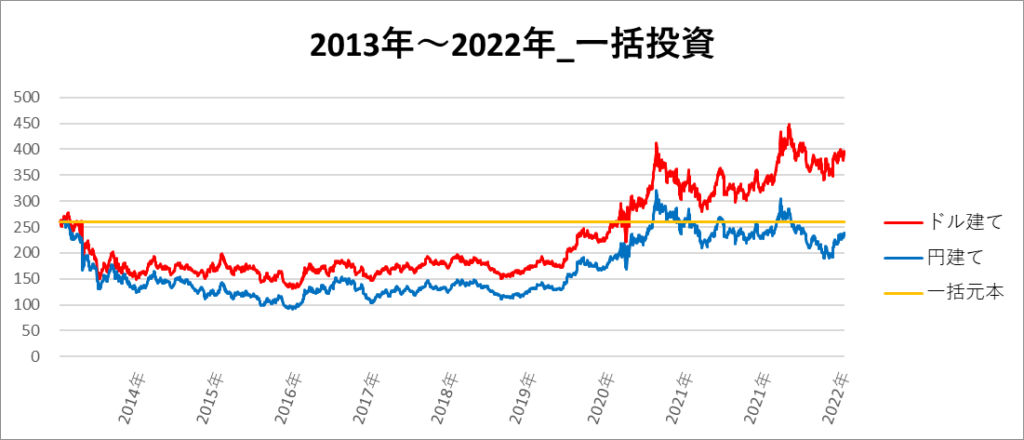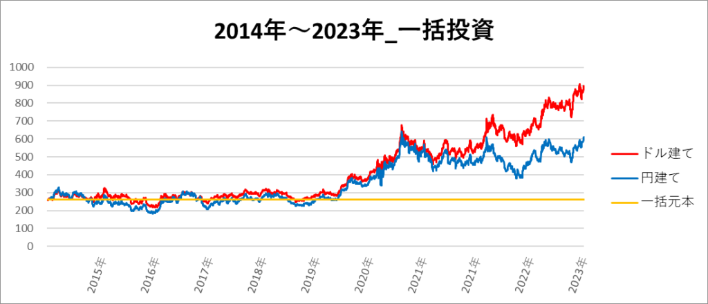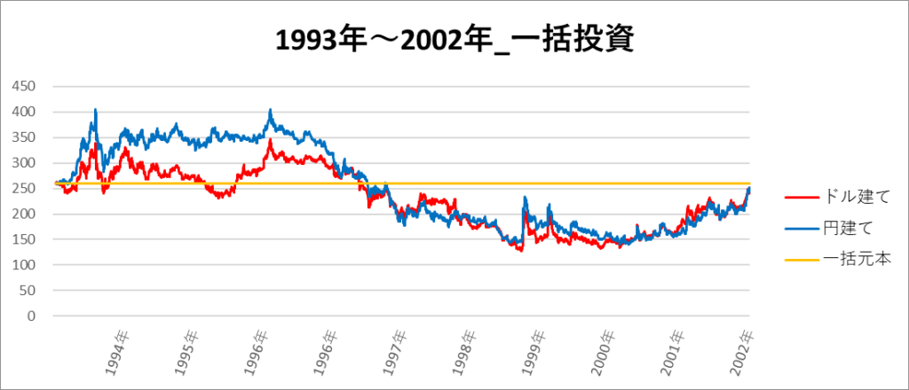 円建てとドル建ての2パターンを比較できるようにグラフに表記しているので、見比べて見てください。