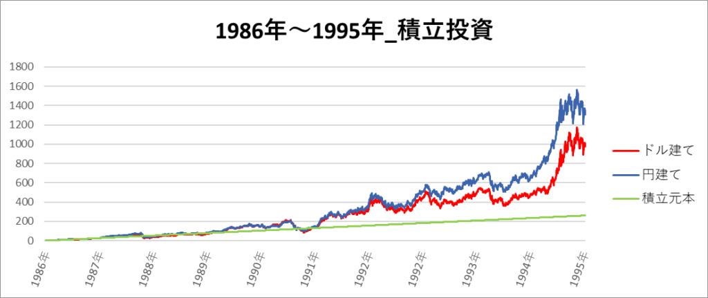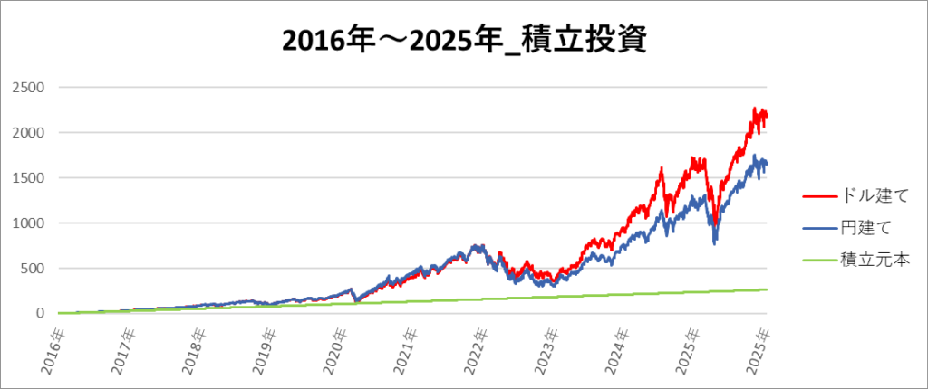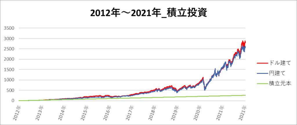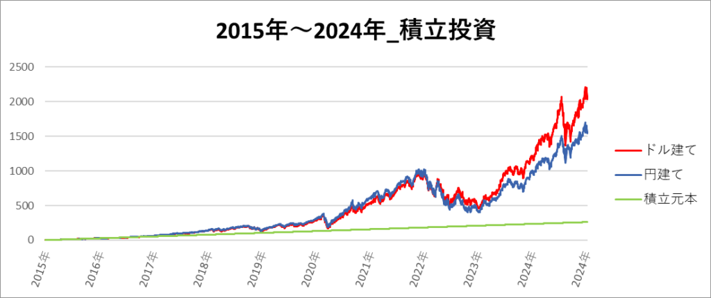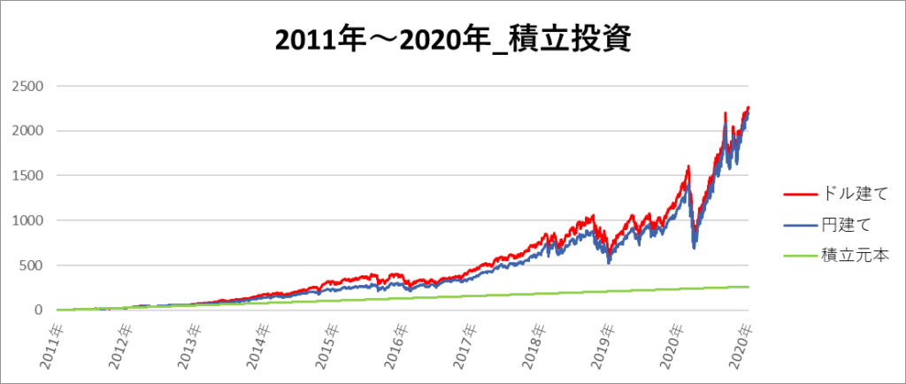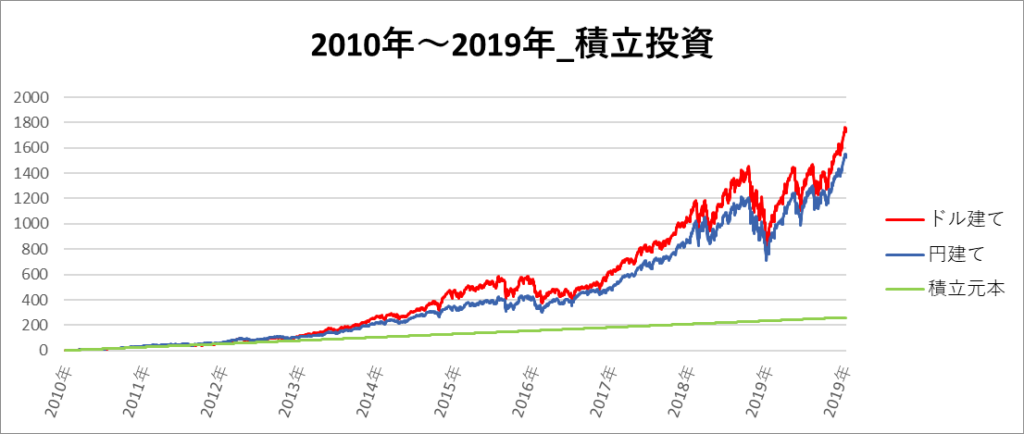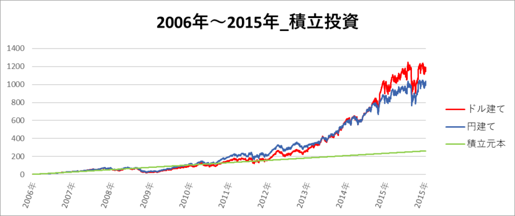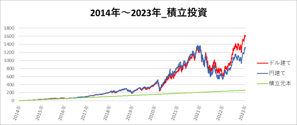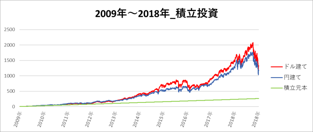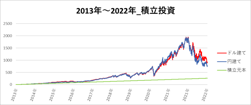 円建てとドル建ての2パターンを比較できるようにグラフに表記しているので、見比べて見てください。