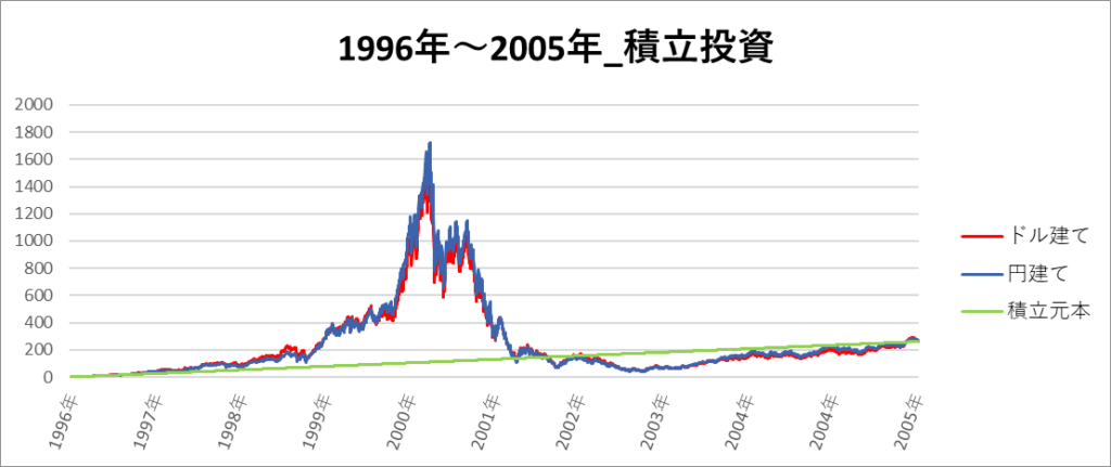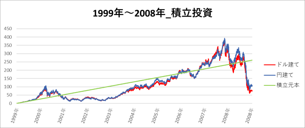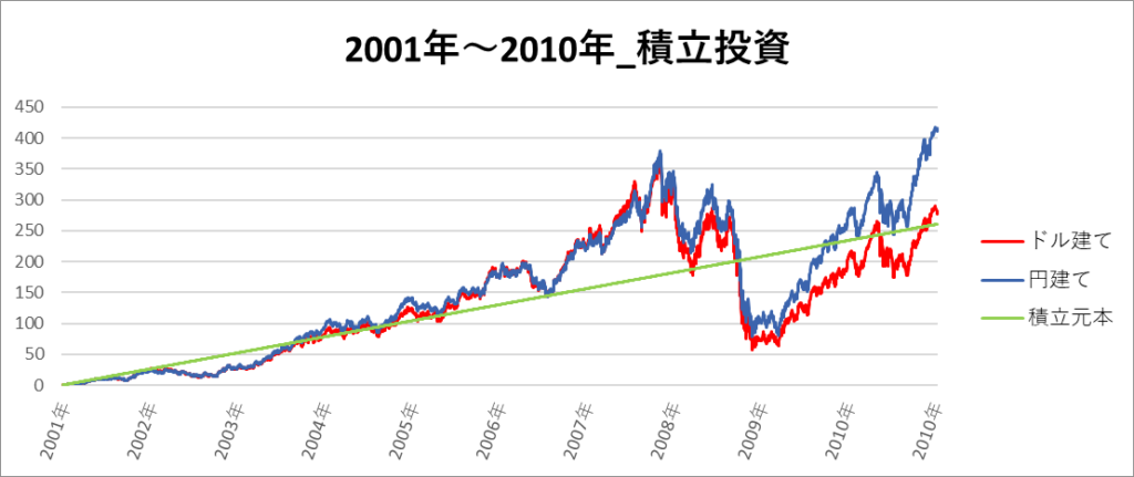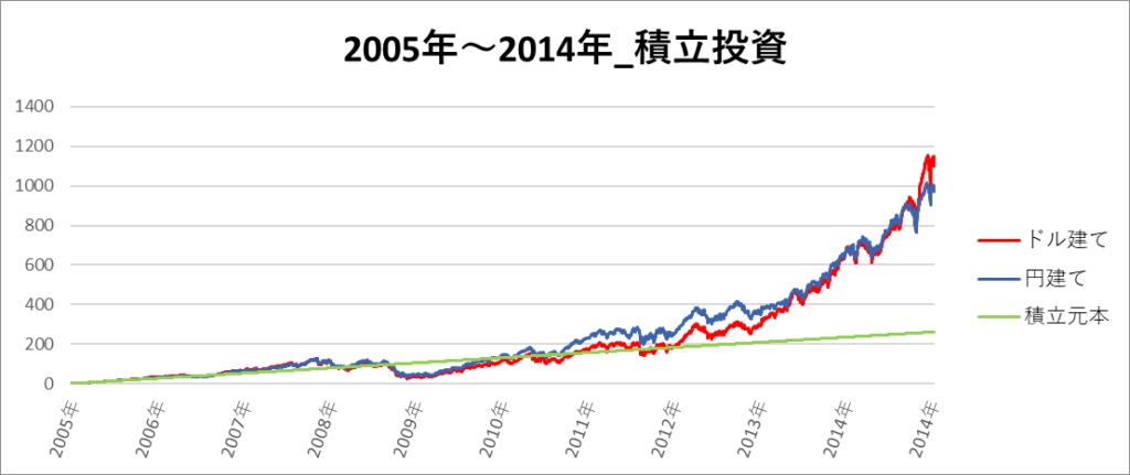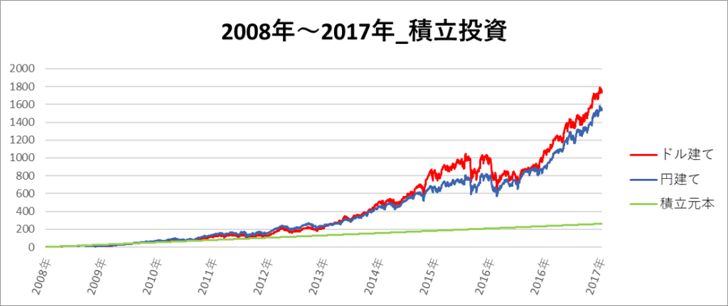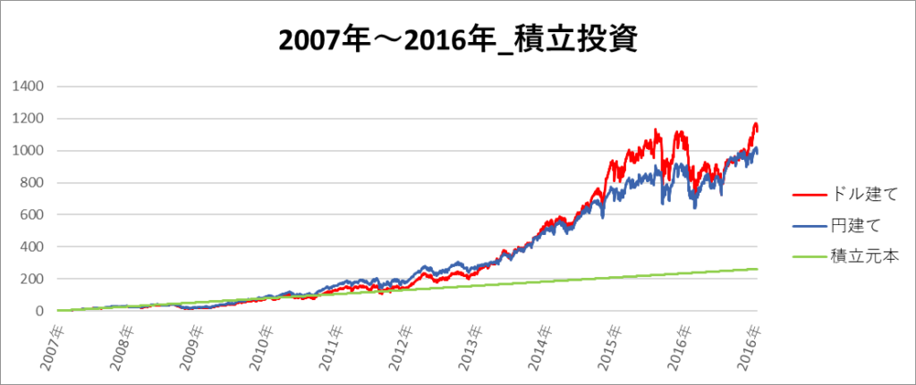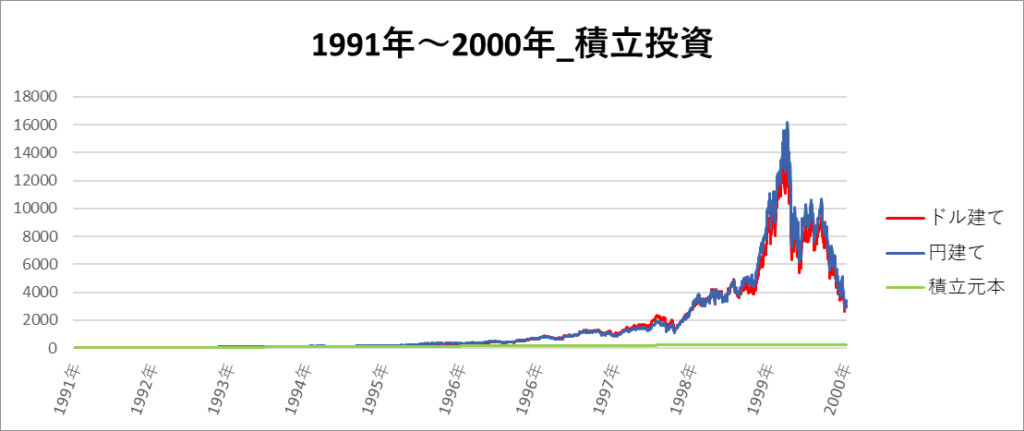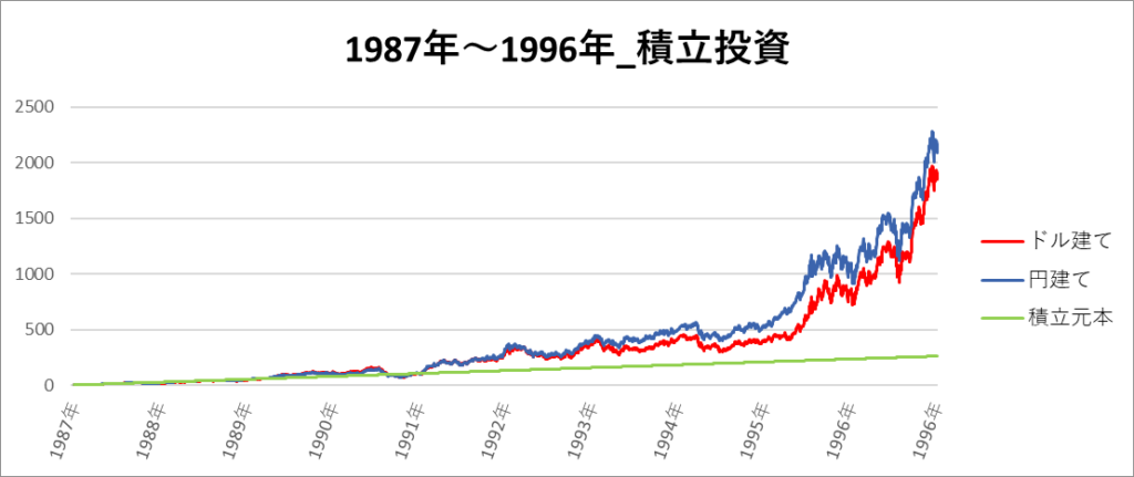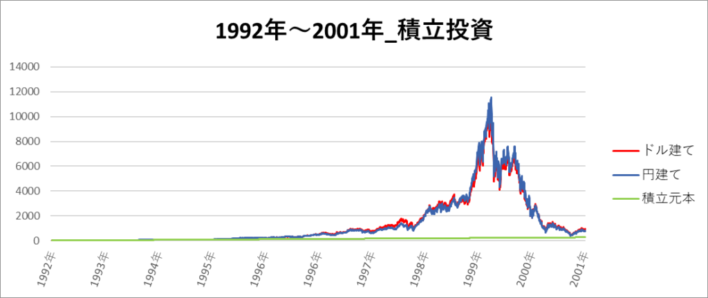 円建てとドル建ての2パターンを比較できるようにグラフに表記しているので、見比べて見てください。