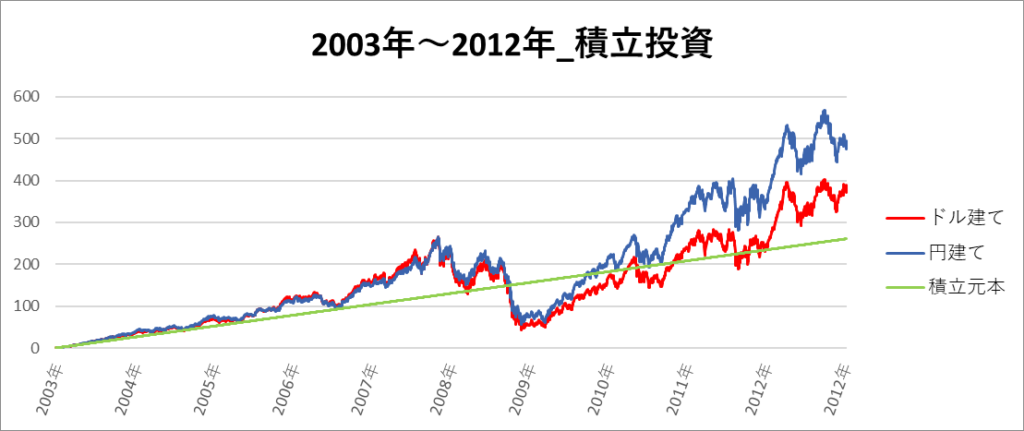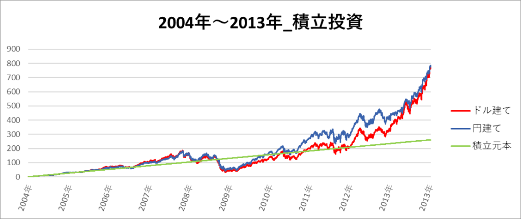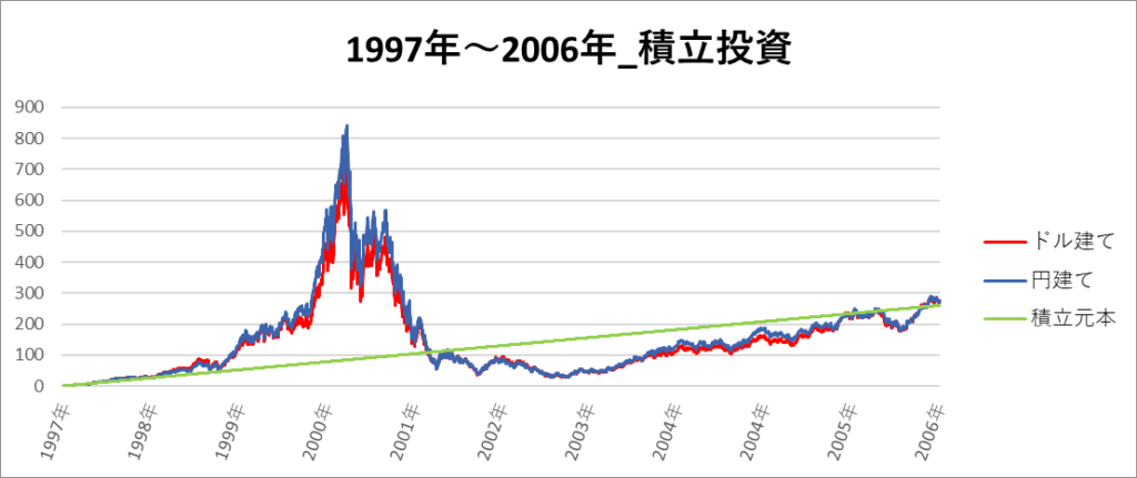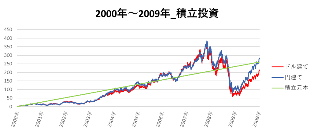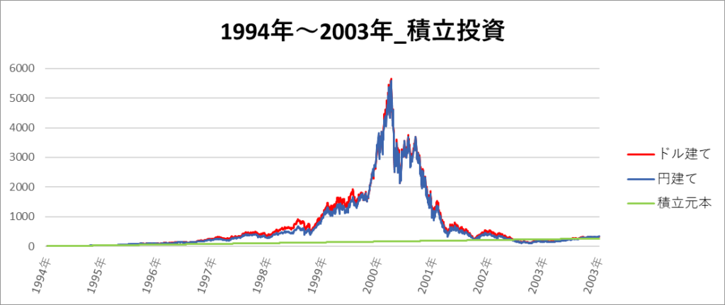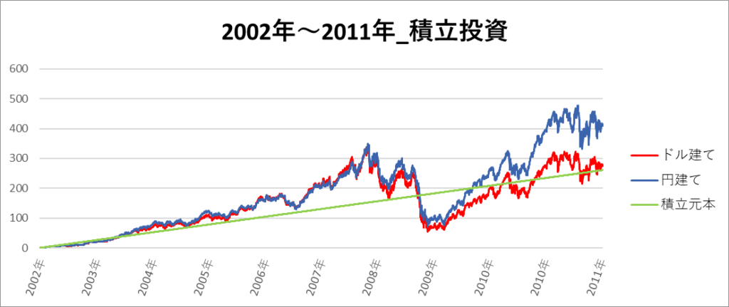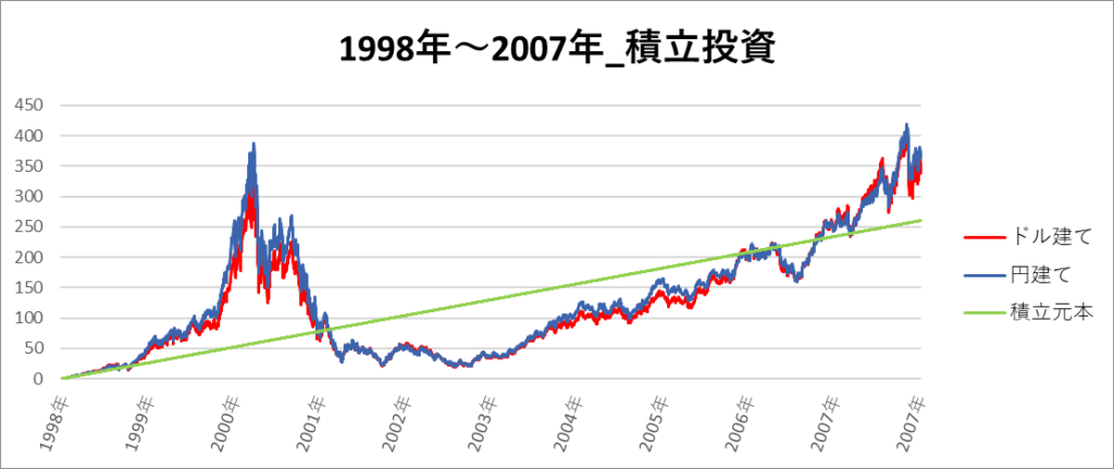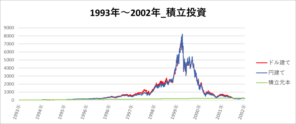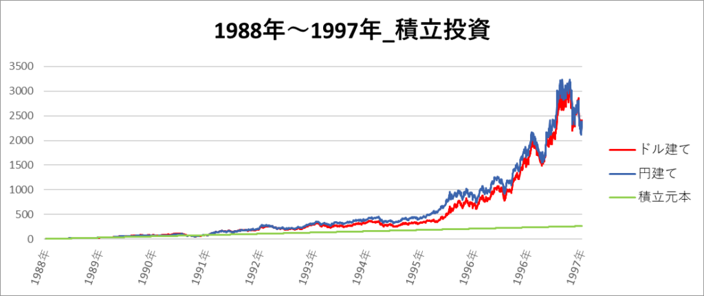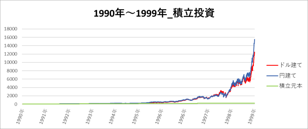 円建てとドル建ての2パターンを比較できるようにグラフに表記しているので、見比べて見てください。