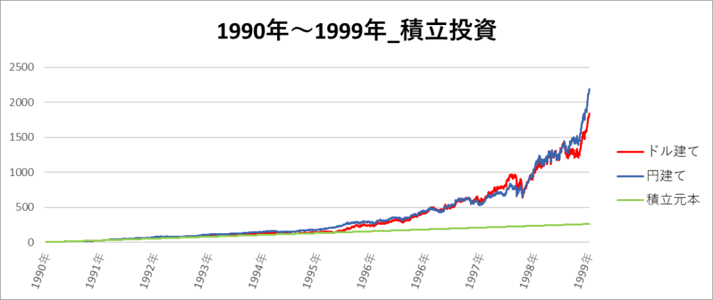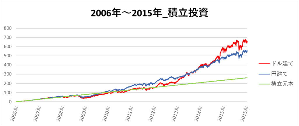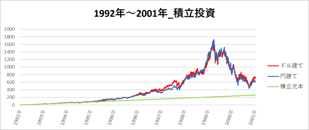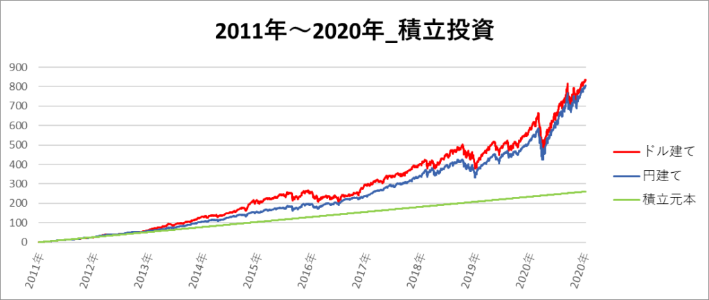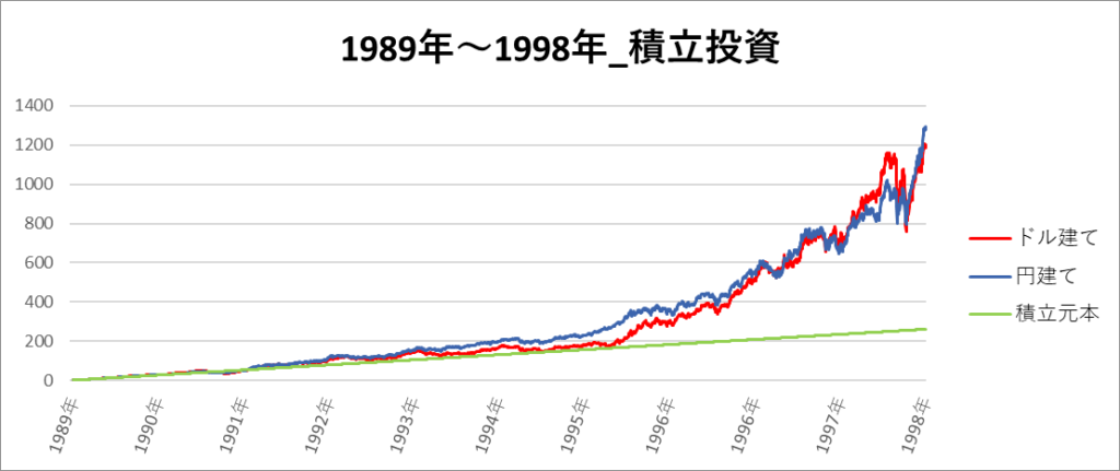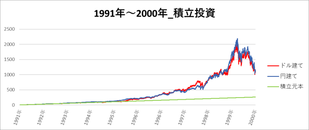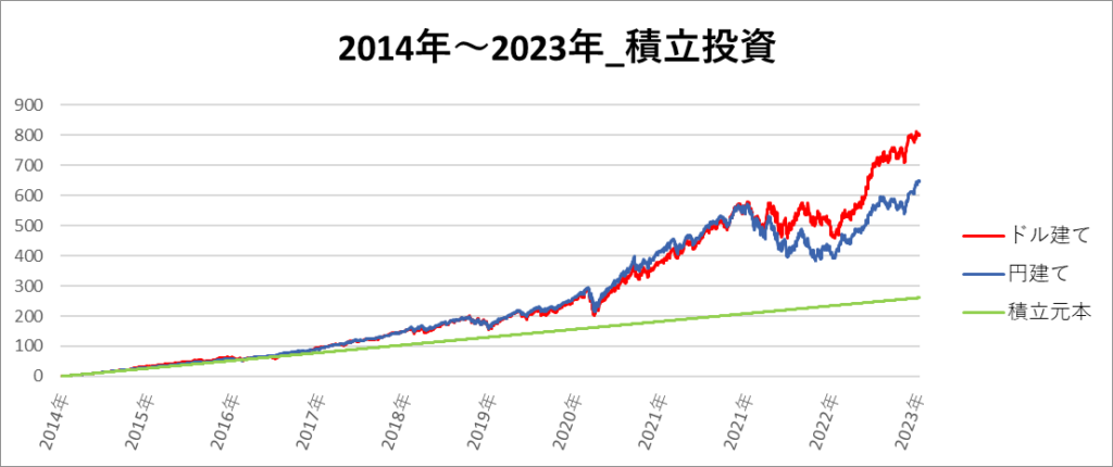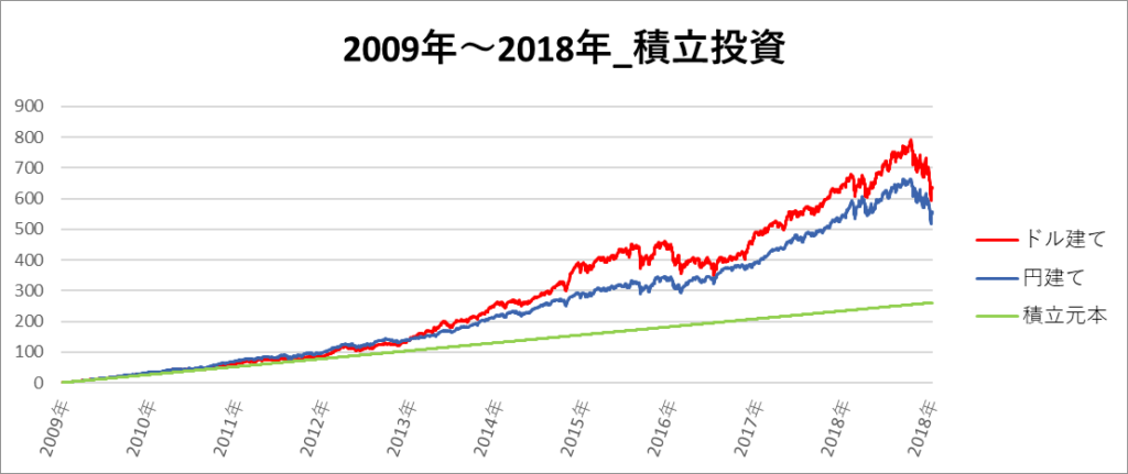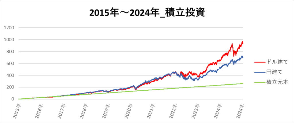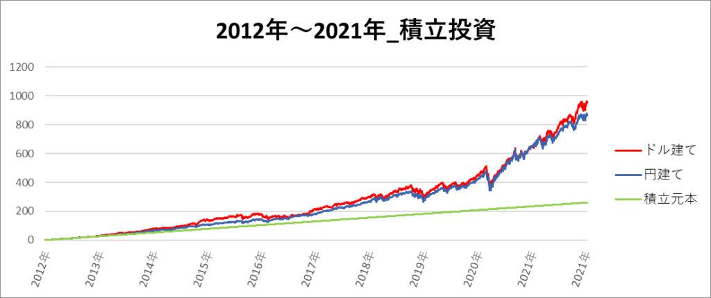 円建てとドル建ての2パターンを比較できるようにグラフに表記しているので、見比べて見てください。