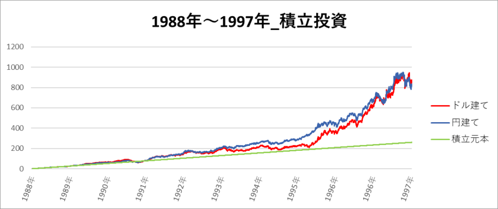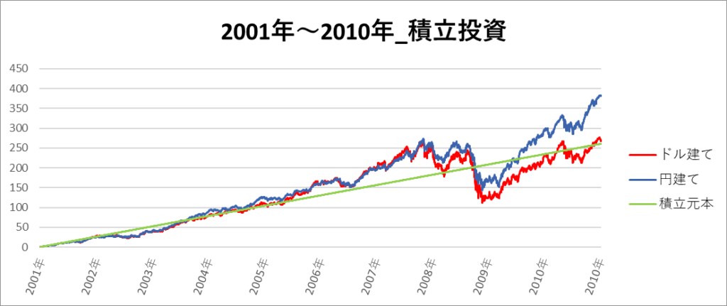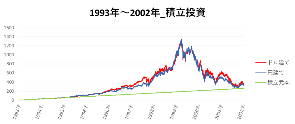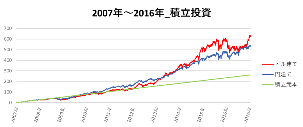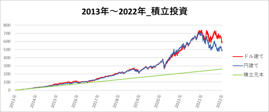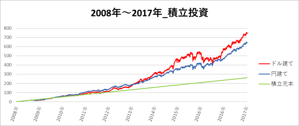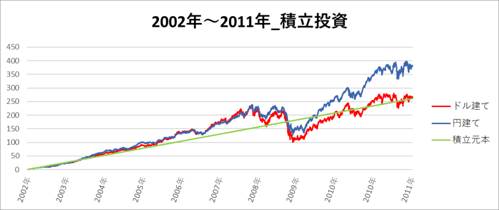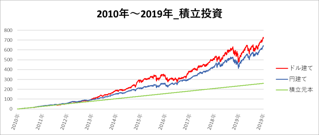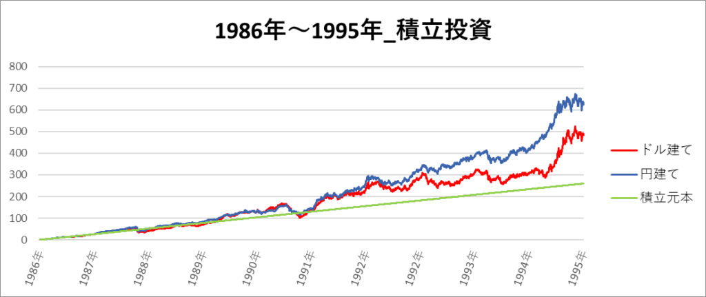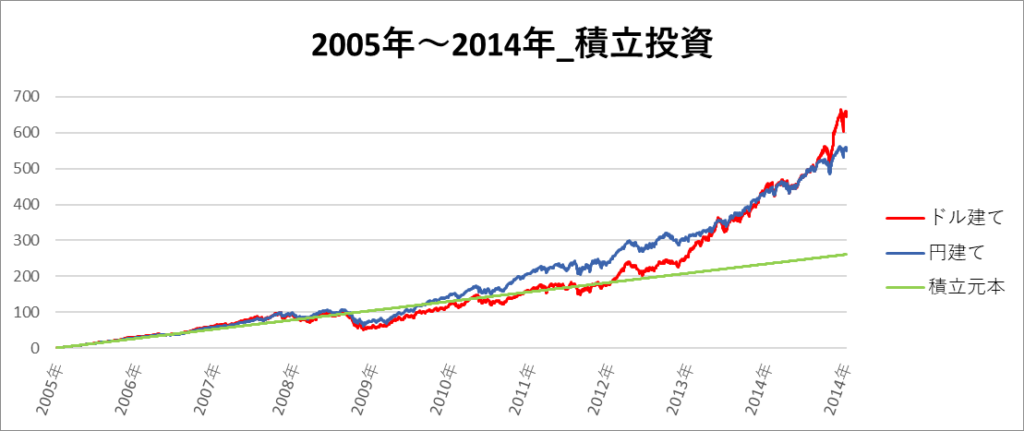 円建てとドル建ての2パターンを比較できるようにグラフに表記しているので、見比べて見てください。