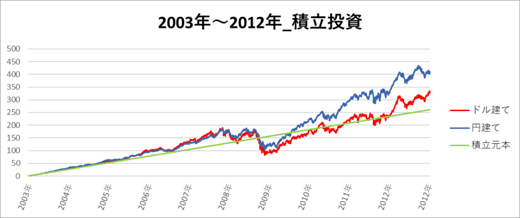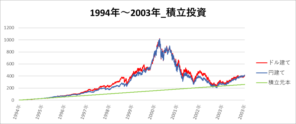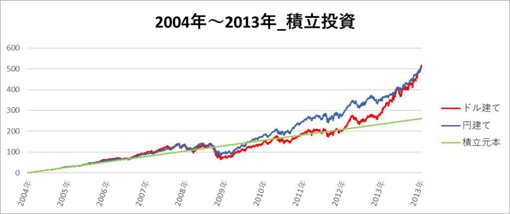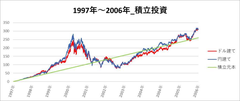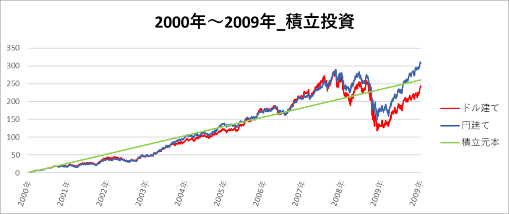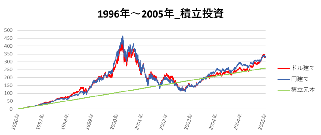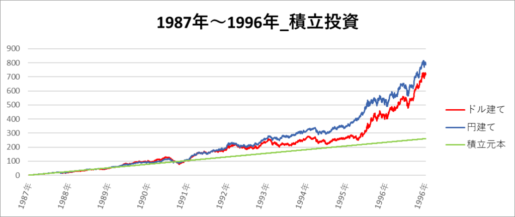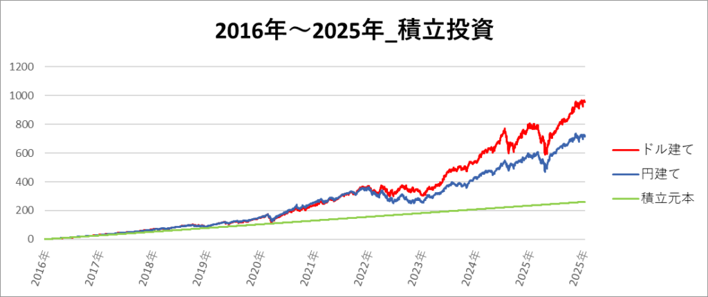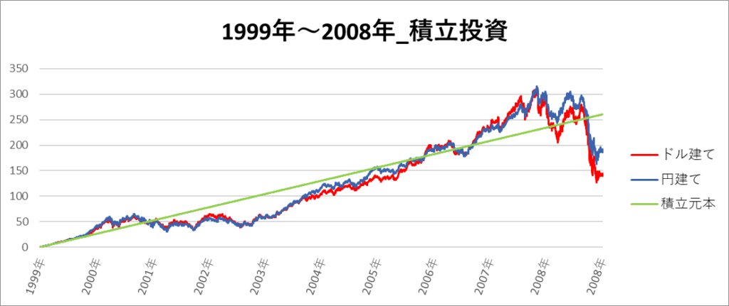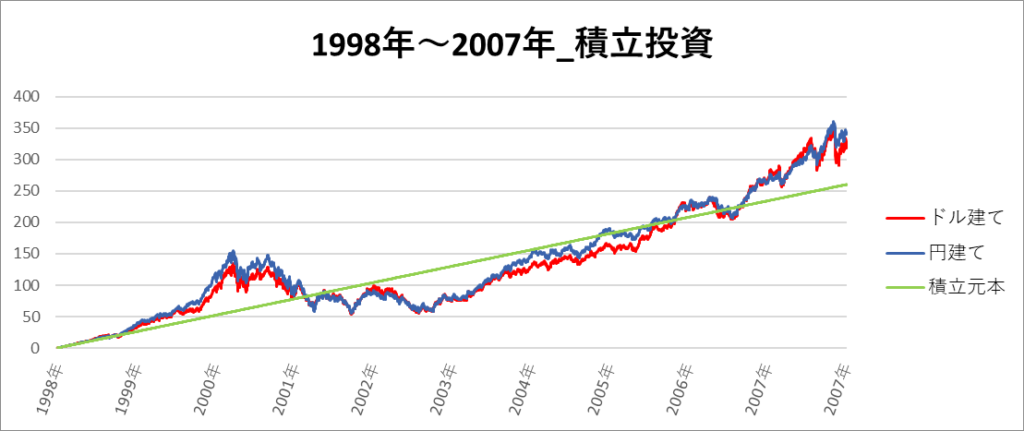 円建てとドル建ての2パターンを比較できるようにグラフに表記しているので、見比べて見てください。