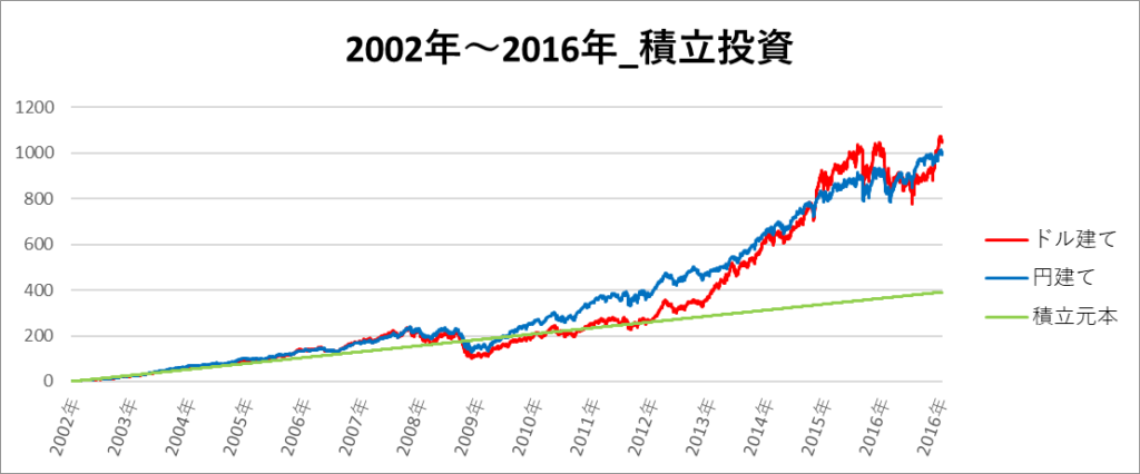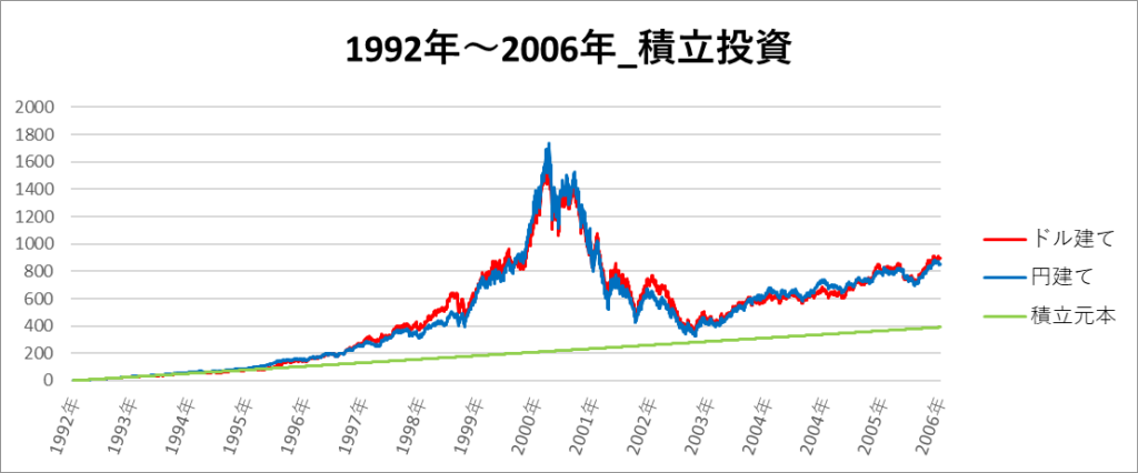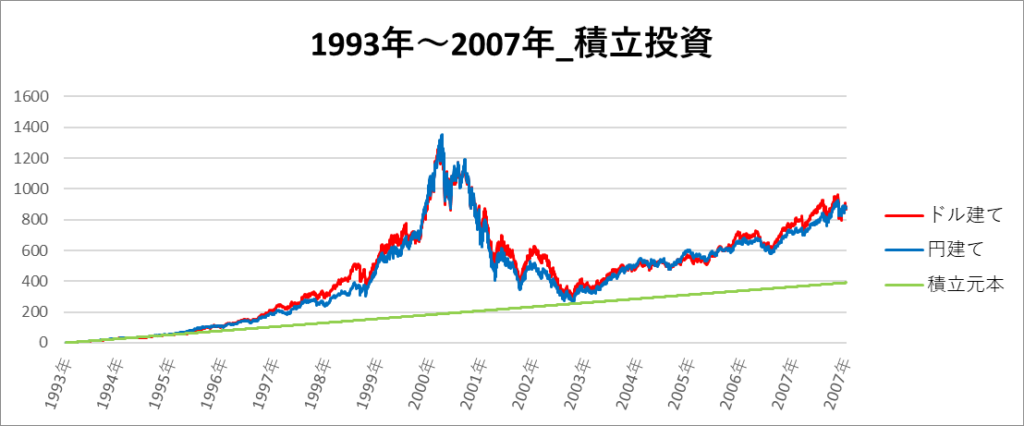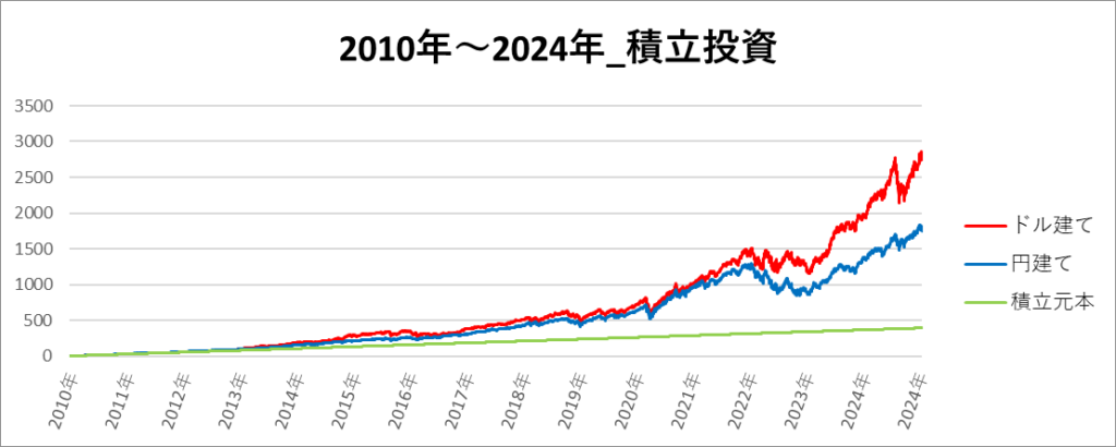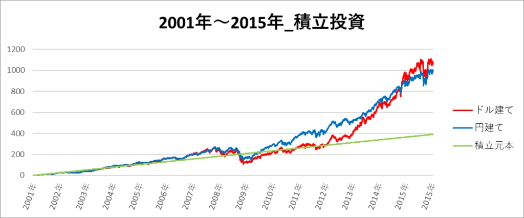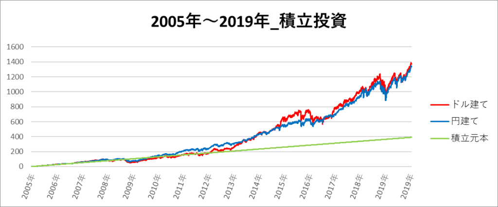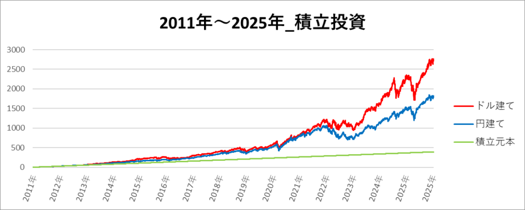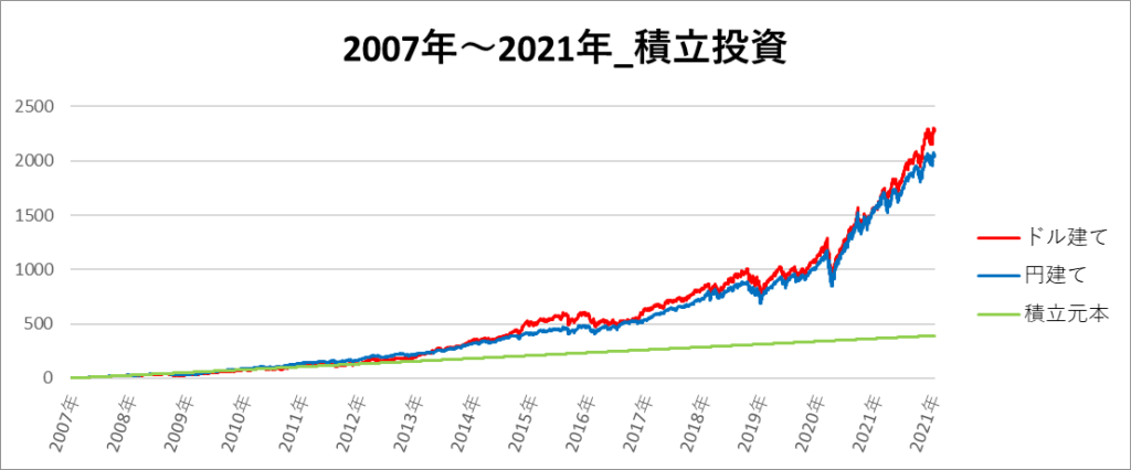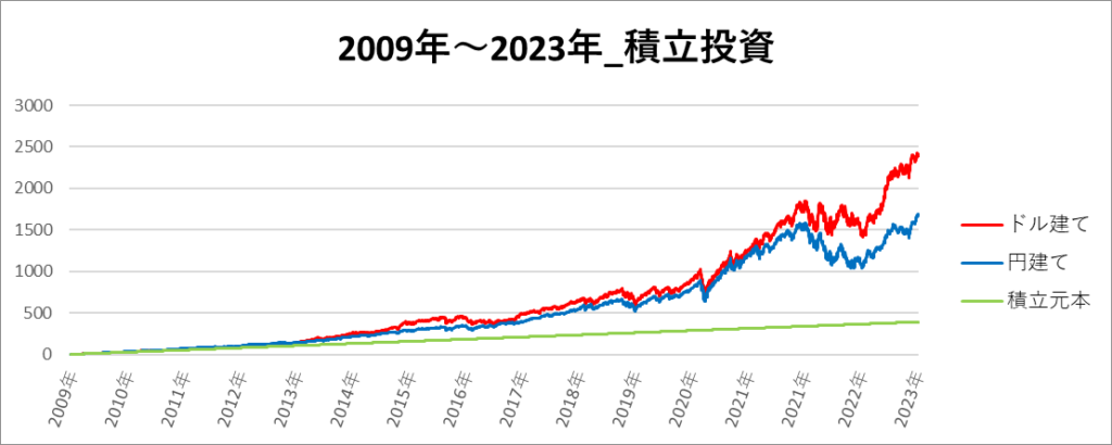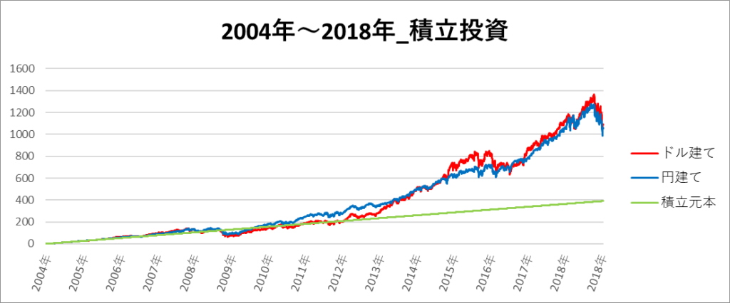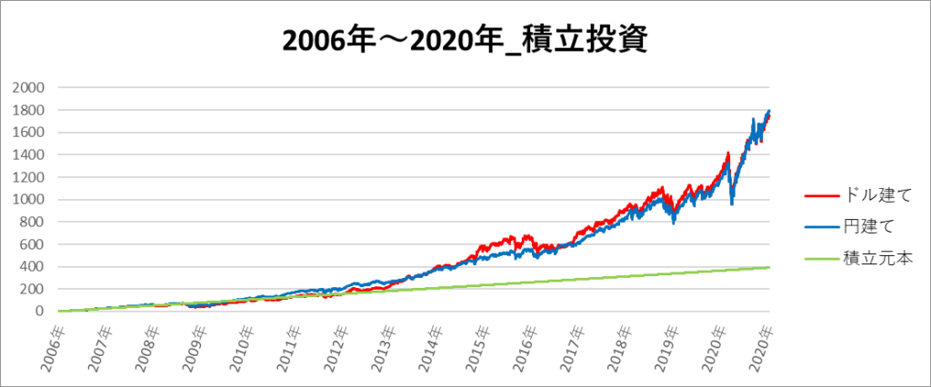 円建てとドル建ての2パターンを比較できるようにグラフに表記しているので、見比べて見てください。