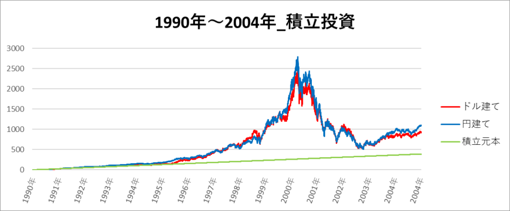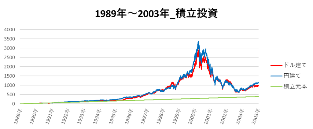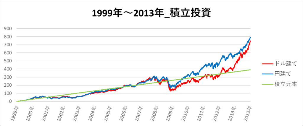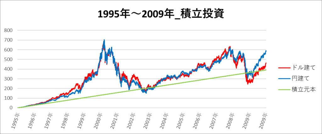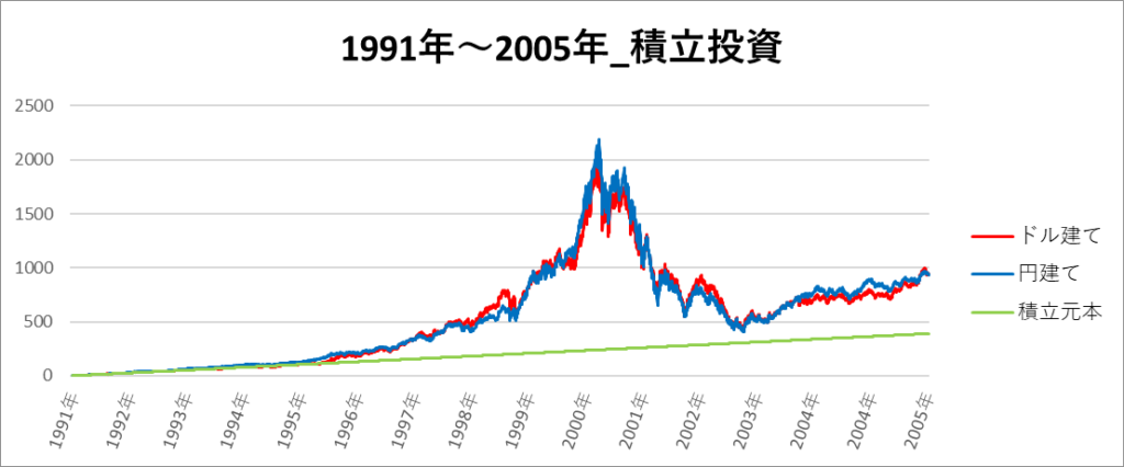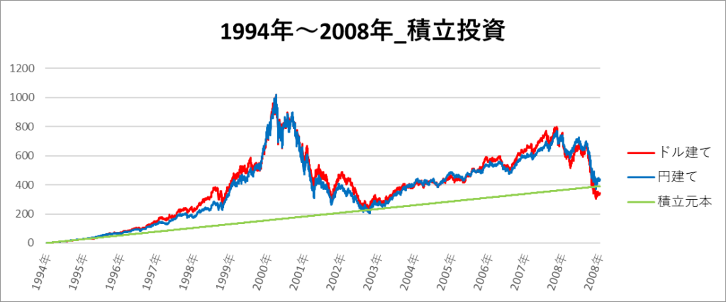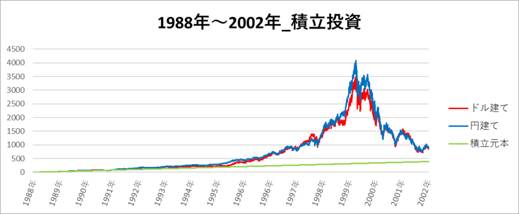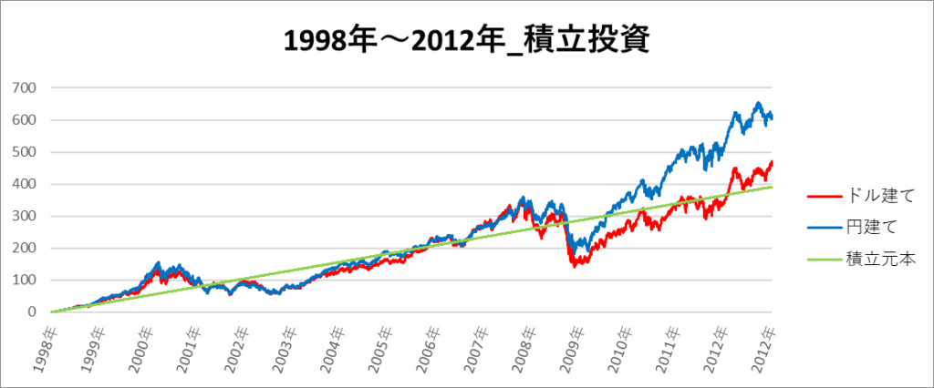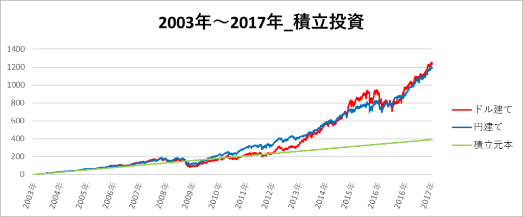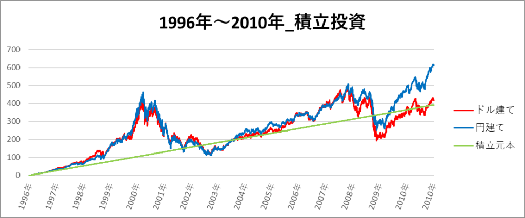 円建てとドル建ての2パターンを比較できるようにグラフに表記しているので、見比べて見てください。