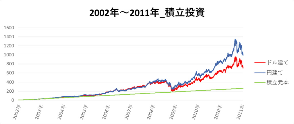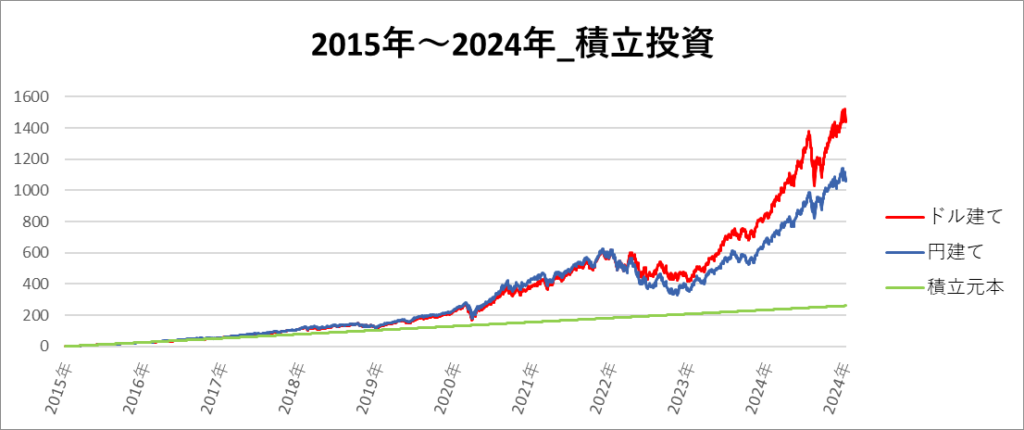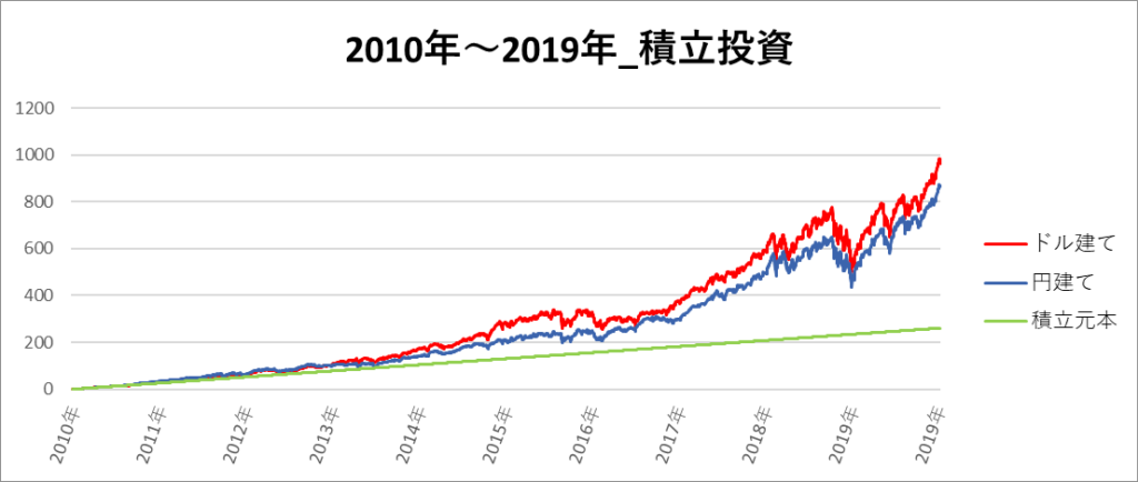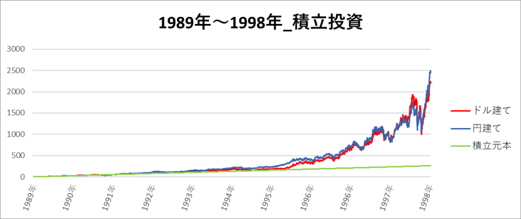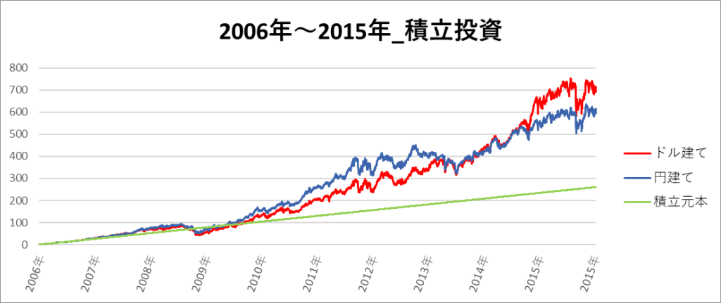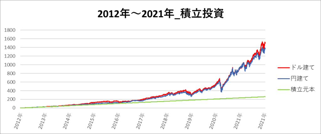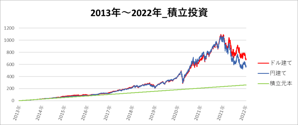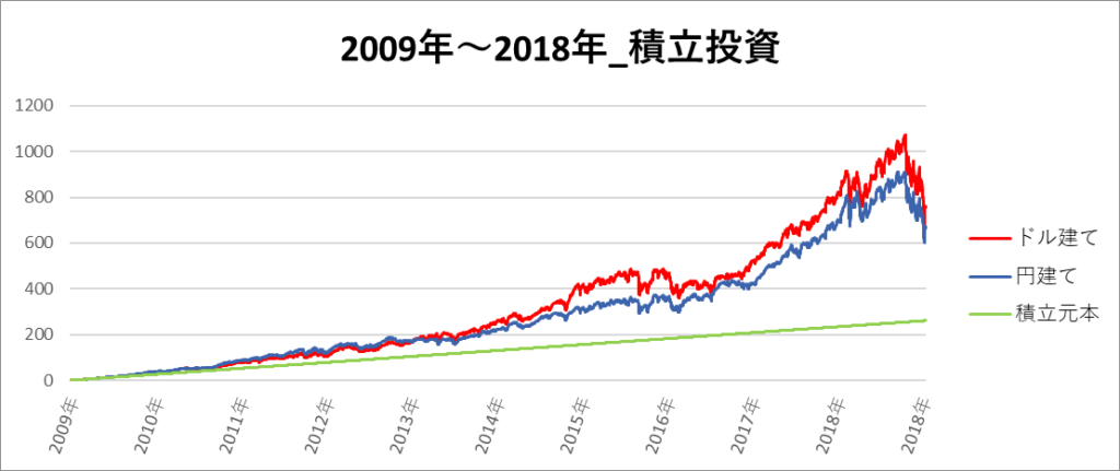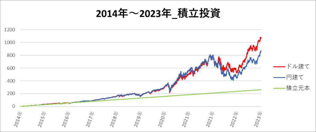 円建てとドル建ての2パターンを比較できるようにグラフに表記しているので、見比べて見てください。