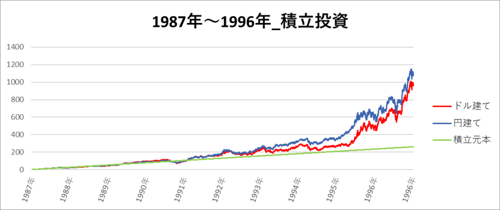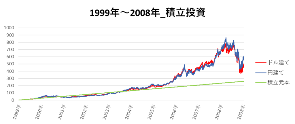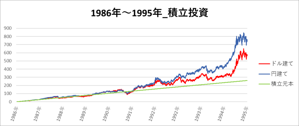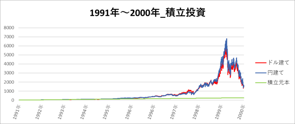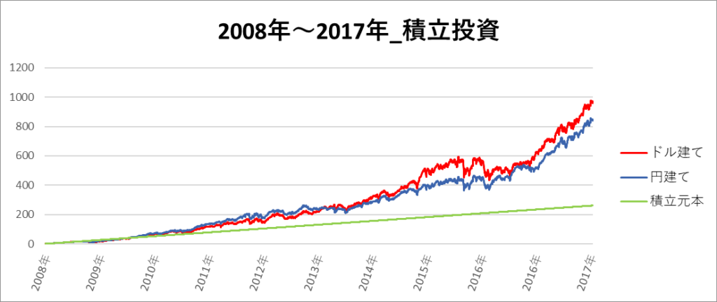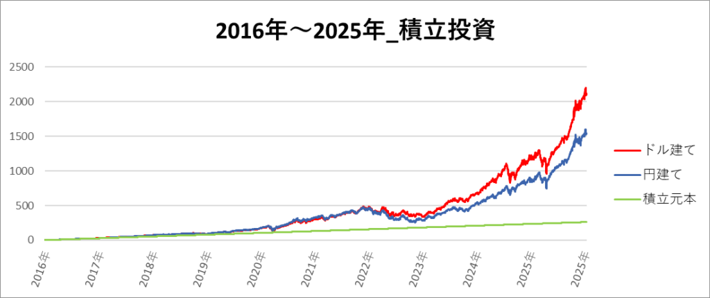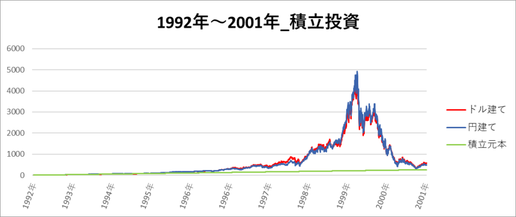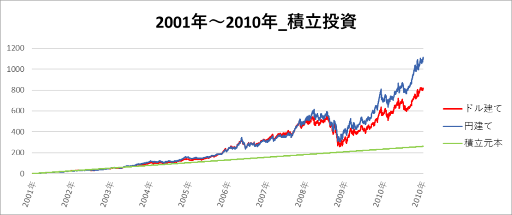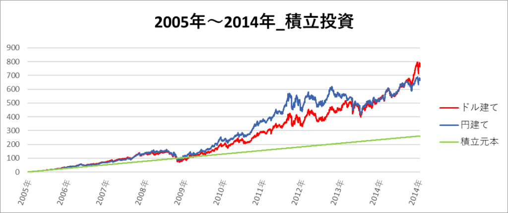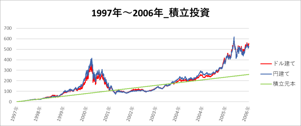 円建てとドル建ての2パターンを比較できるようにグラフに表記しているので、見比べて見てください。