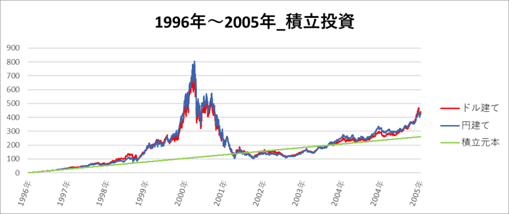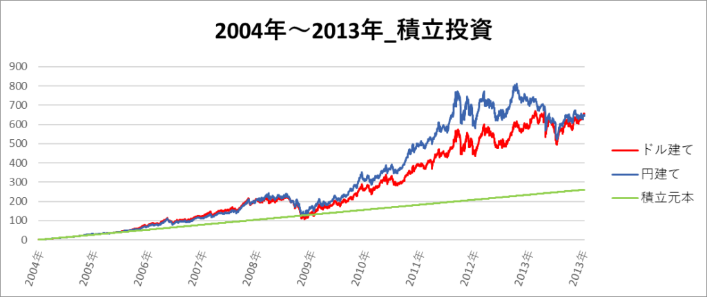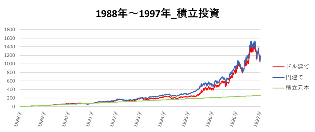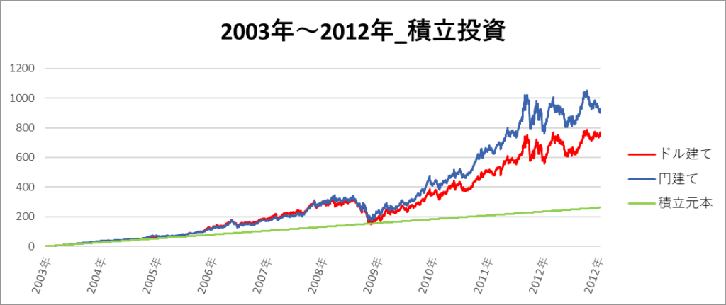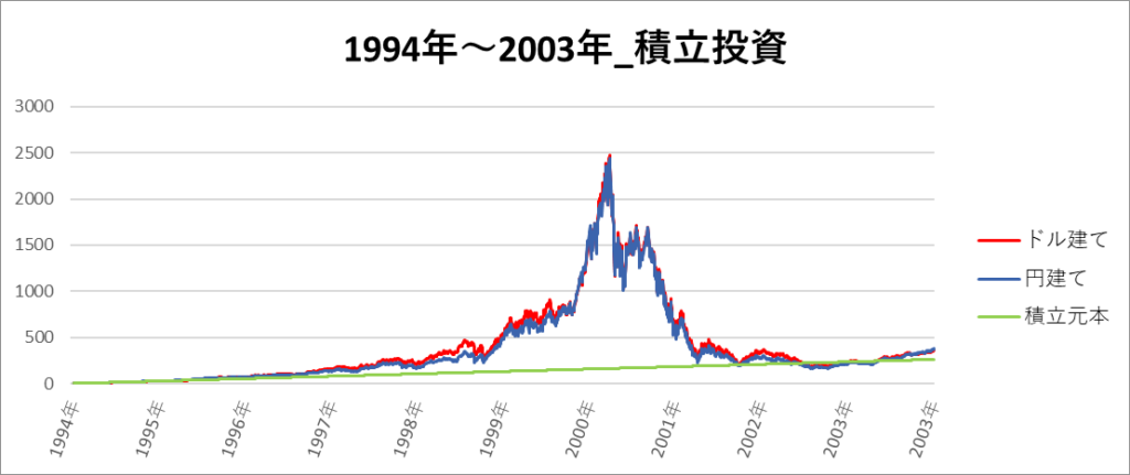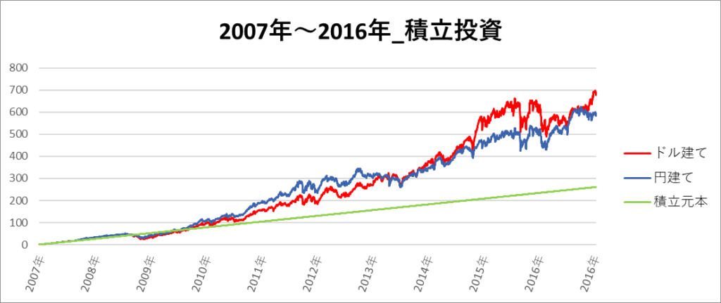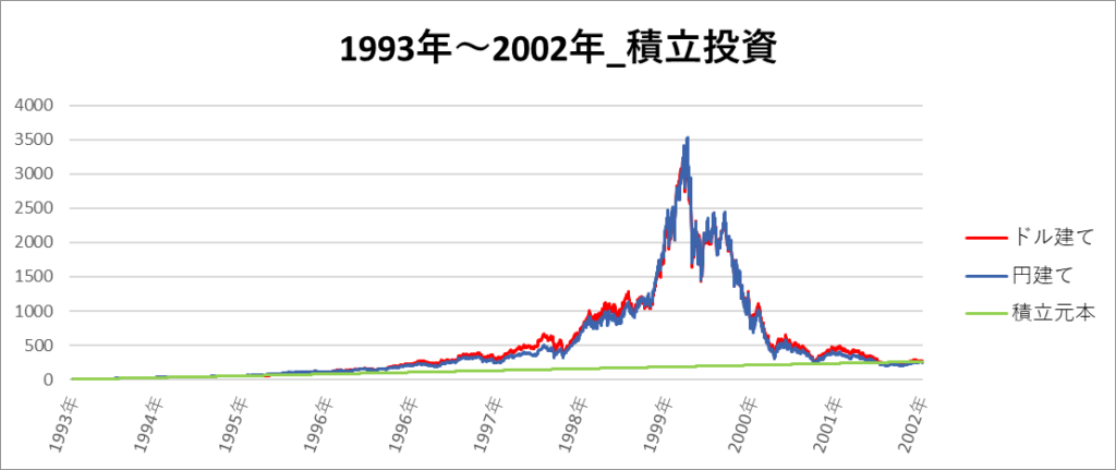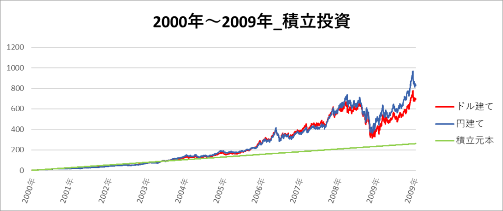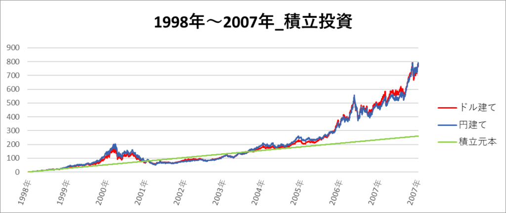 円建てとドル建ての2パターンを比較できるようにグラフに表記しているので、見比べて見てください。