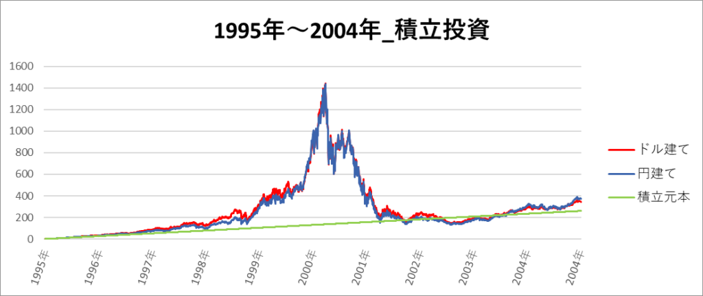 最終的にプラスリターンになる期間でも、実際の資産推移を見てみると大きな下落や、元本割れが発生していることが分かりましたね。