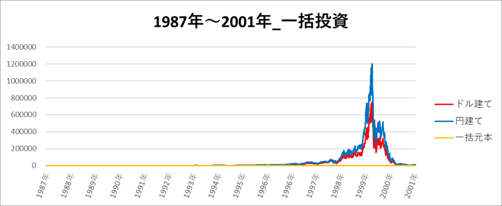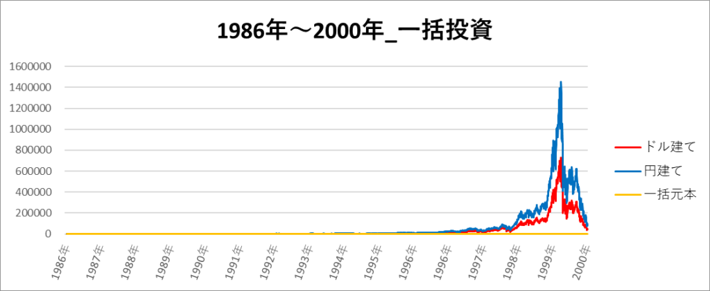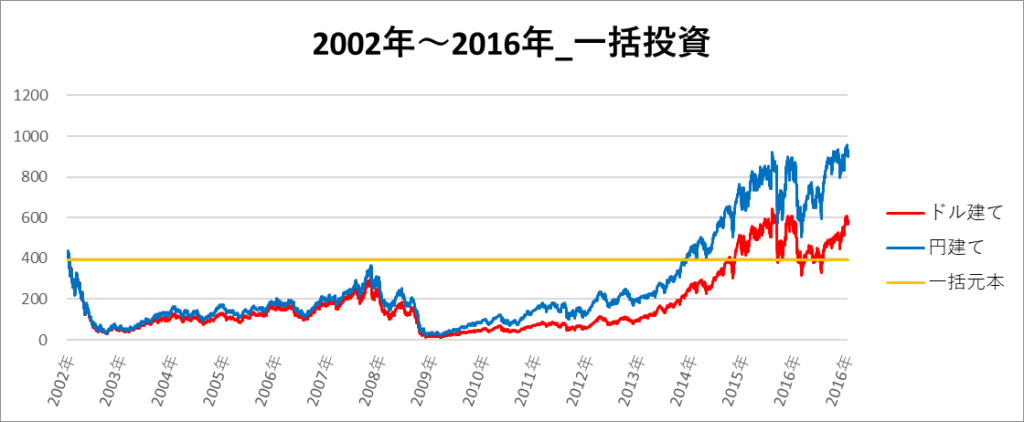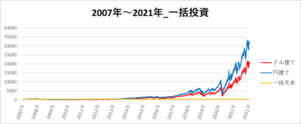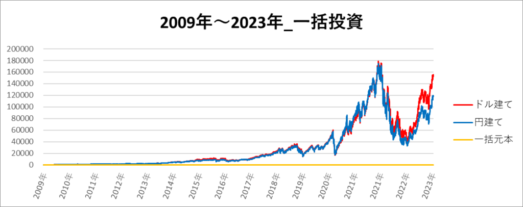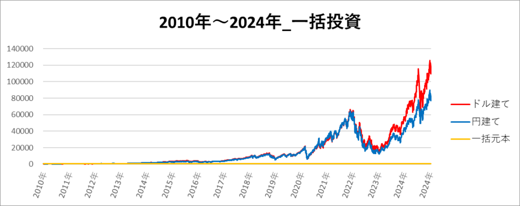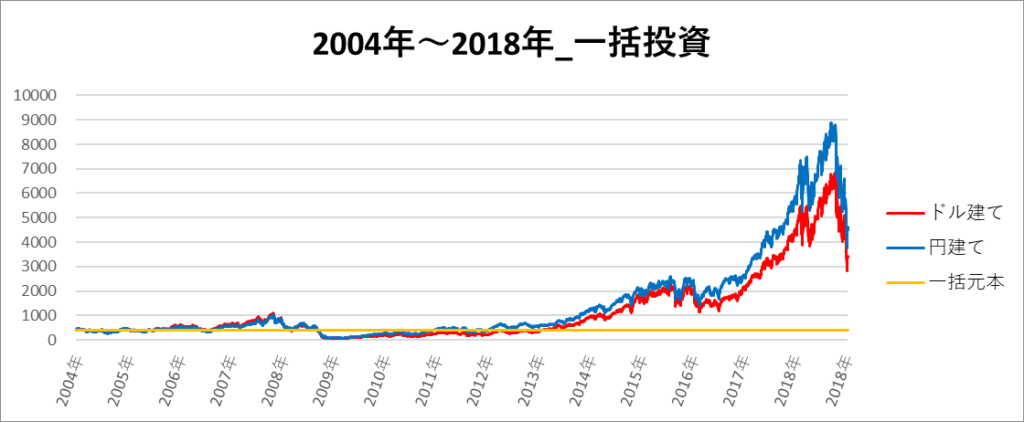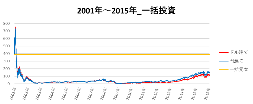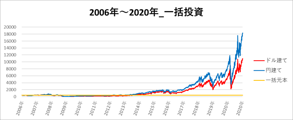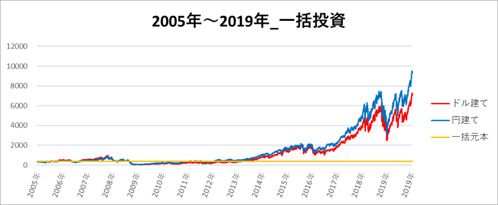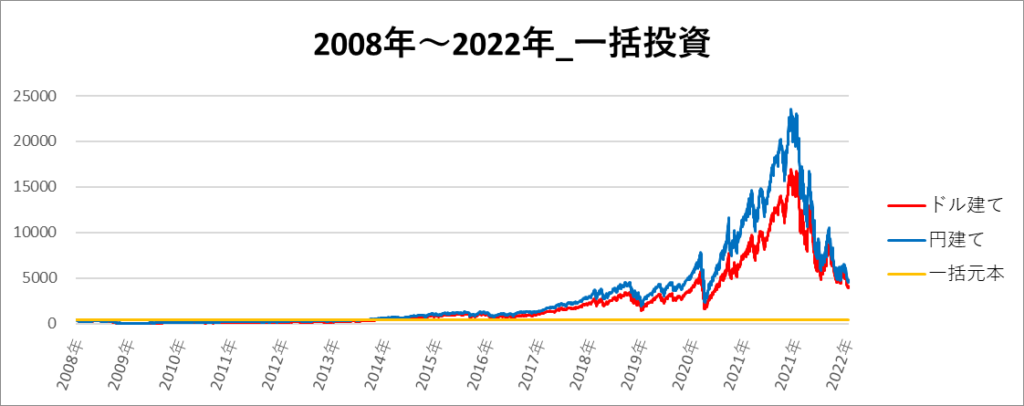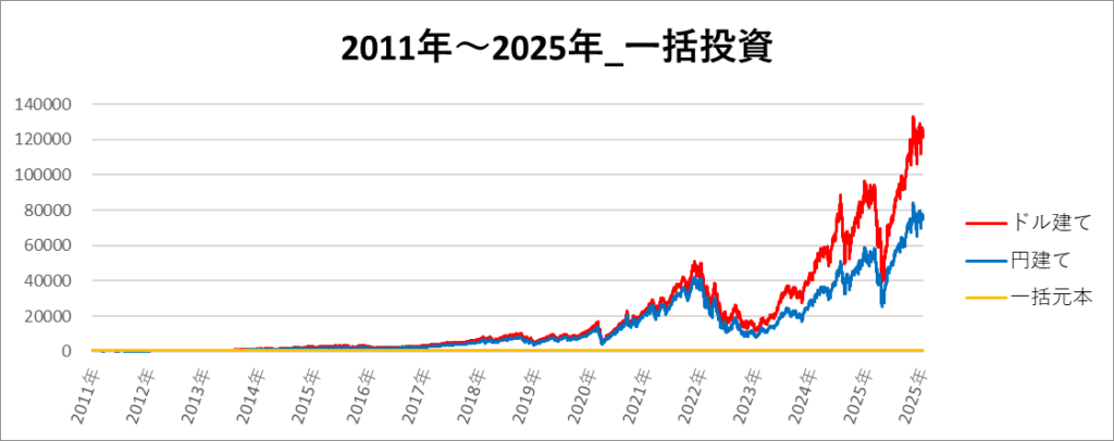 円建てとドル建ての2パターンを比較できるようにグラフに表記しているので、見比べて見てください。