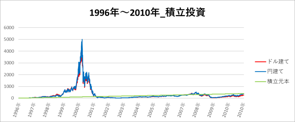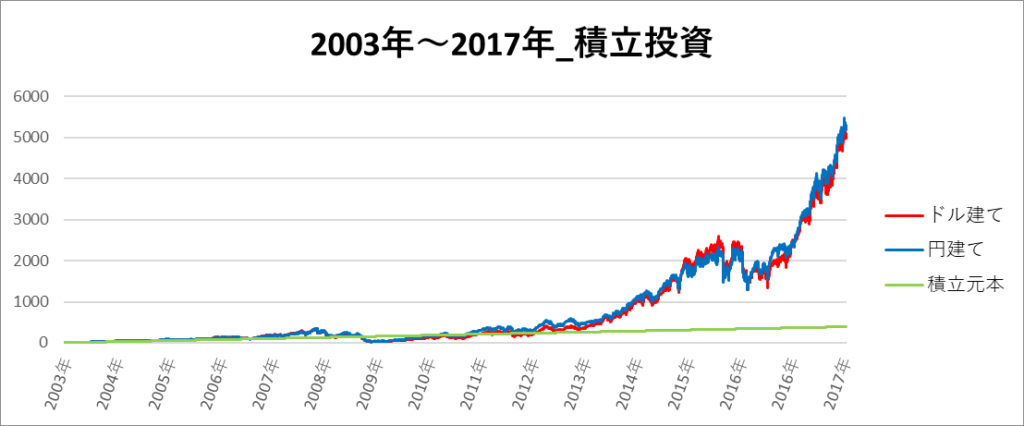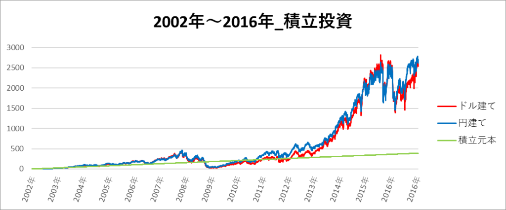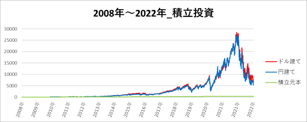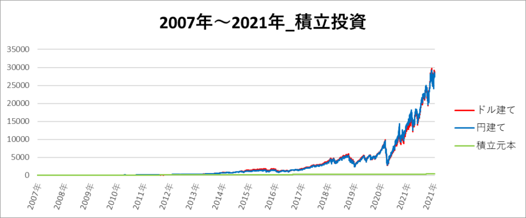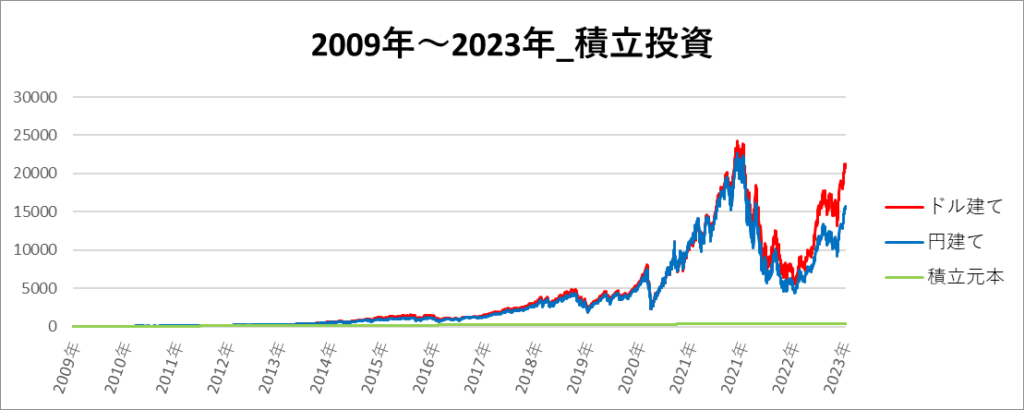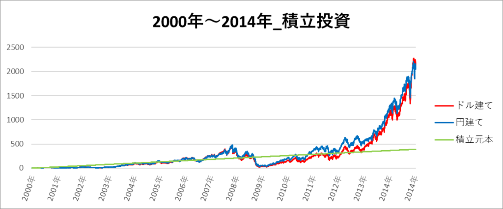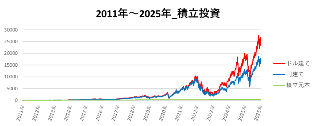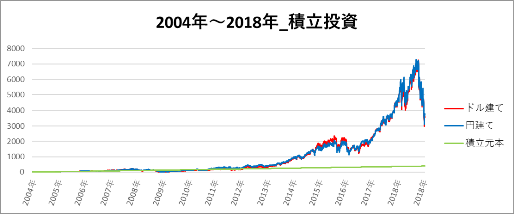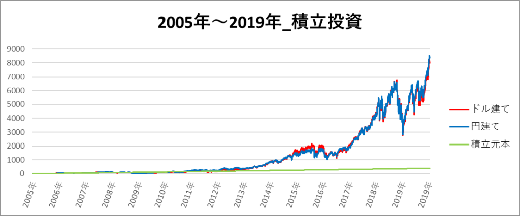 円建てとドル建ての2パターンを比較できるようにグラフに表記しているので、見比べて見てください。