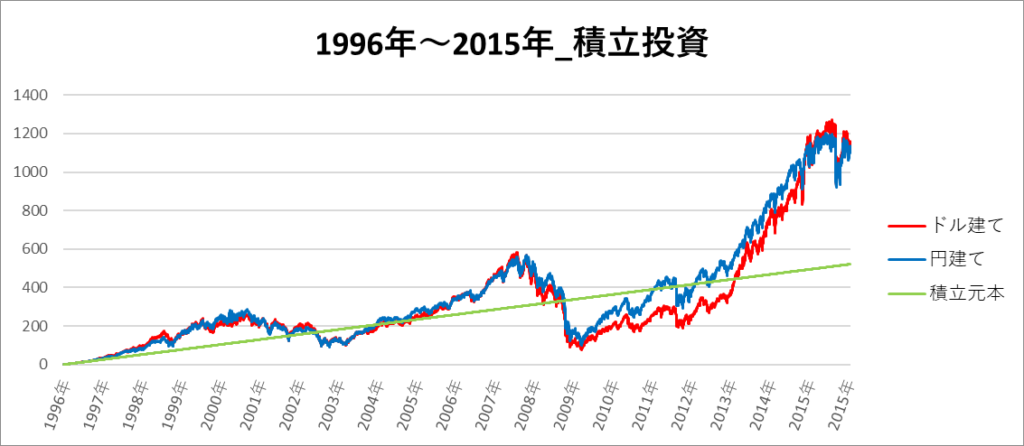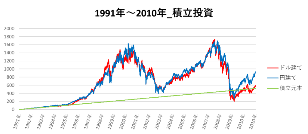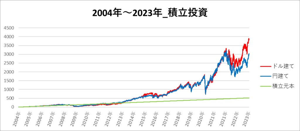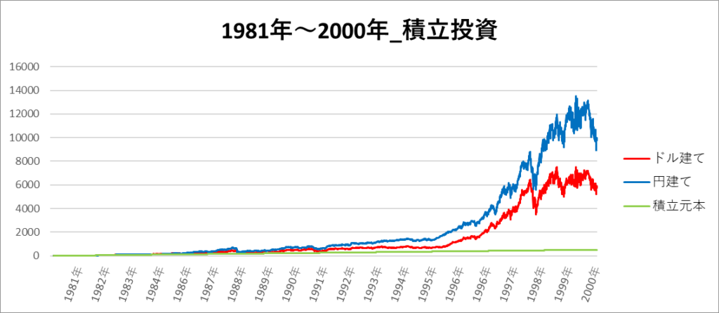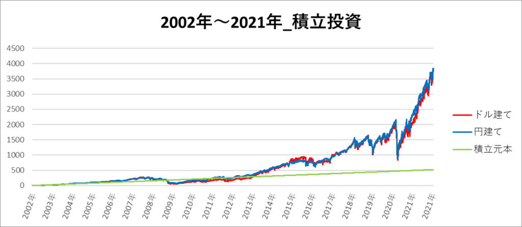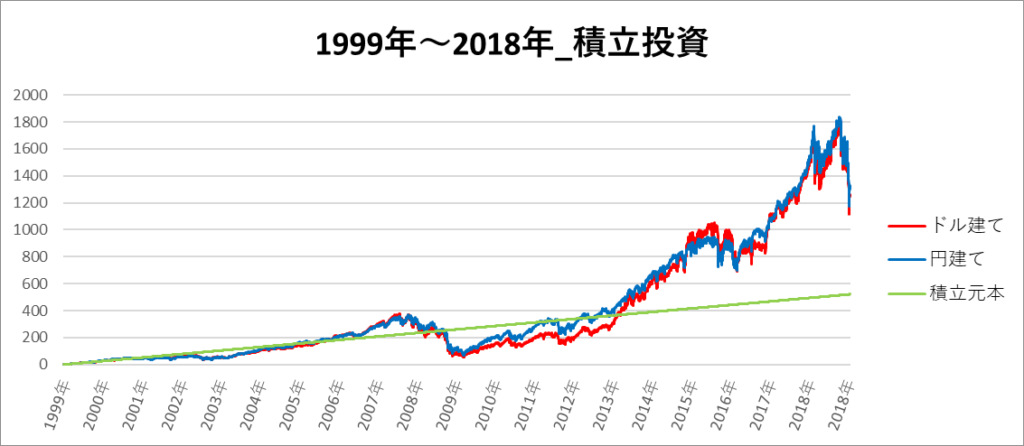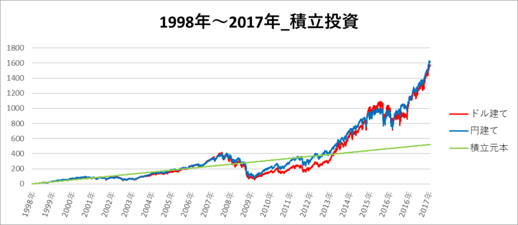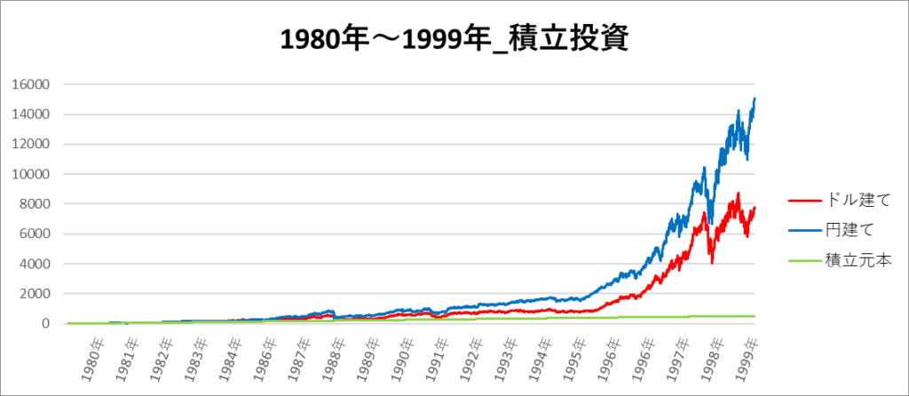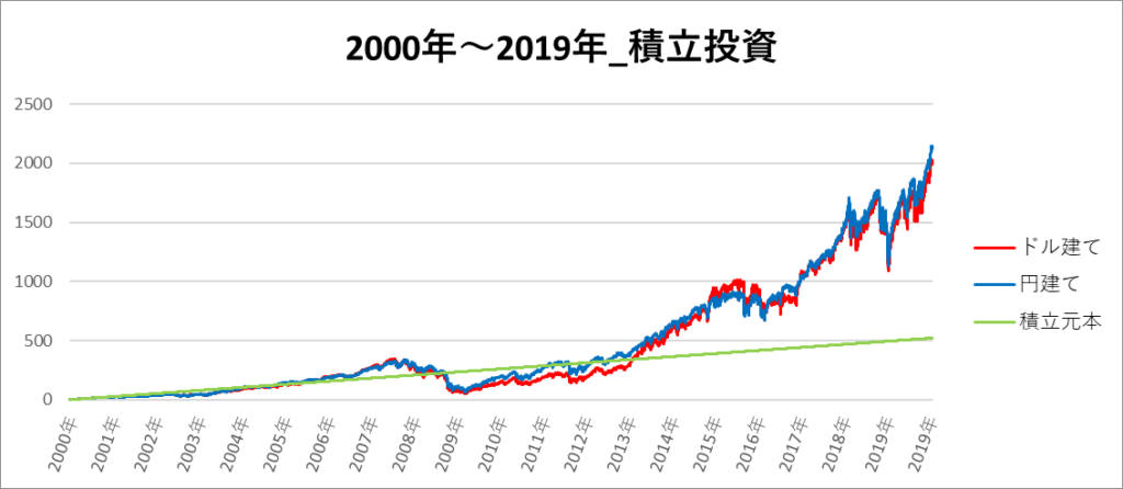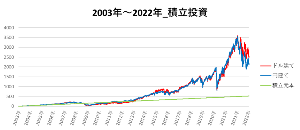 円建てとドル建ての2パターンを比較できるようにグラフに表記しているので、見比べて見てください。