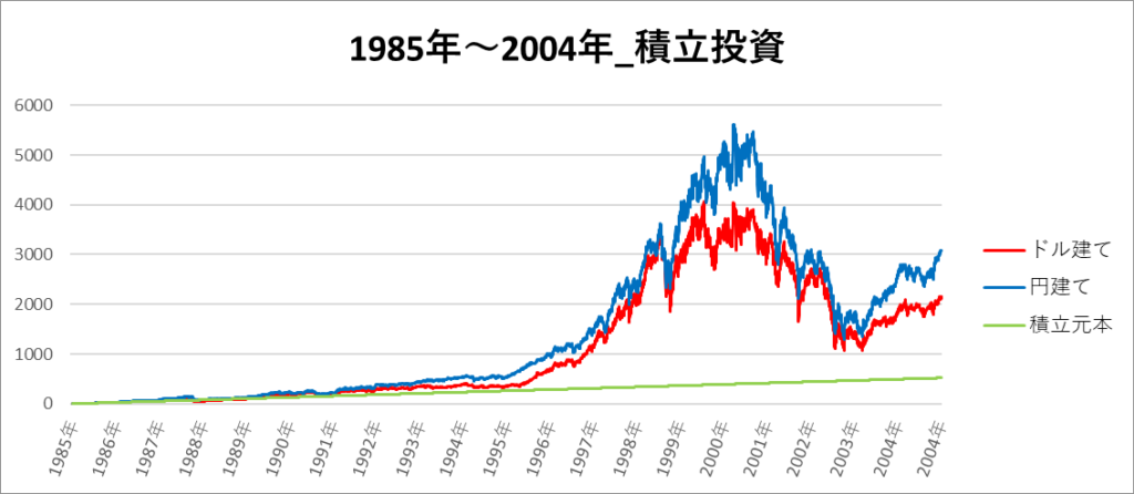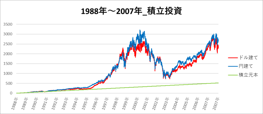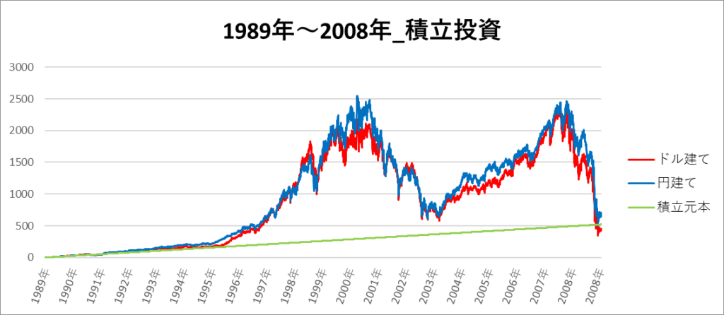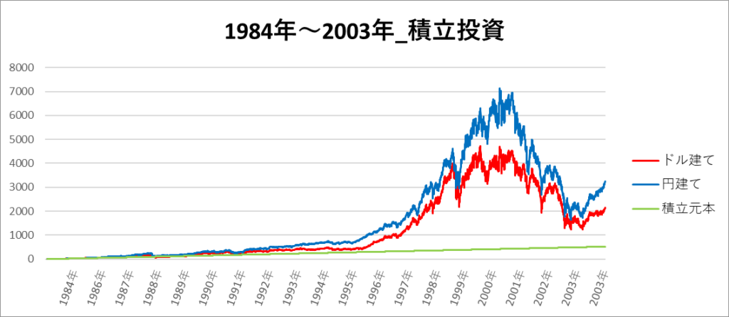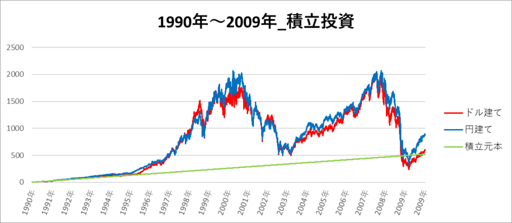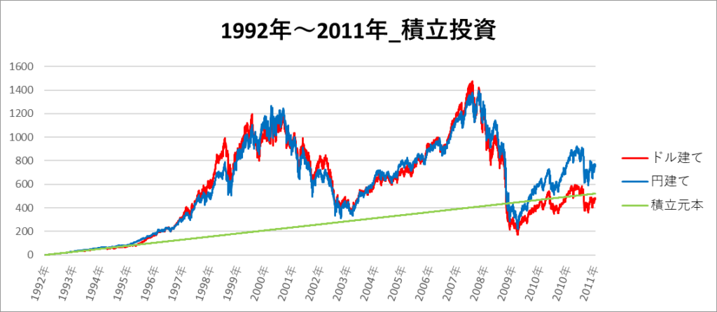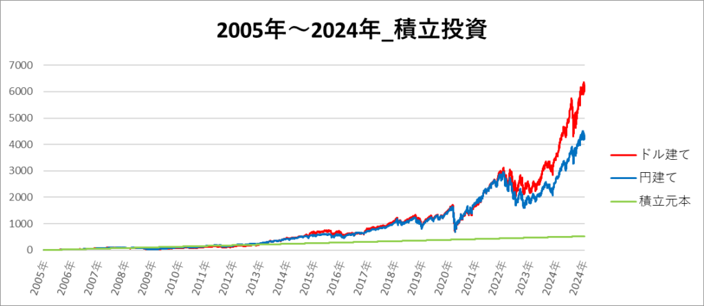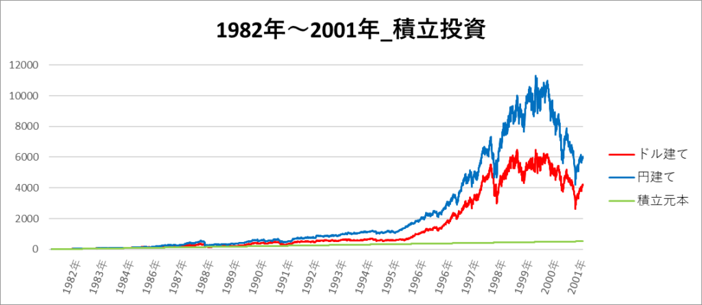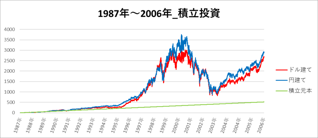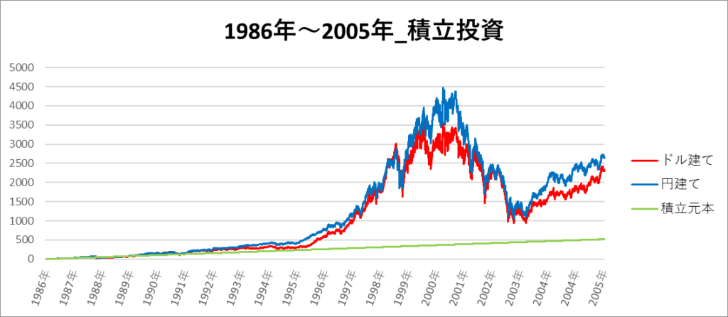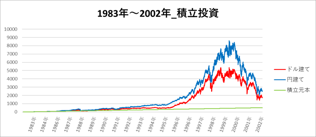 円建てとドル建ての2パターンを比較できるようにグラフに表記しているので、見比べて見てください。