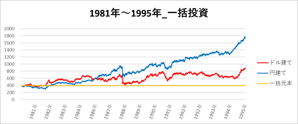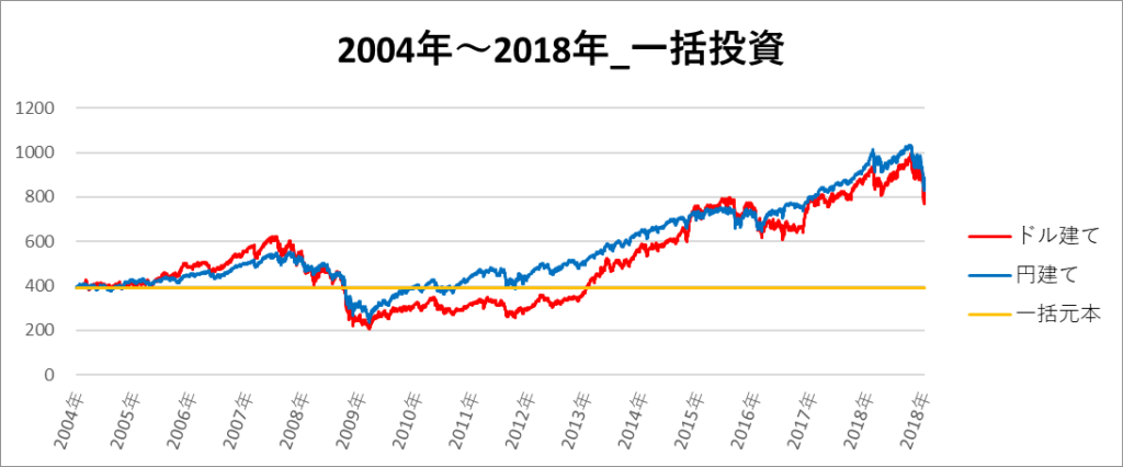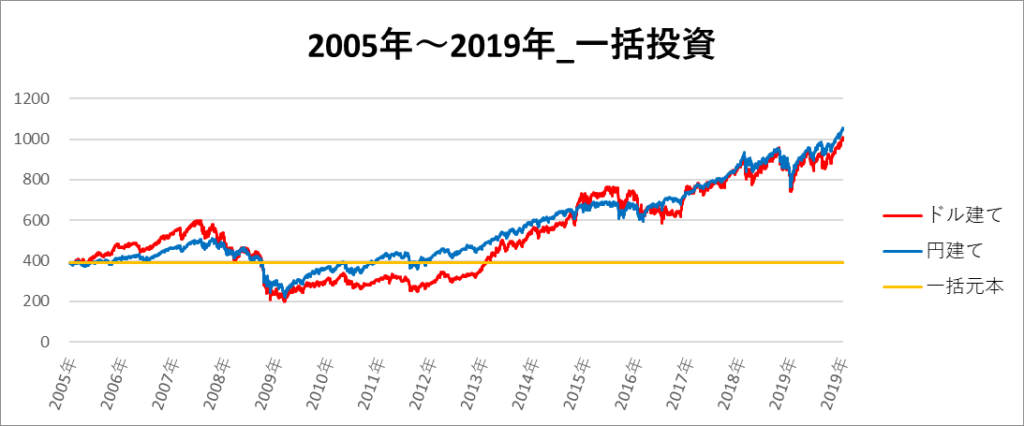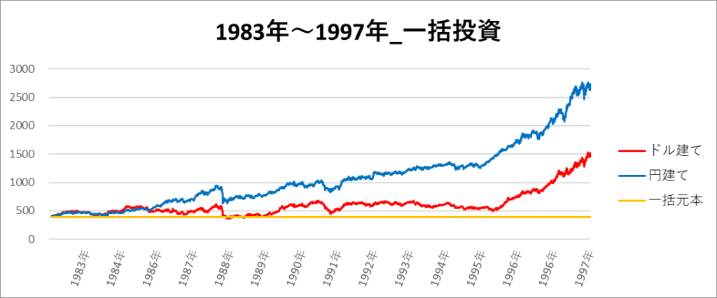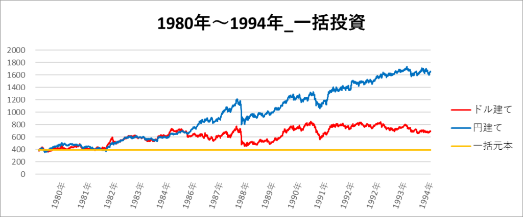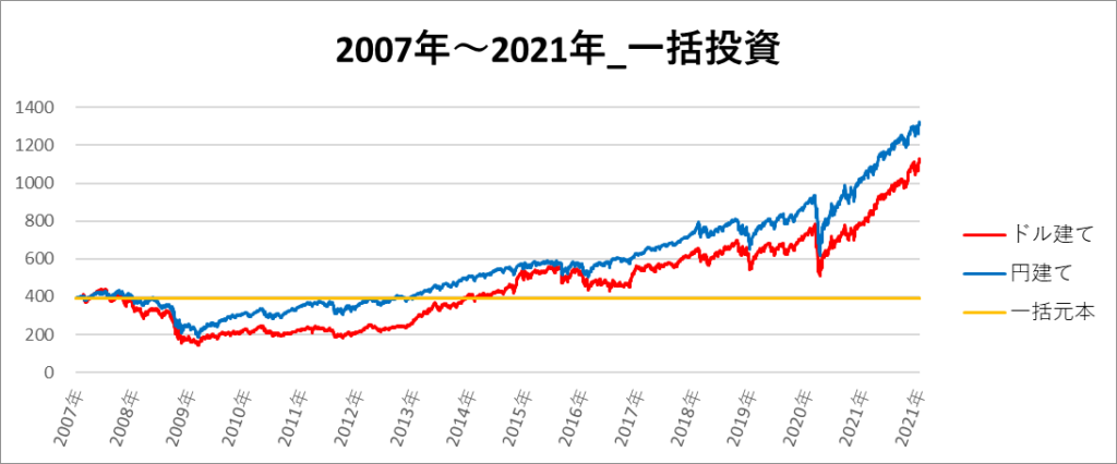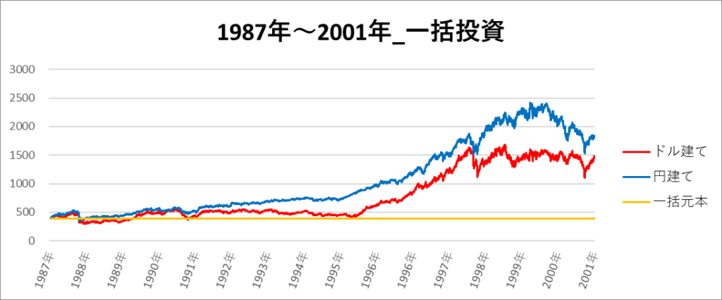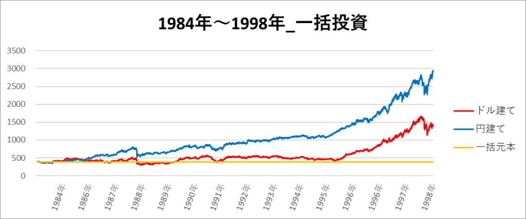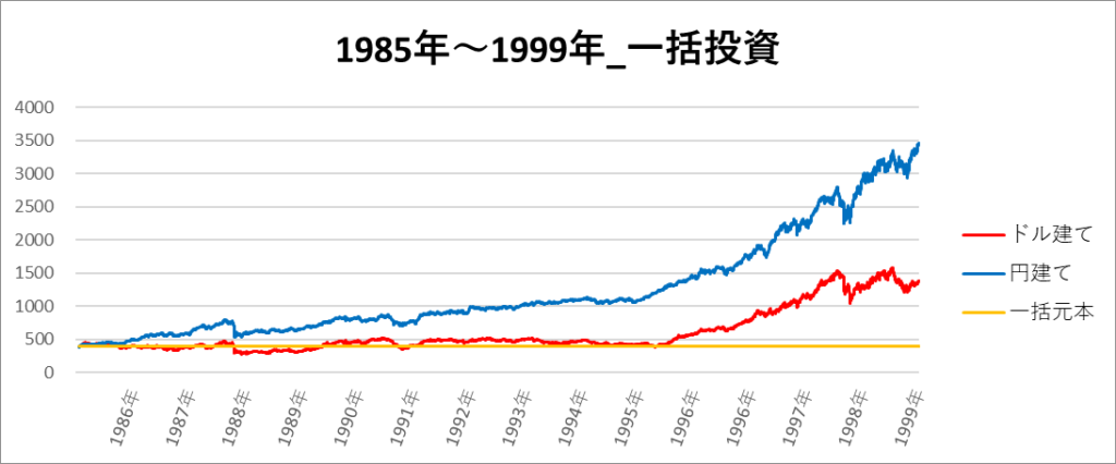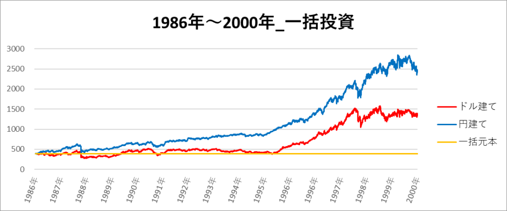 円建てとドル建ての2パターンを比較できるようにグラフに表記しているので、見比べて見てください。