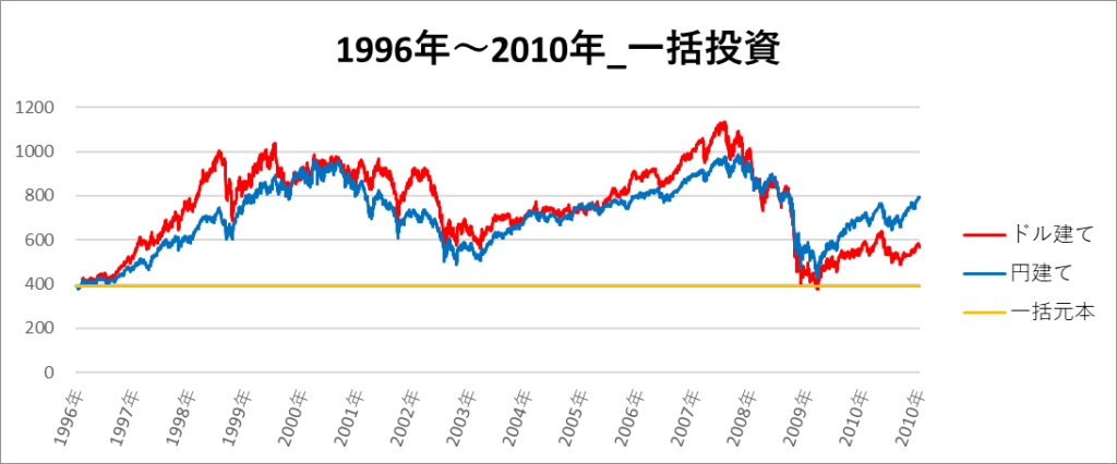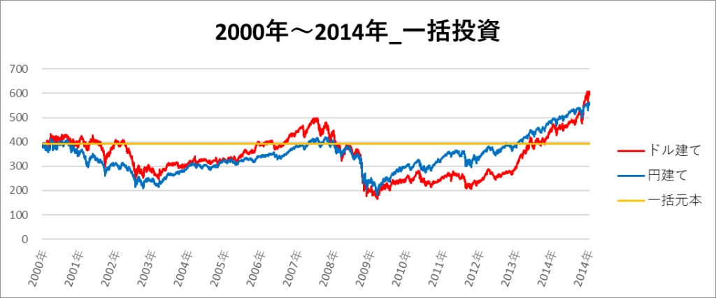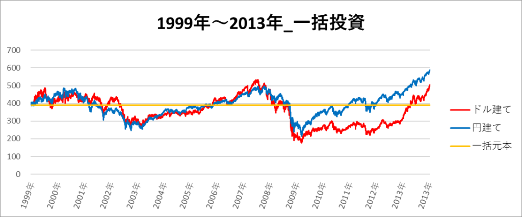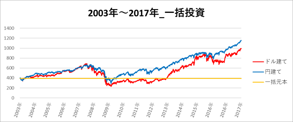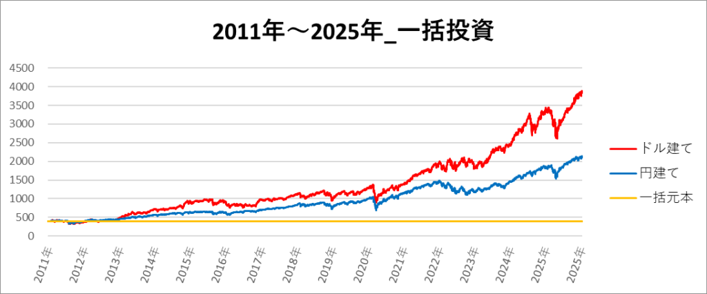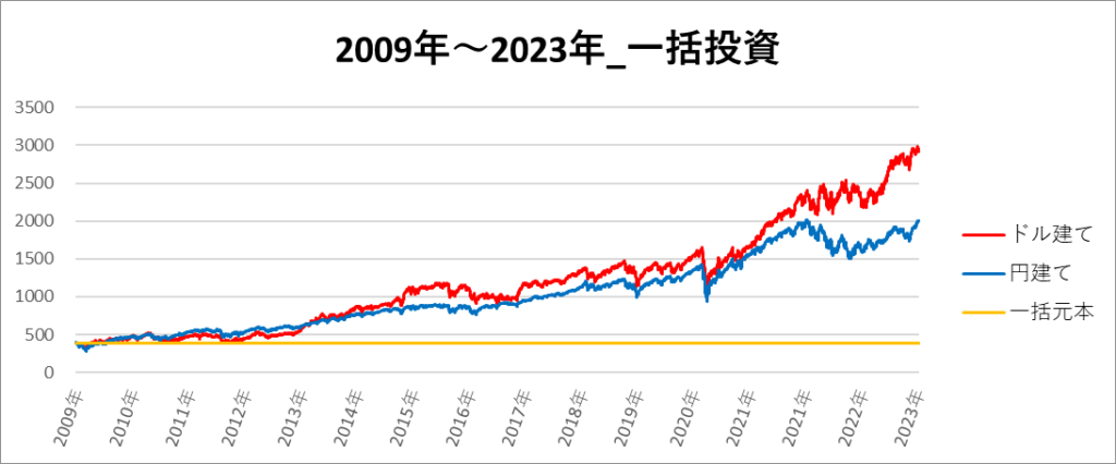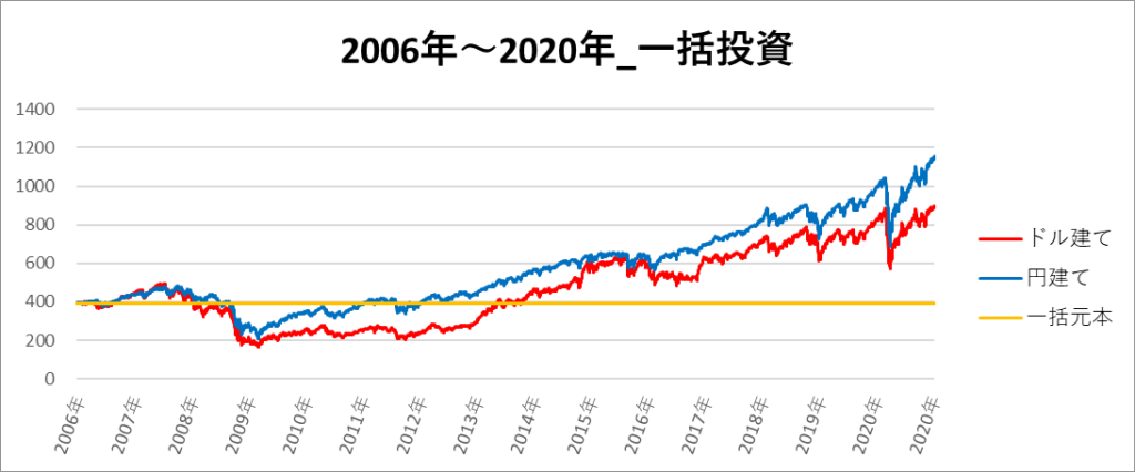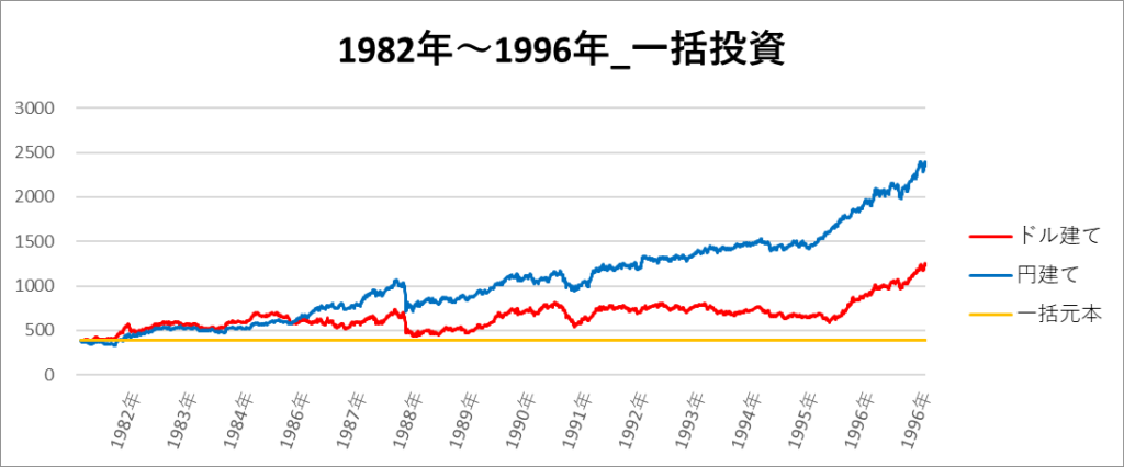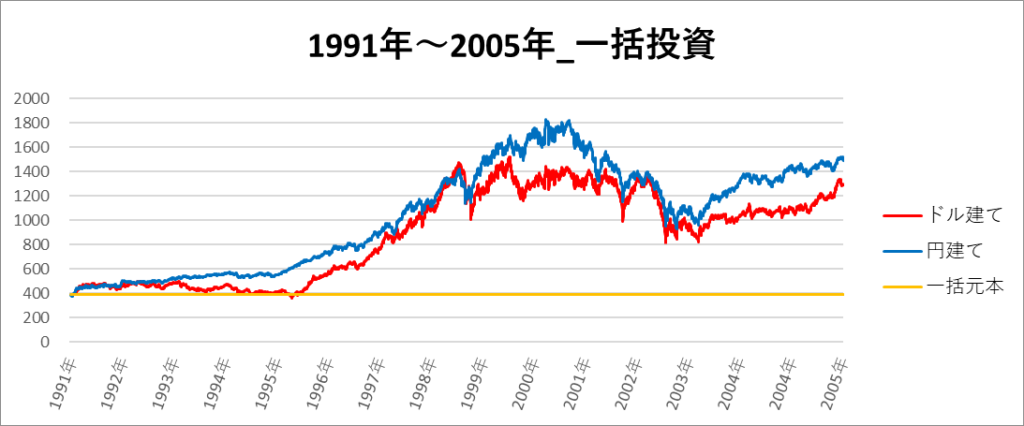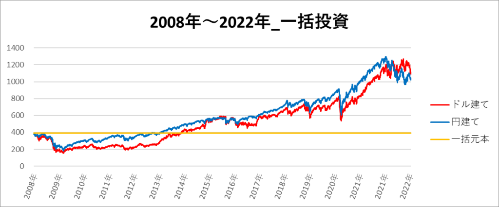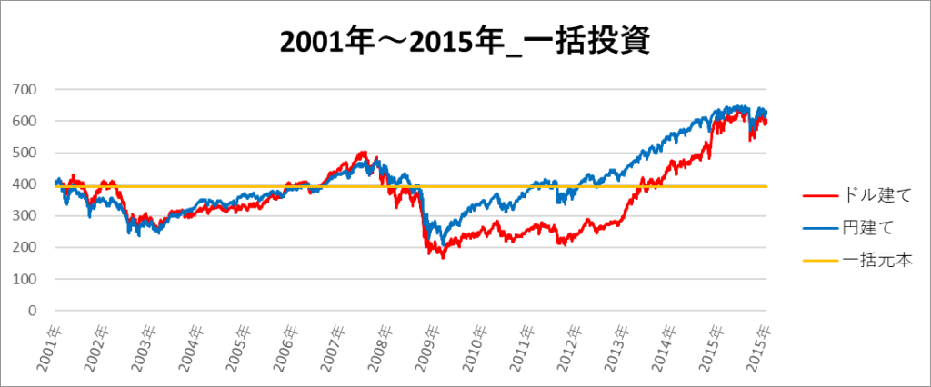 円建てとドル建ての2パターンを比較できるようにグラフに表記しているので、見比べて見てください。