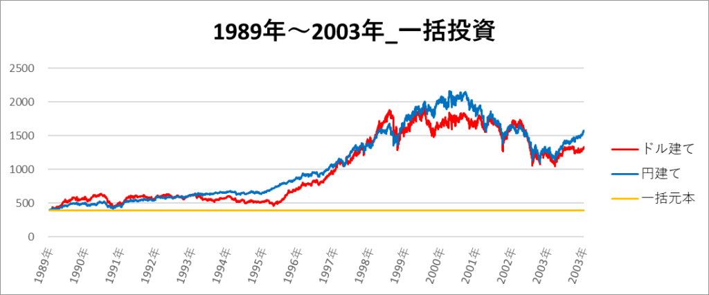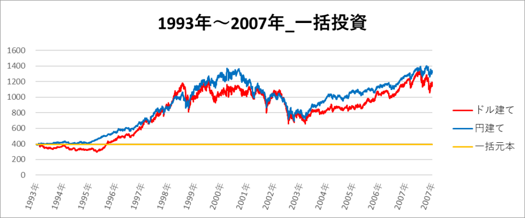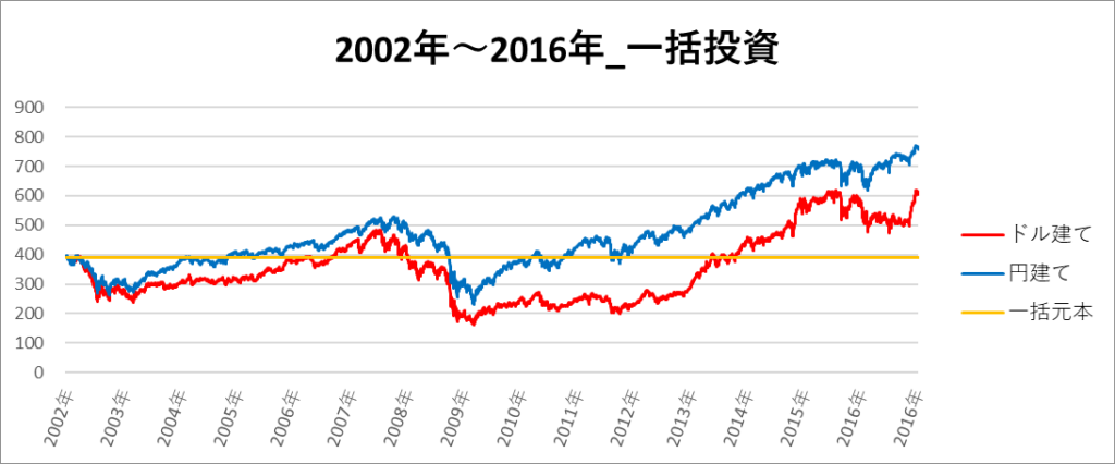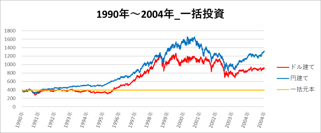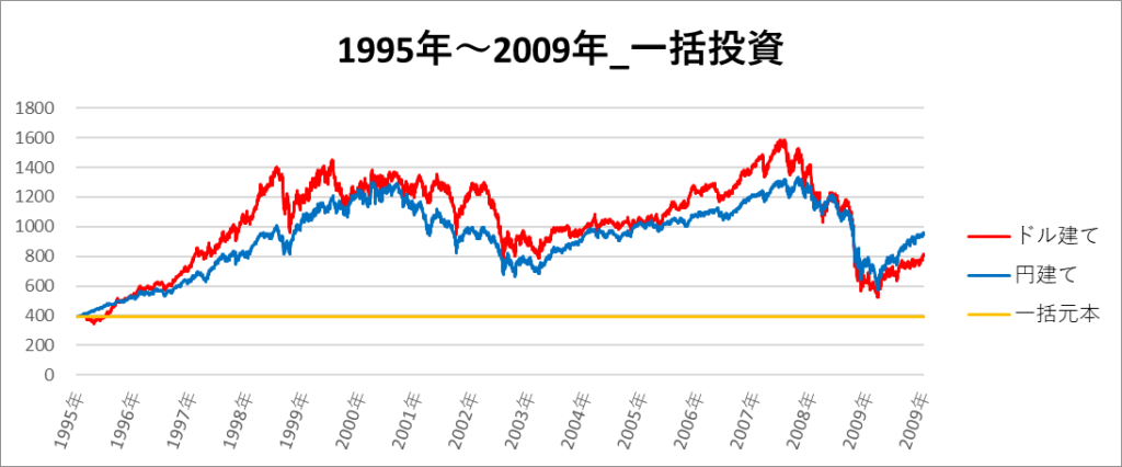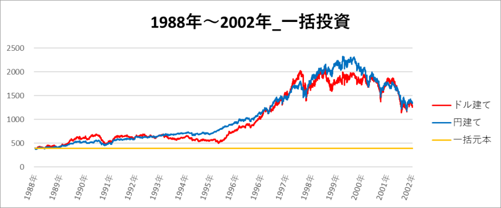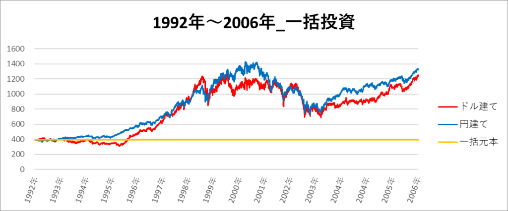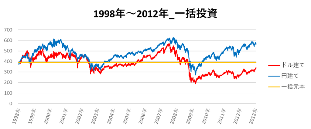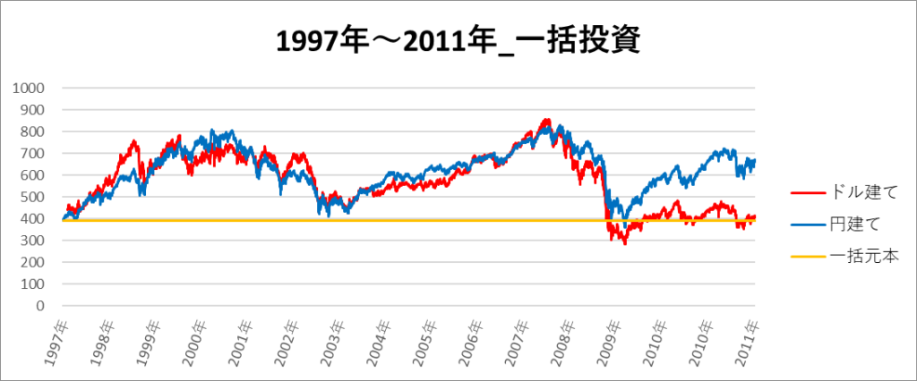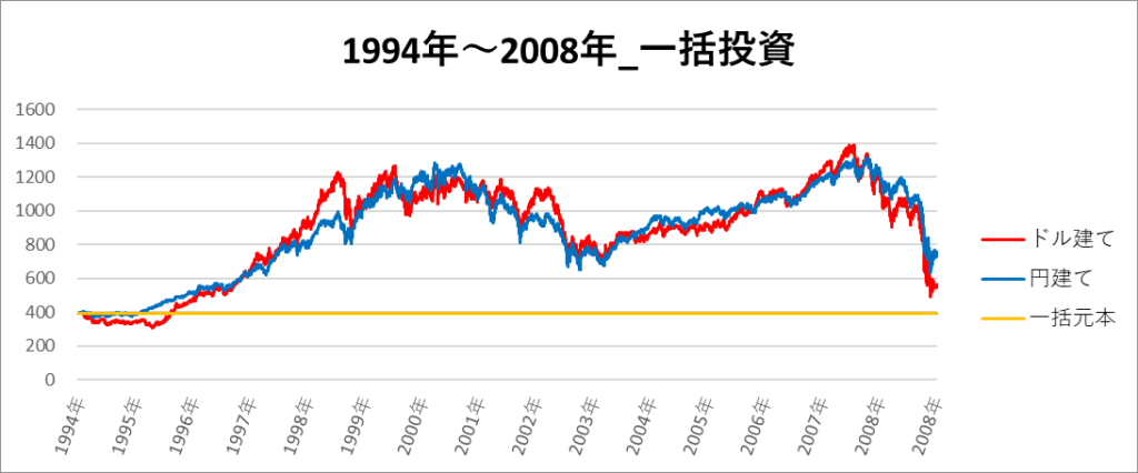 円建てとドル建ての2パターンを比較できるようにグラフに表記しているので、見比べて見てください。