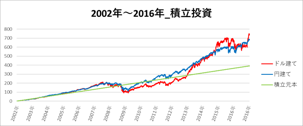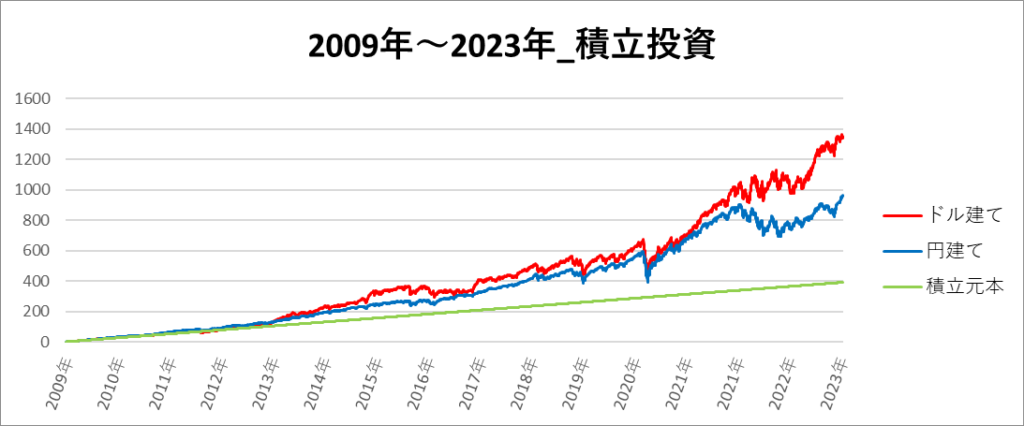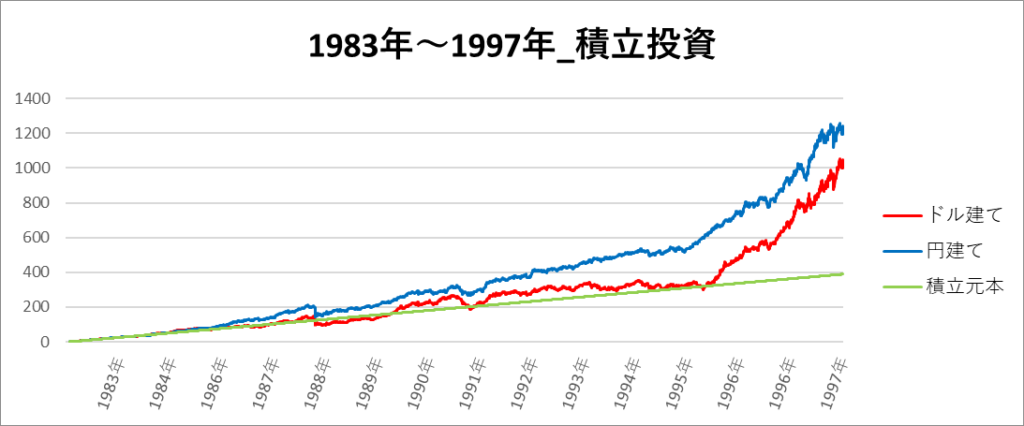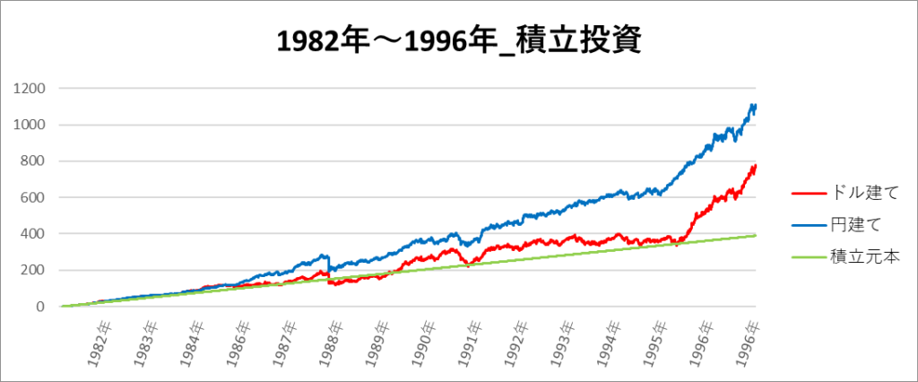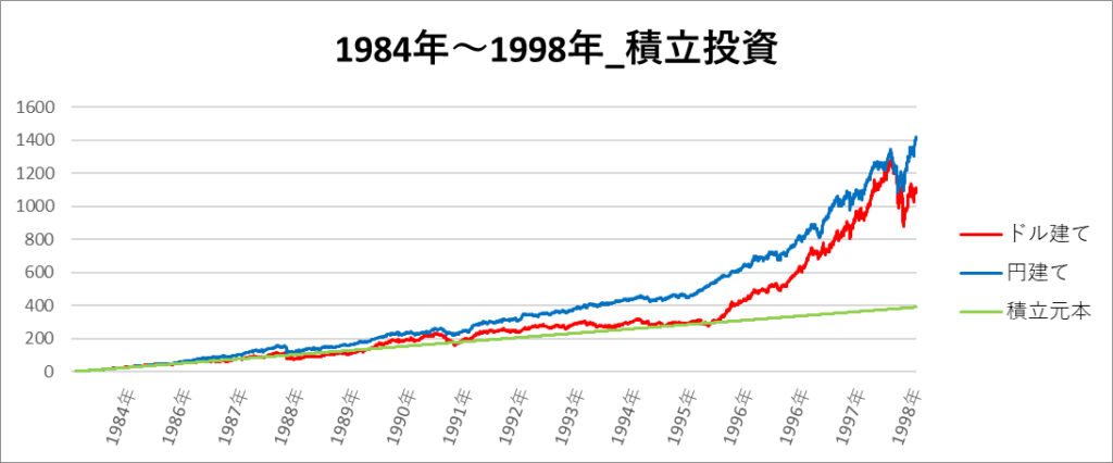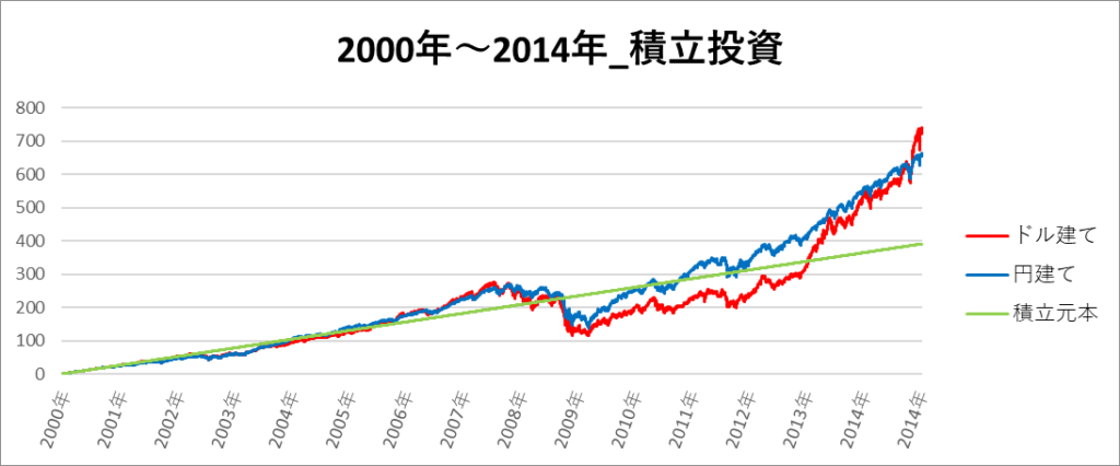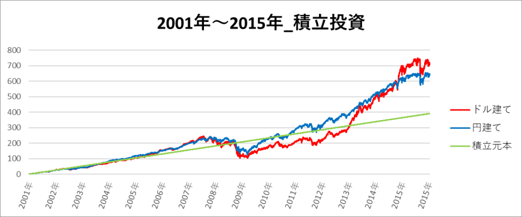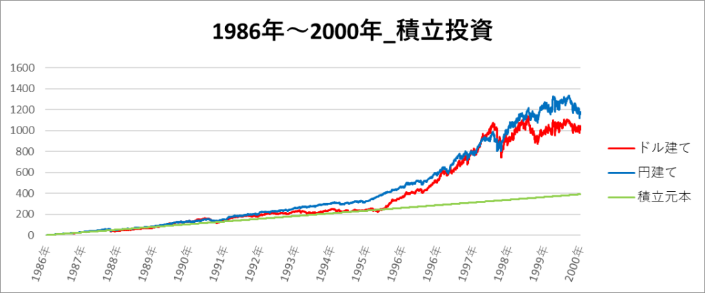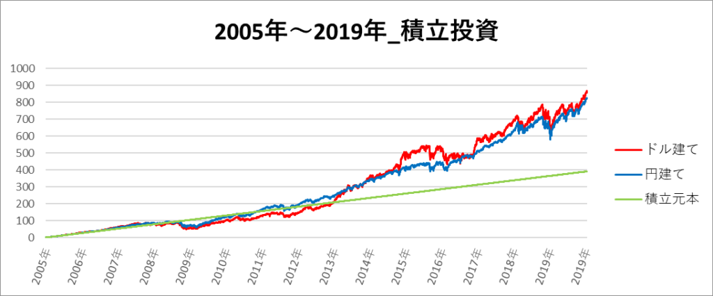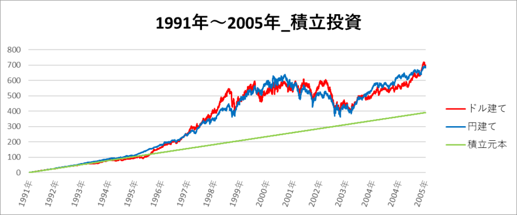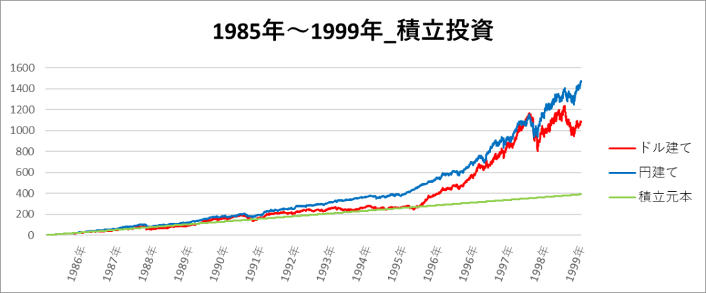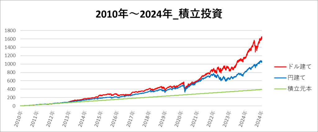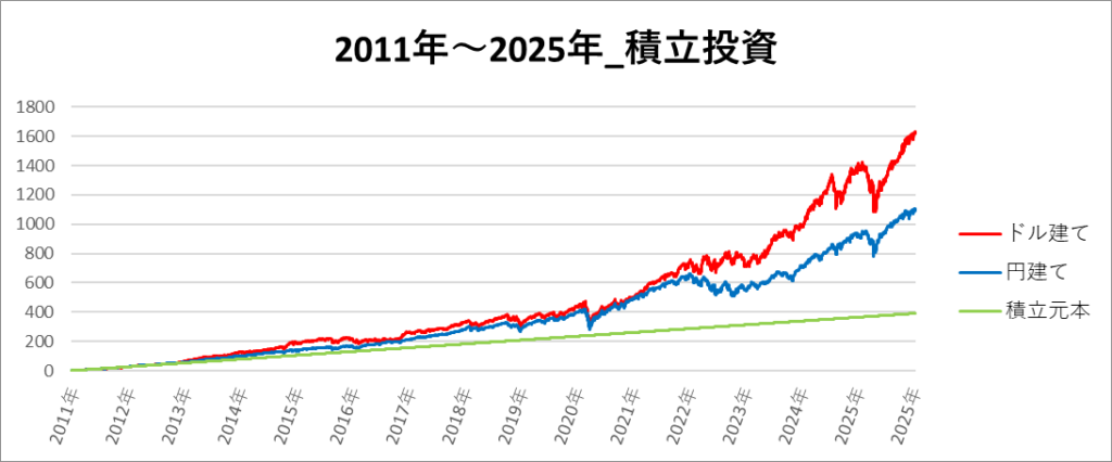 円建てとドル建ての2パターンを比較できるようにグラフに表記しているので、見比べて見てください。