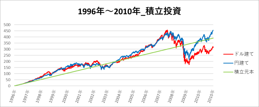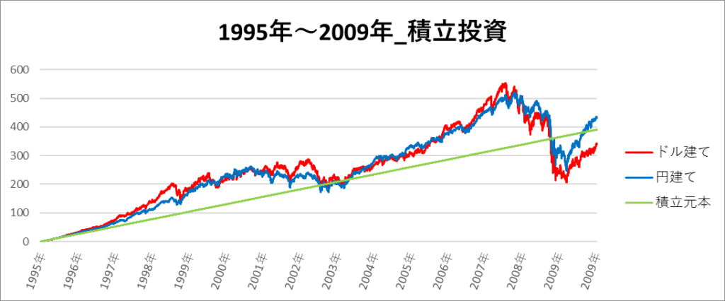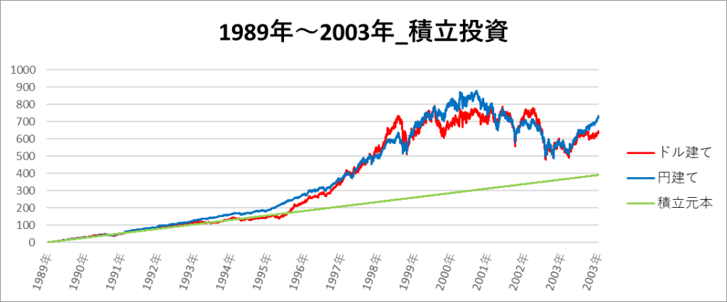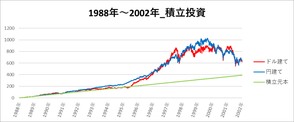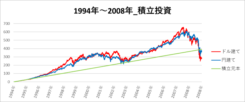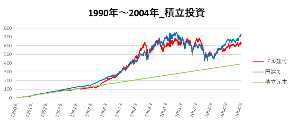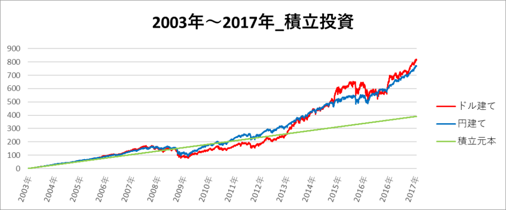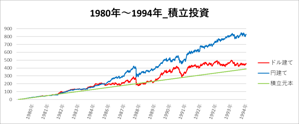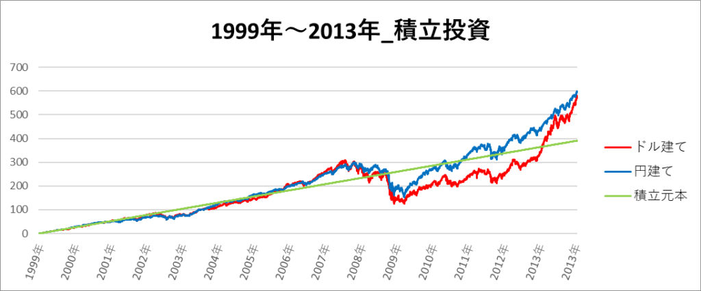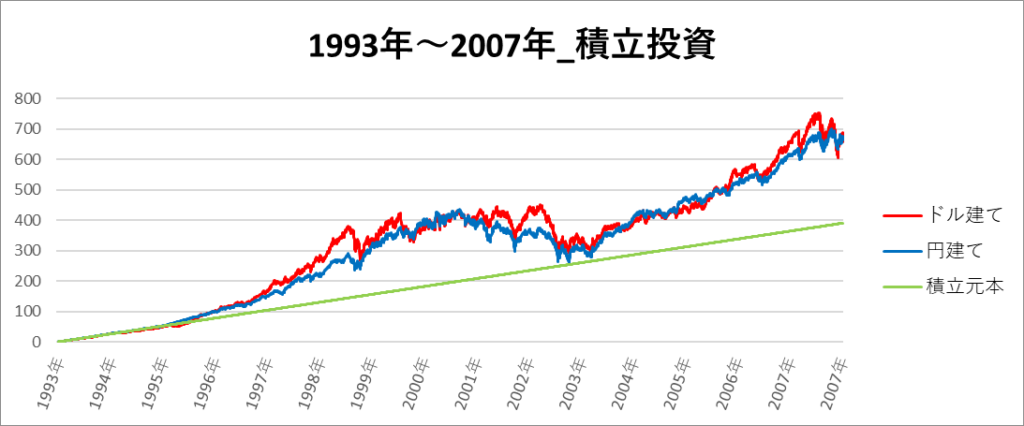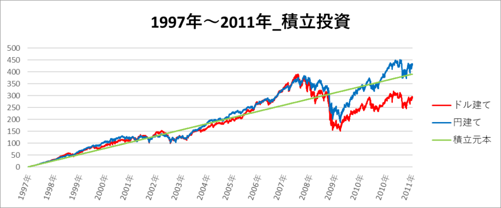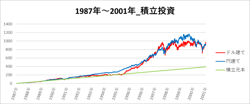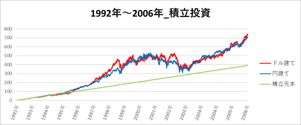 円建てとドル建ての2パターンを比較できるようにグラフに表記しているので、見比べて見てください。